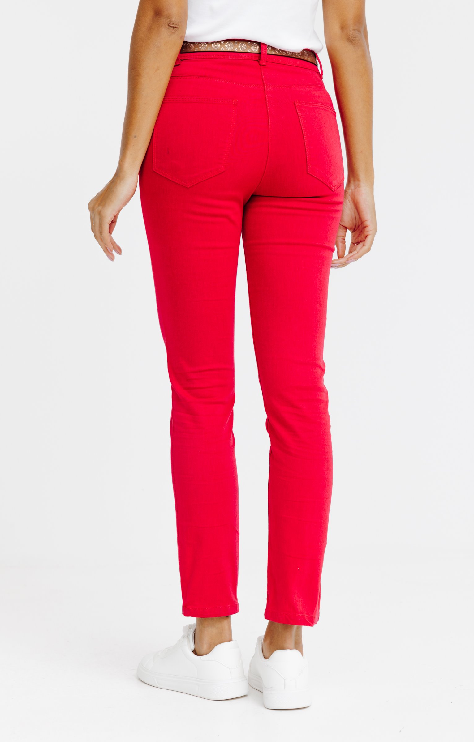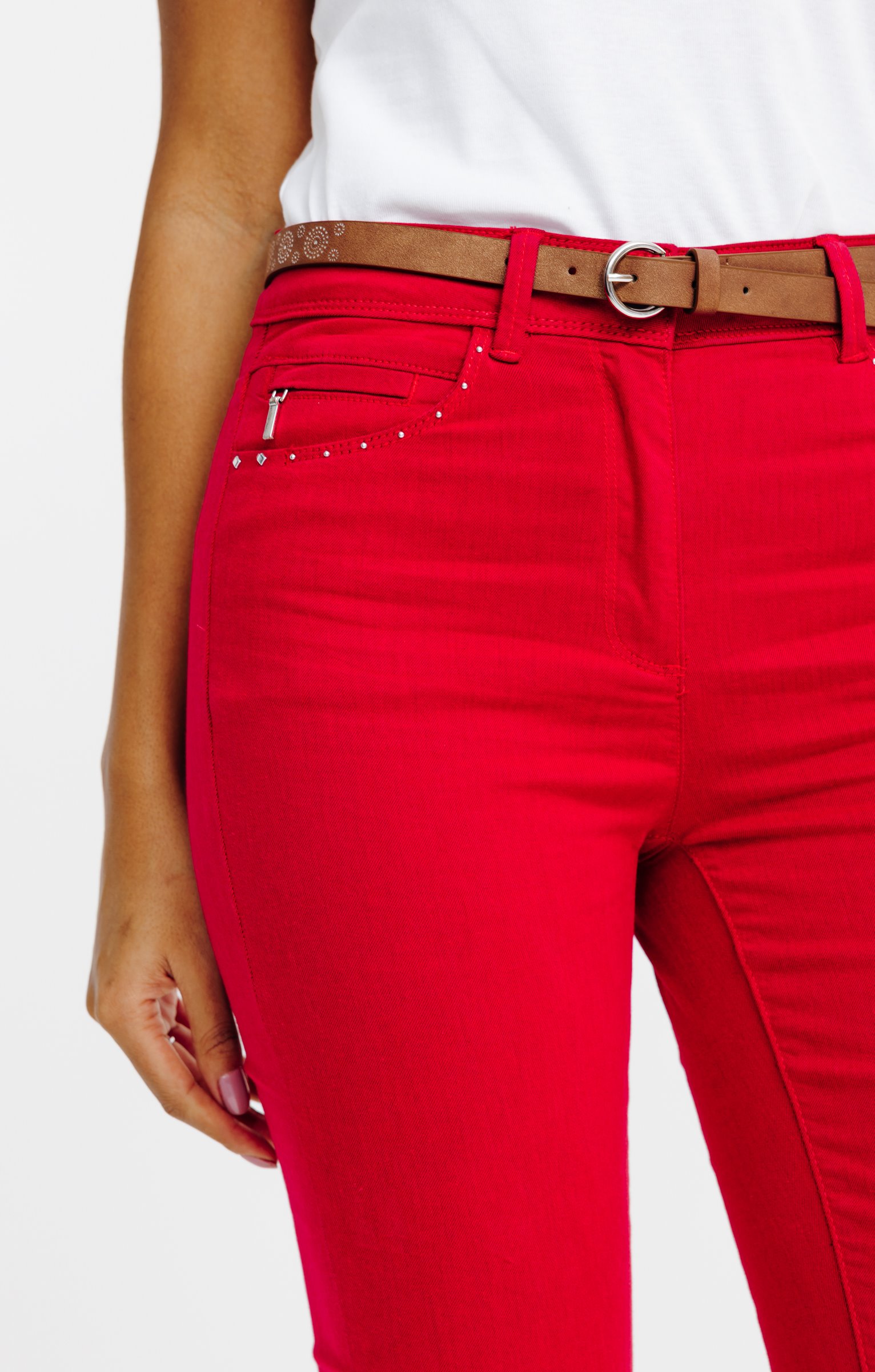 Pantalon slim en denim. Coupe ajustée avec longueur cheville. Fermeture par zip et bouton. 2 poches italiennes à l'avant et 2 poches plaquées au dos. Détails de surpiqûres sur les poches avant. Ceinture tressée en polyuréthane.