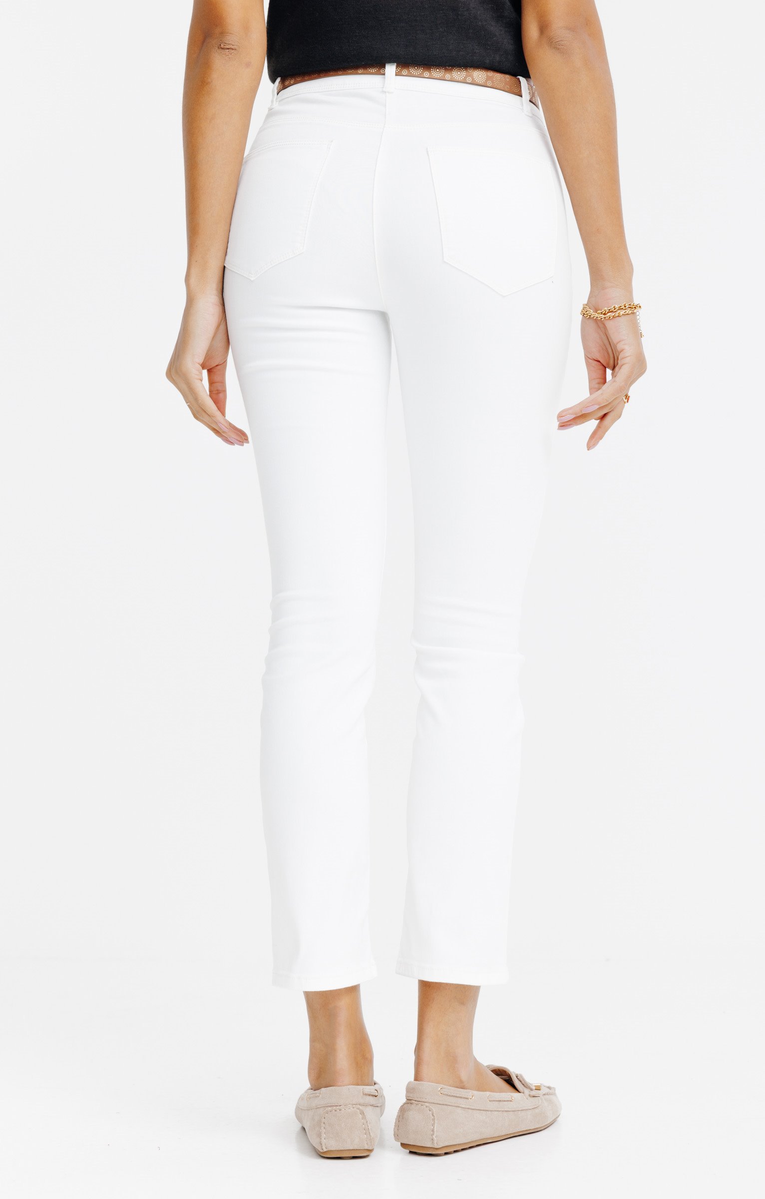 Pantalon slim en denim. Coupe ajustée avec longueur cheville. Fermeture par zip et bouton. 2 poches italiennes à l'avant et 2 poches plaquées au dos. Détails de surpiqûres sur les poches avant. Ceinture tressée en polyuréthane.