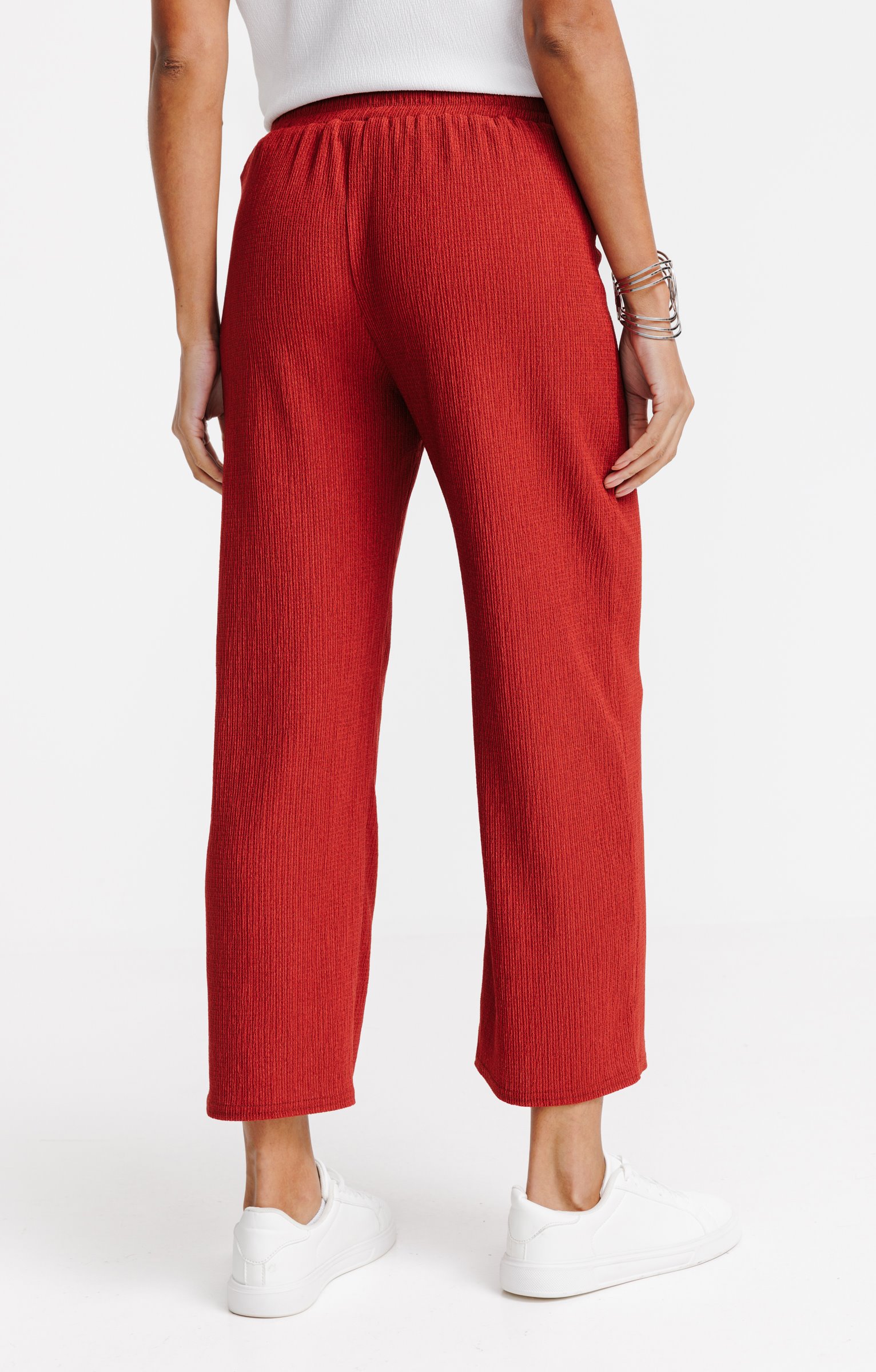 Pantalon fluide en maille unie façonnée. Coupe large. Longueur standard. 2 fausses poches passepoilées en biais devant. Teinte unie. Maille extensible avec motifs fantaisie en relief. Taille smockée au dos. Lien sous coulisse à nouer devant la taille. Embouts métalliques. Détails métalliques façon bijoux en forme d'étoiles de mer cousus sur les poches.