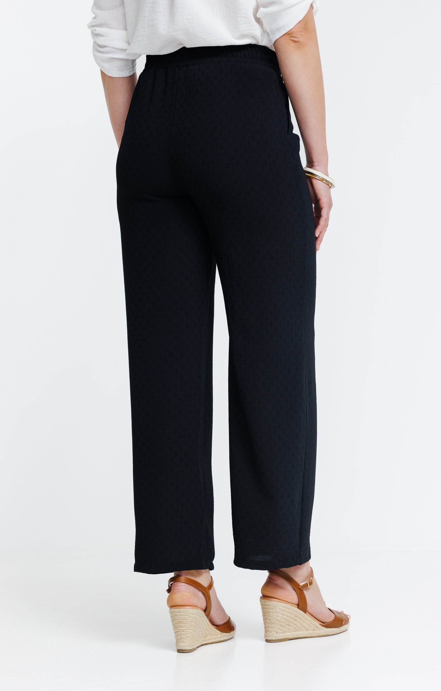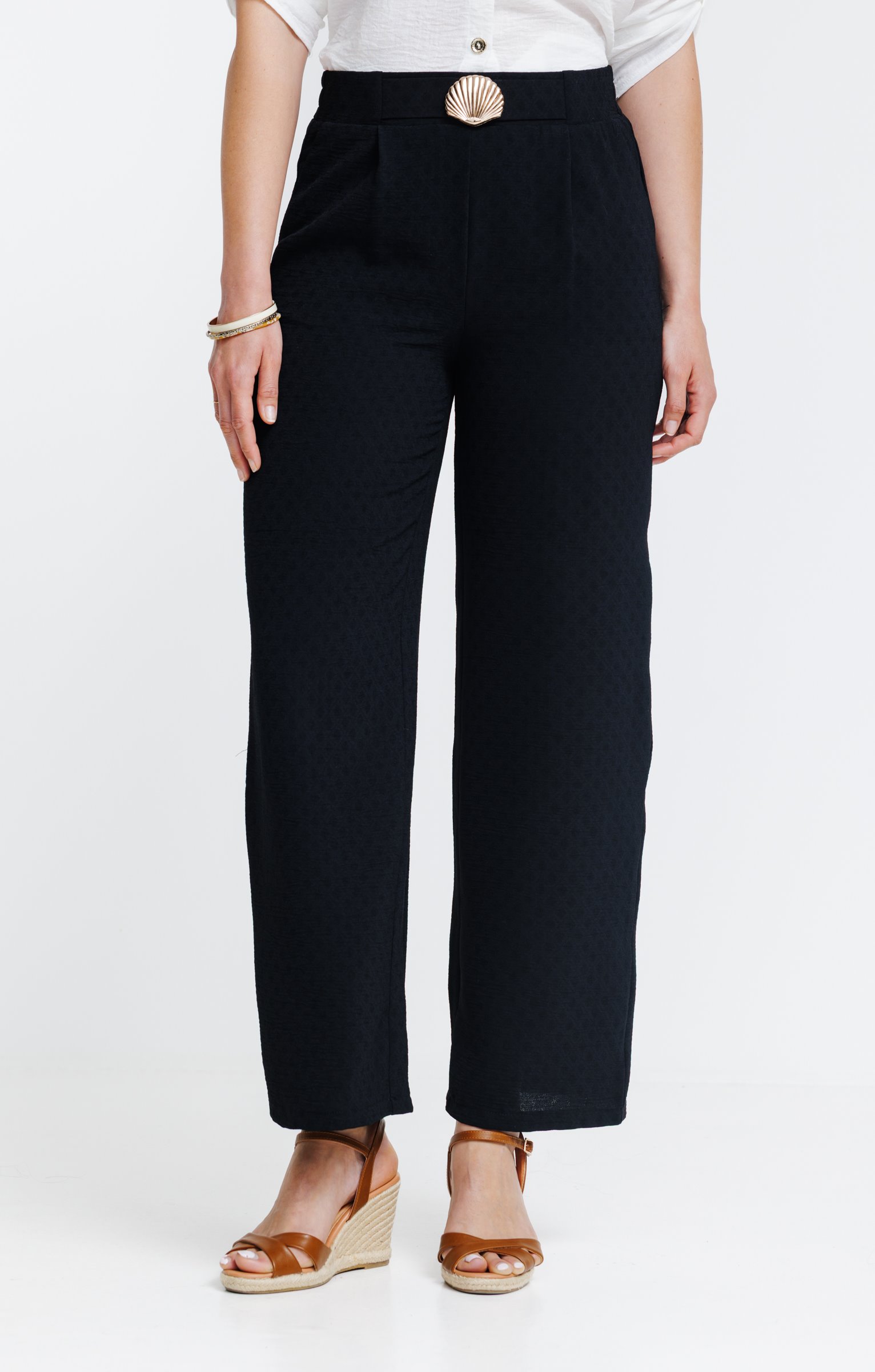 Pantalon large uni avec taille élastiquée. Coupe fluide et ample. Détails de plis sur le devant. Bouton décoratif en forme de coquillage au niveau de la taille. Longueur au niveau des chevilles. Tissu à motif texturé.