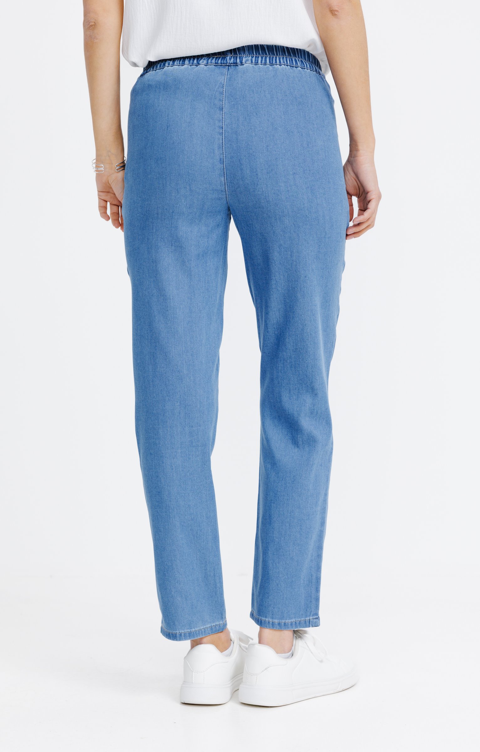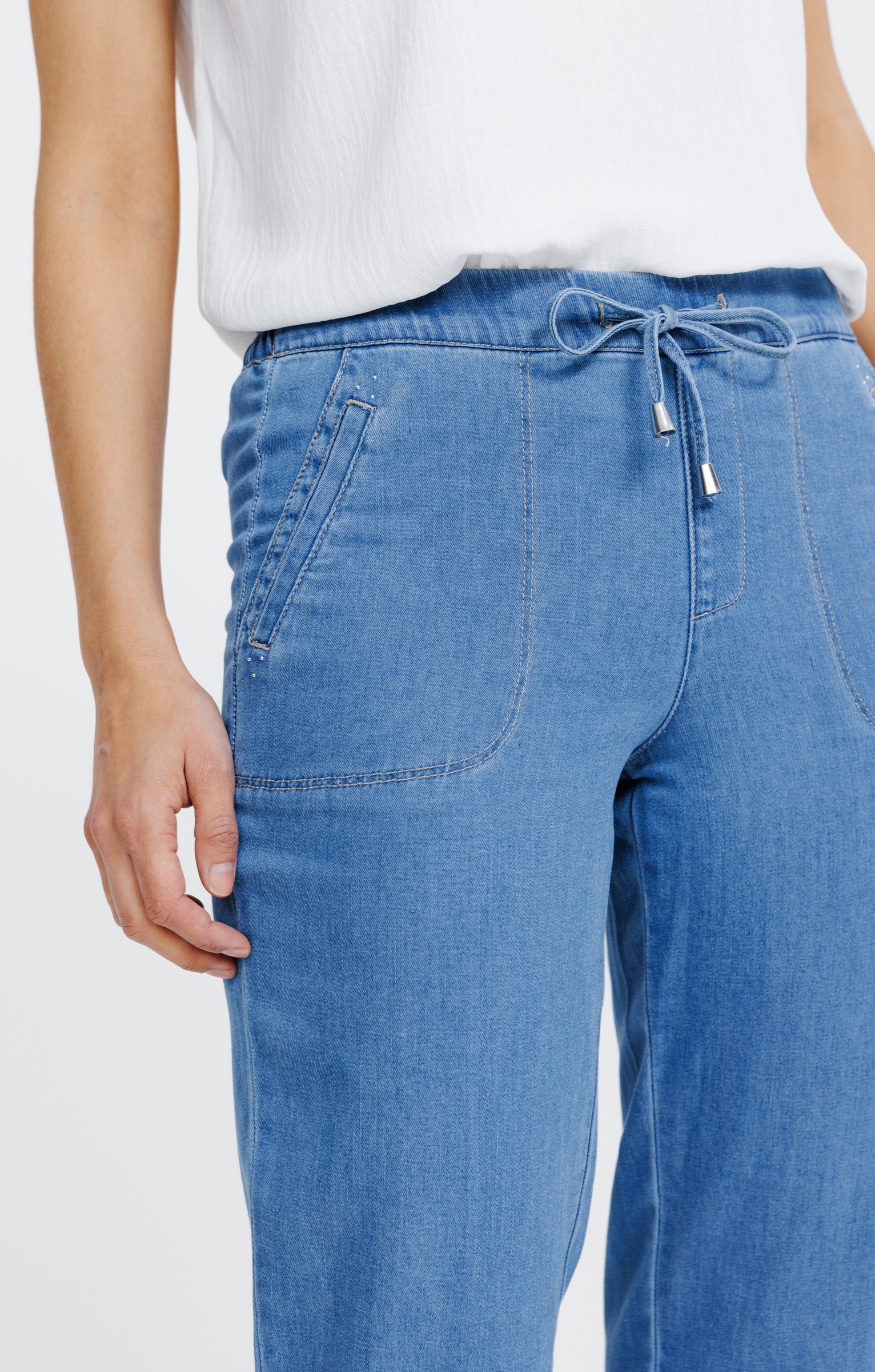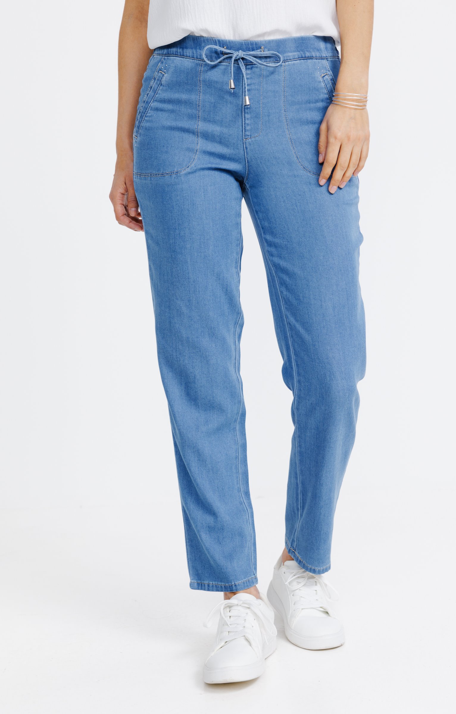 Pantalon jogging en denim. Coupe droite avec taille élastiquée et cordon de serrage. Deux poches avant décoratives ornées de strass discrets avec surpiqûres. Longueur cheville. Tissu uni avec une texture lisse.