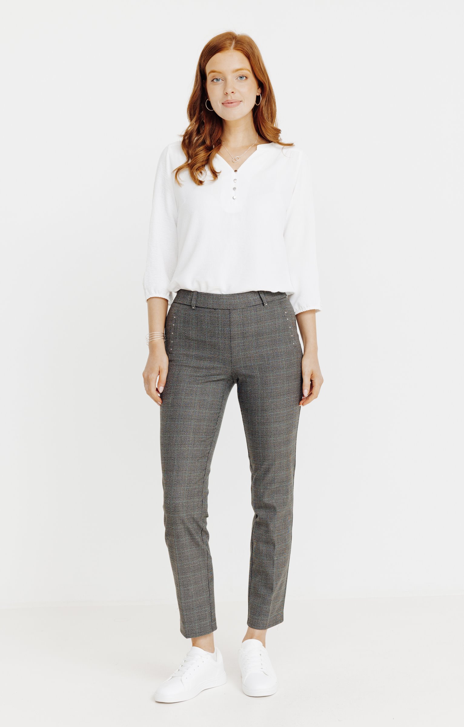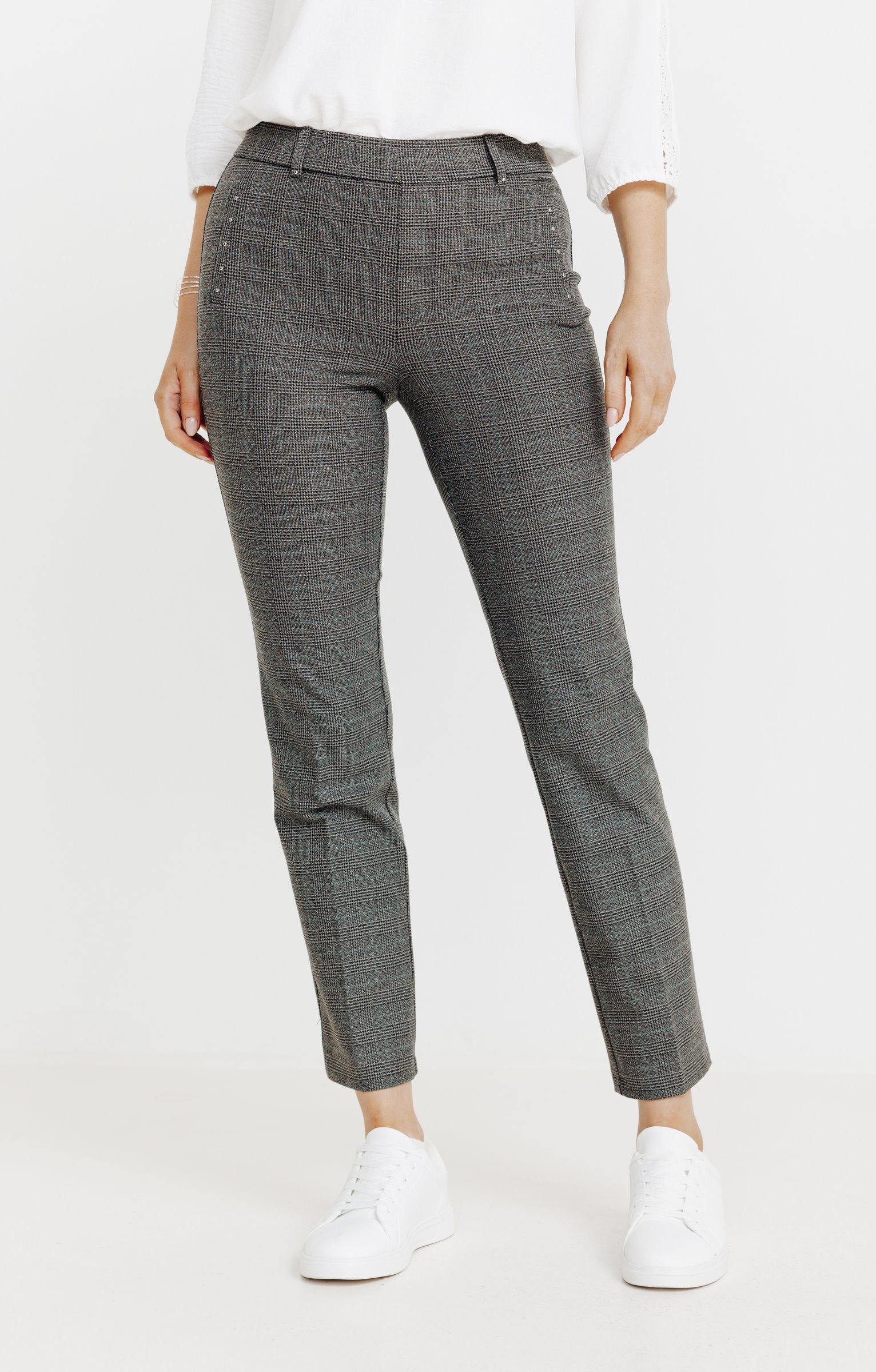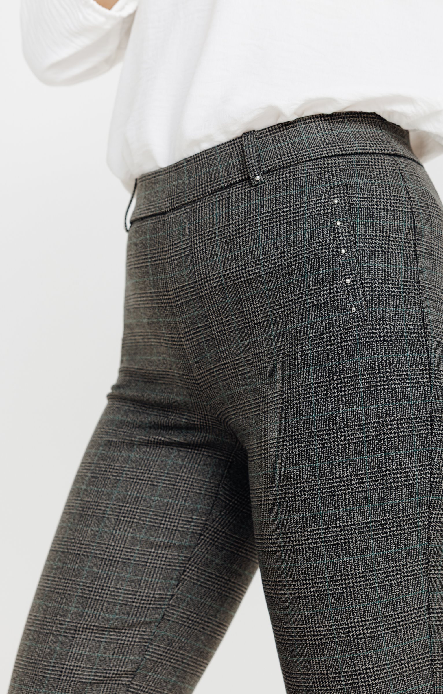 Tregging à carreaux coupe slim. 2 poches italiennes devant ornées de petits clous décoratifs. 2 poches passepoilées au dos. Ceinture à passants. Motif à carreaux avec effet prince-de-galles.