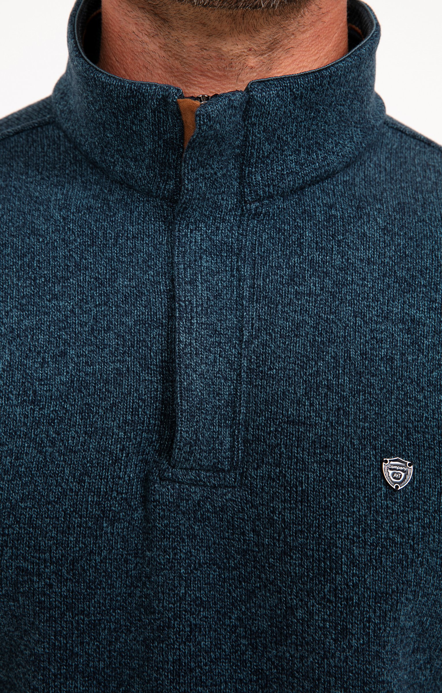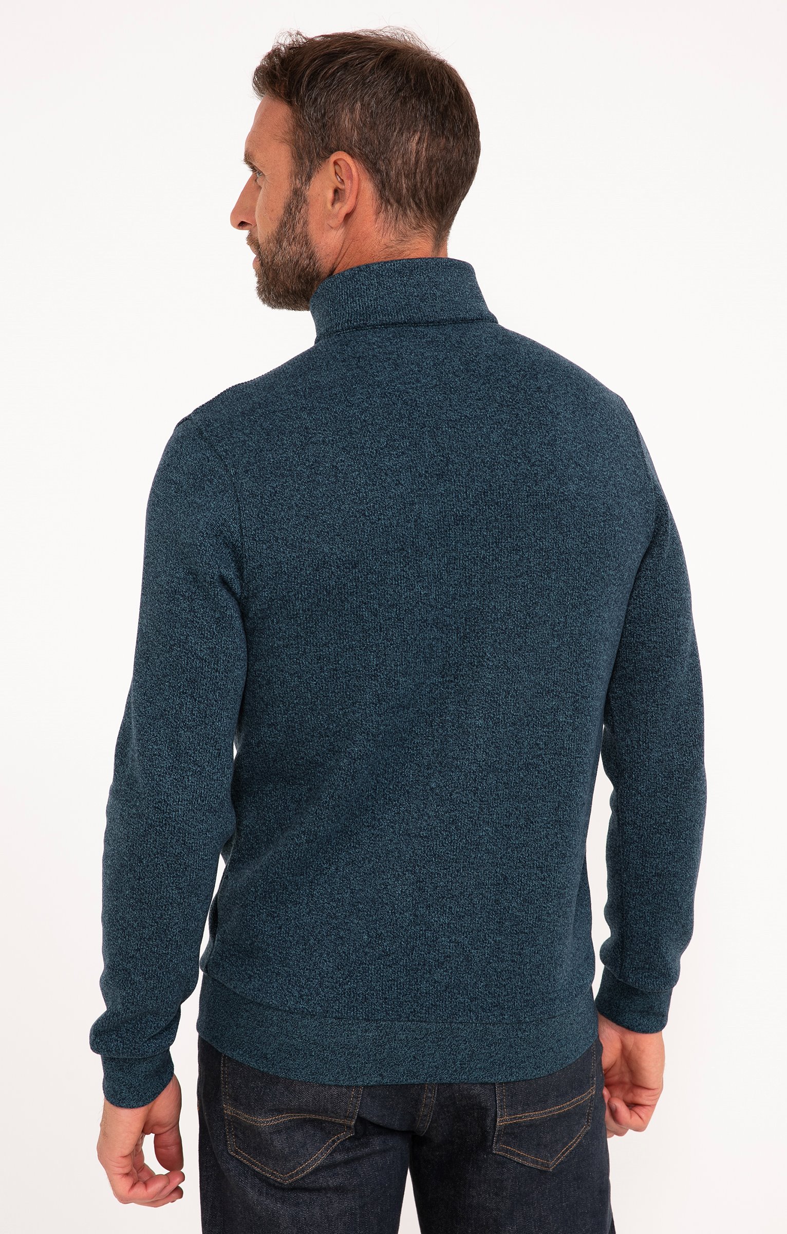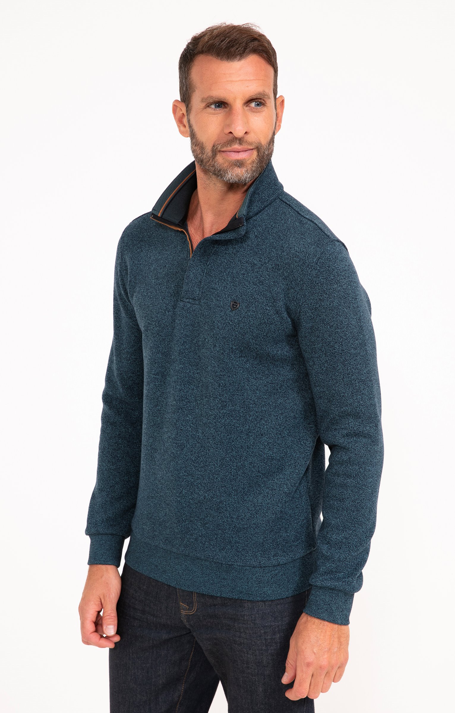 Polo inspiration pull camionneur à col montant zippé. Coupe droite. Manches longues. Emmanchures droites. Col montant. Fermeture zippée sous patte. Coloris chiné. Maille jersey. Poignets et base en bords-côtes. Doublure col en jacquard bicolore à petits points. Écusson géométrique siglé en métal cousu sur poitrine.