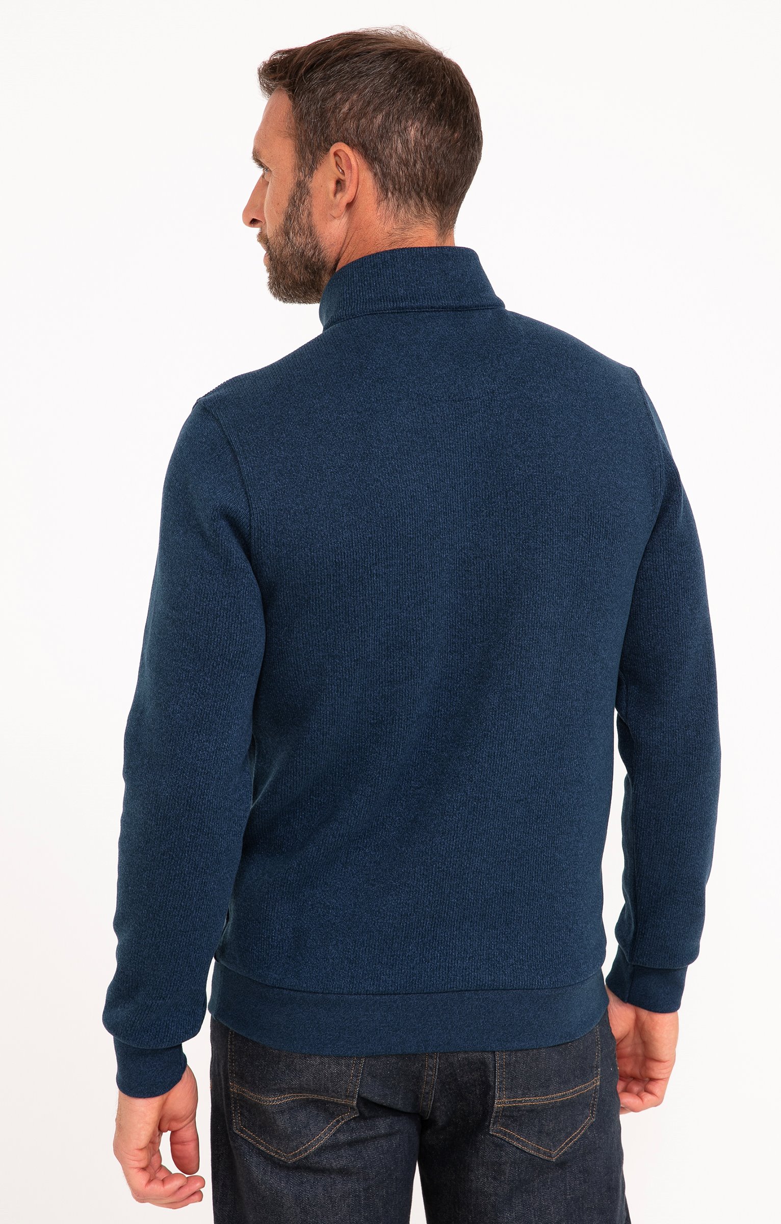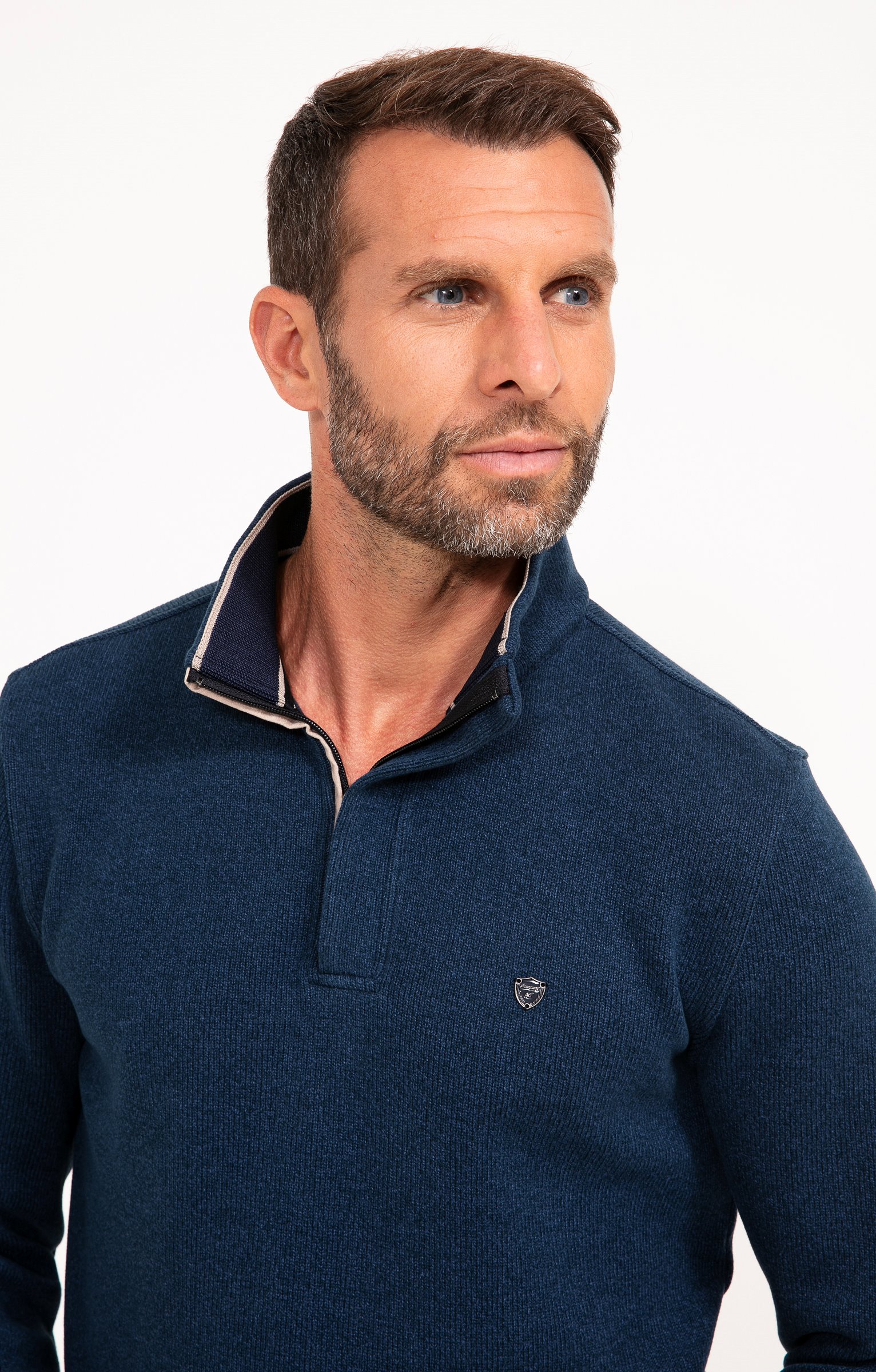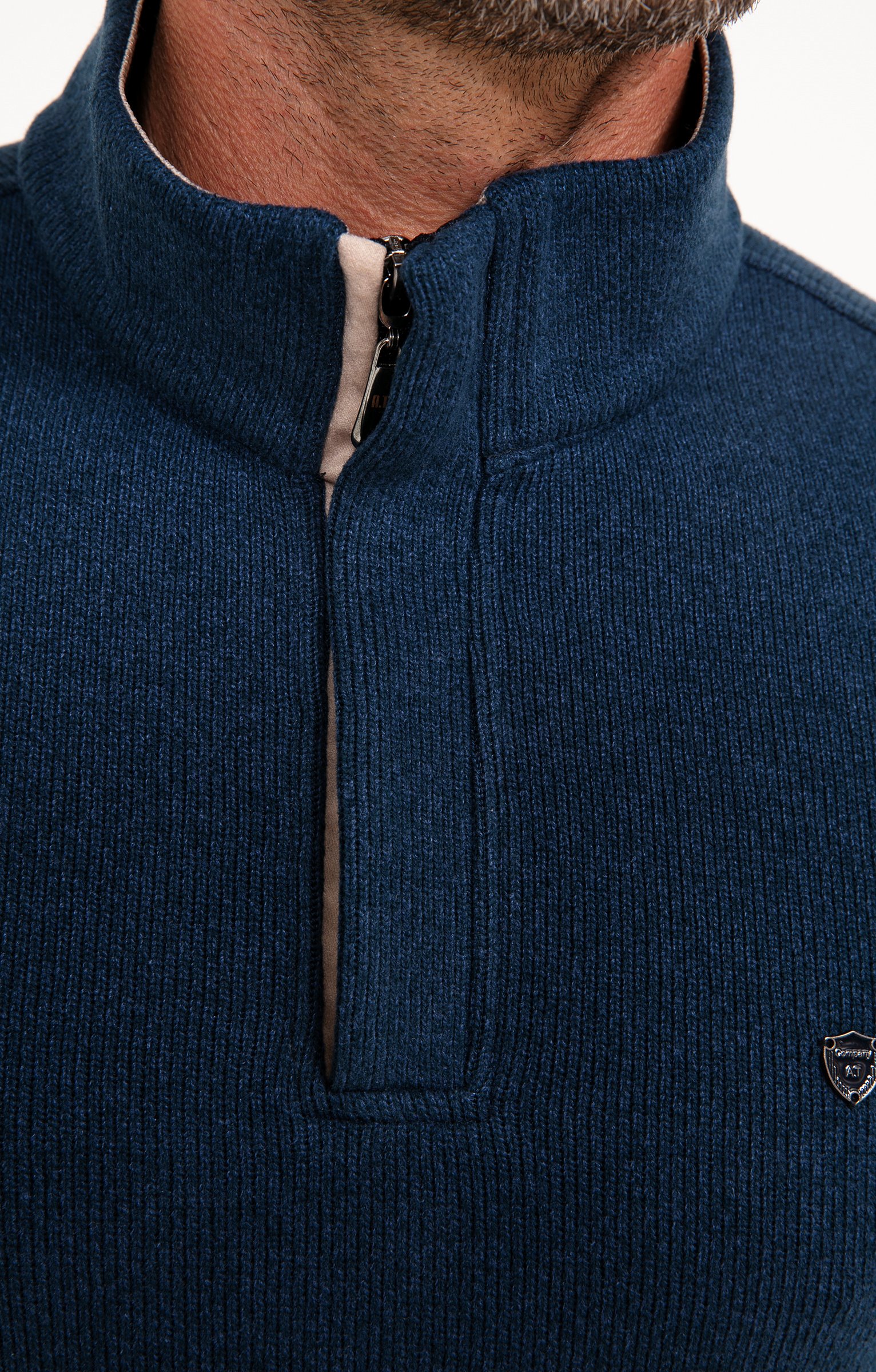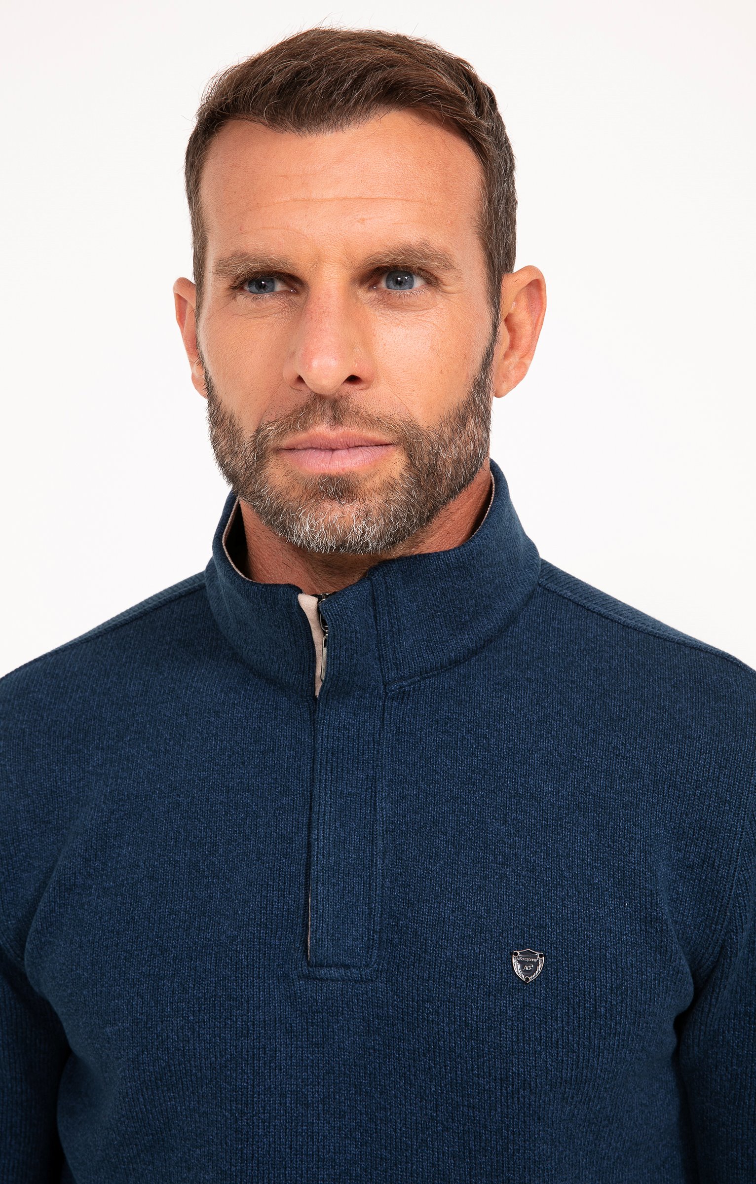Polo inspiration pull camionneur à col montant zippé. Coupe droite. Manches longues. Emmanchures droites. Col montant. Fermeture zippée sous patte. Coloris chiné. Maille jersey. Poignets et base en bords-côtes. Doublure col en jacquard bicolore à petits points. Écusson géométrique siglé en métal cousu sur poitrine.