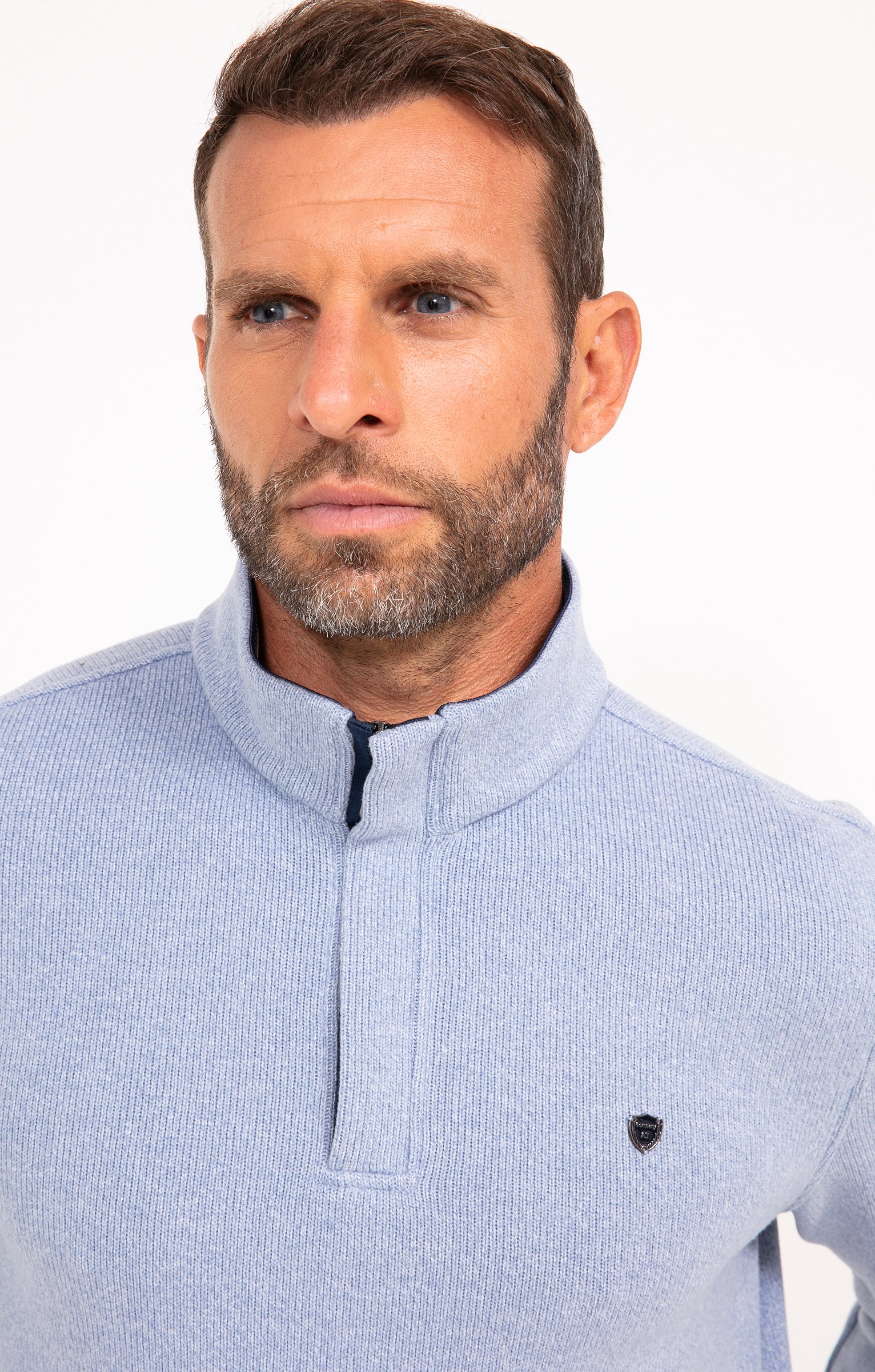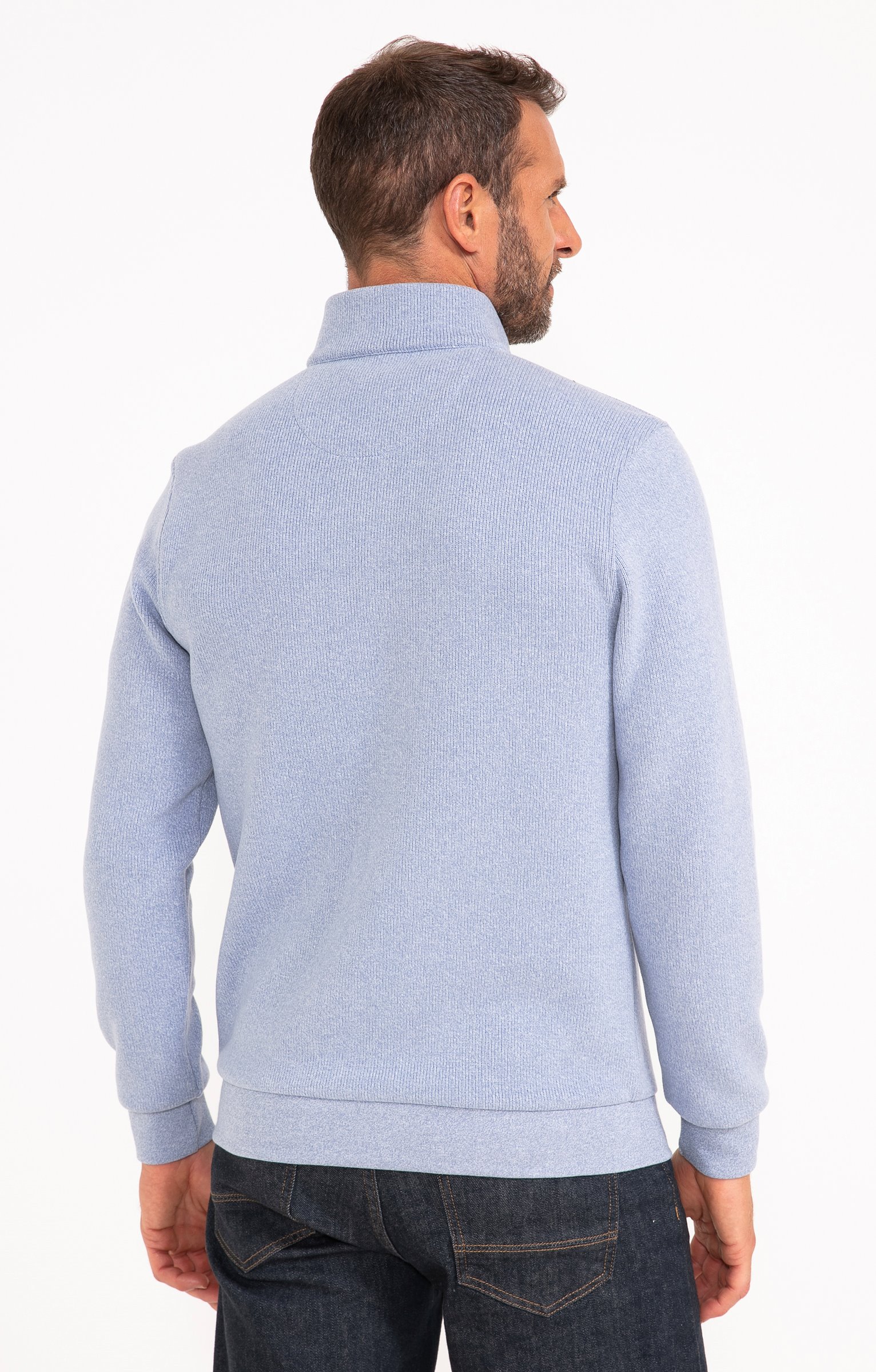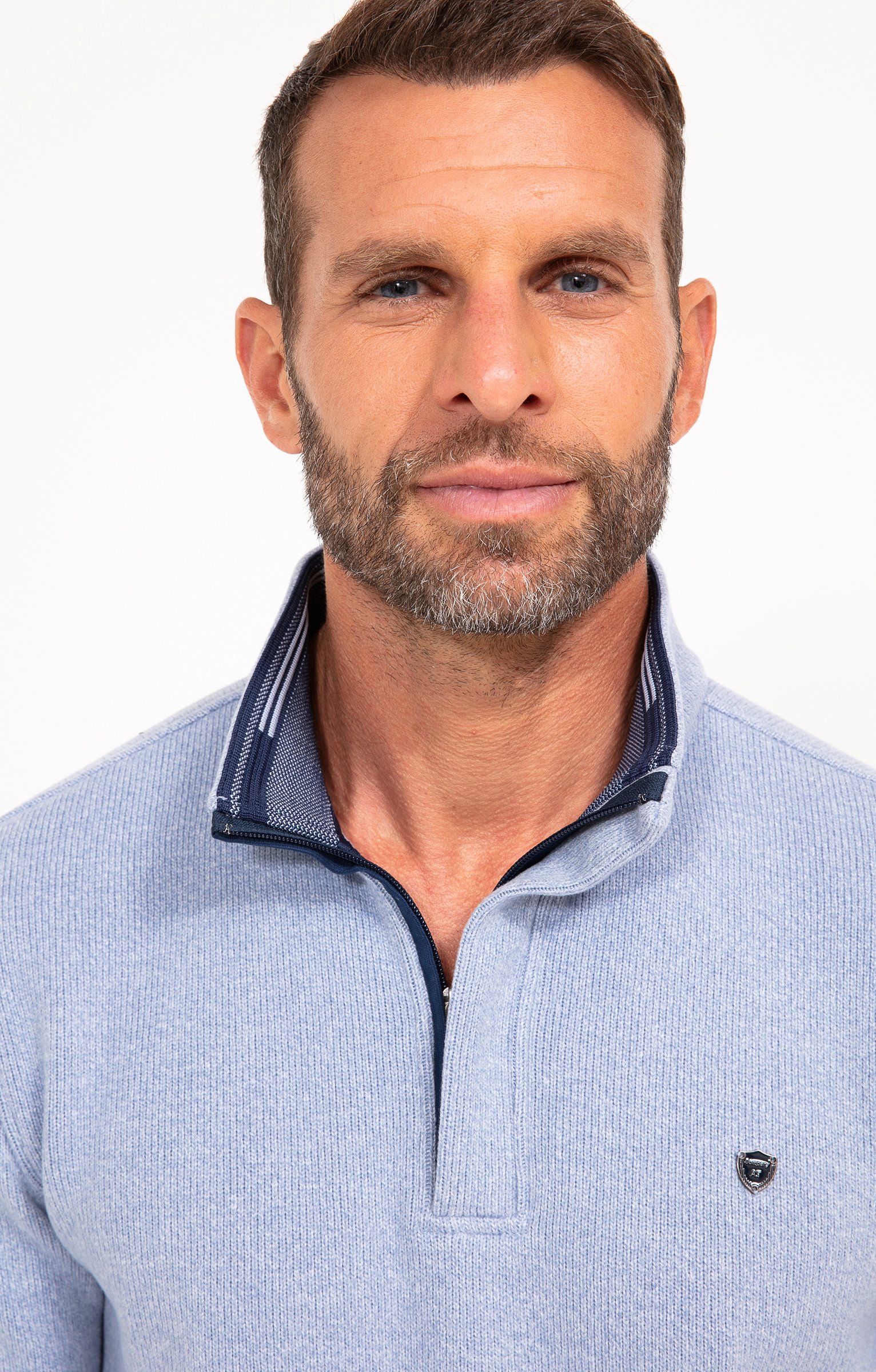 Polo inspiration pull camionneur à col montant zippé. Coupe droite. Manches longues. Emmanchures droites. Col montant. Fermeture zippée sous patte. Coloris chiné. Maille jersey. Poignets et base en bords-côtes. Doublure col en jacquard bicolore à petits points. Écusson géométrique siglé en métal cousu sur poitrine.