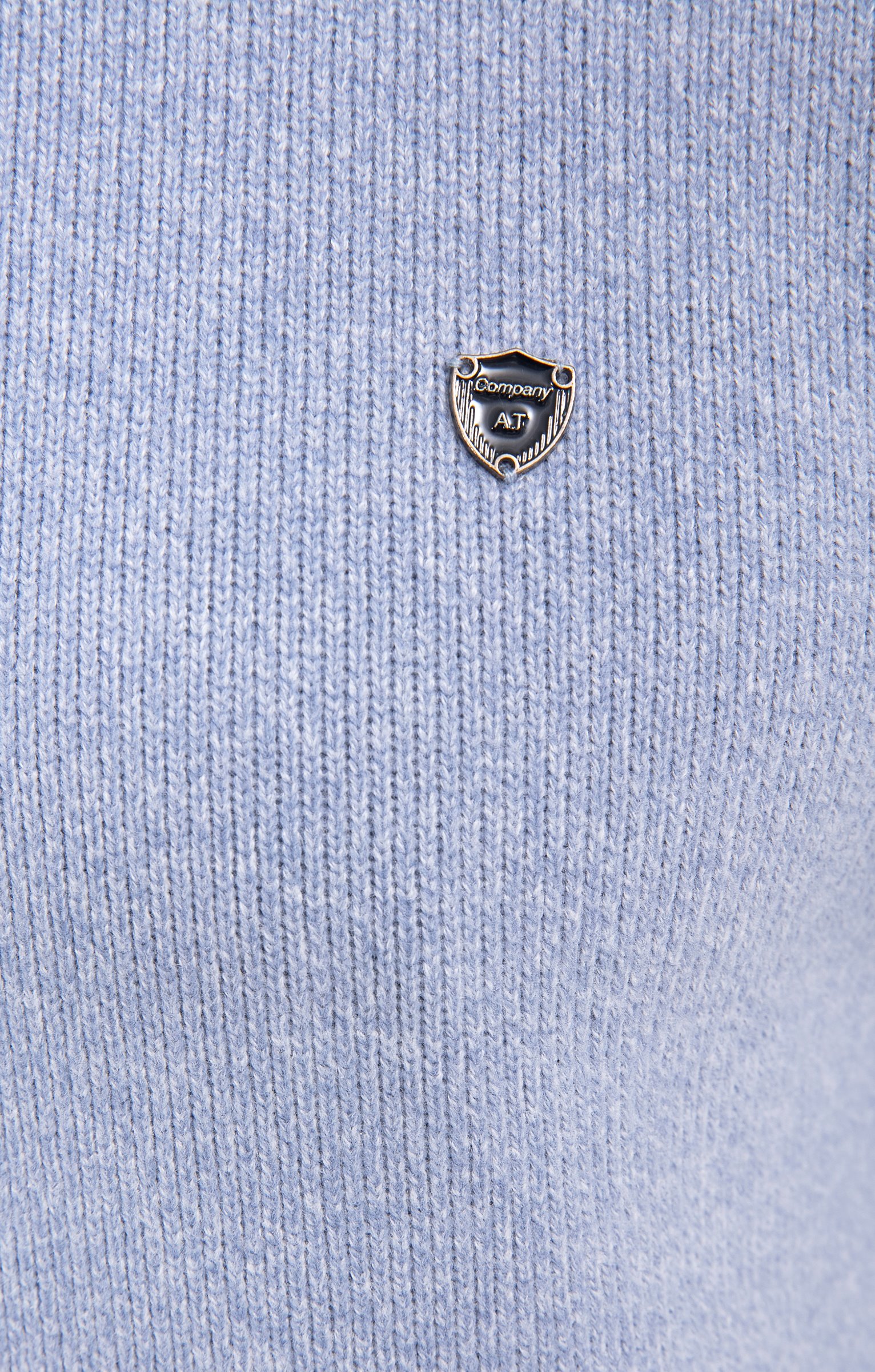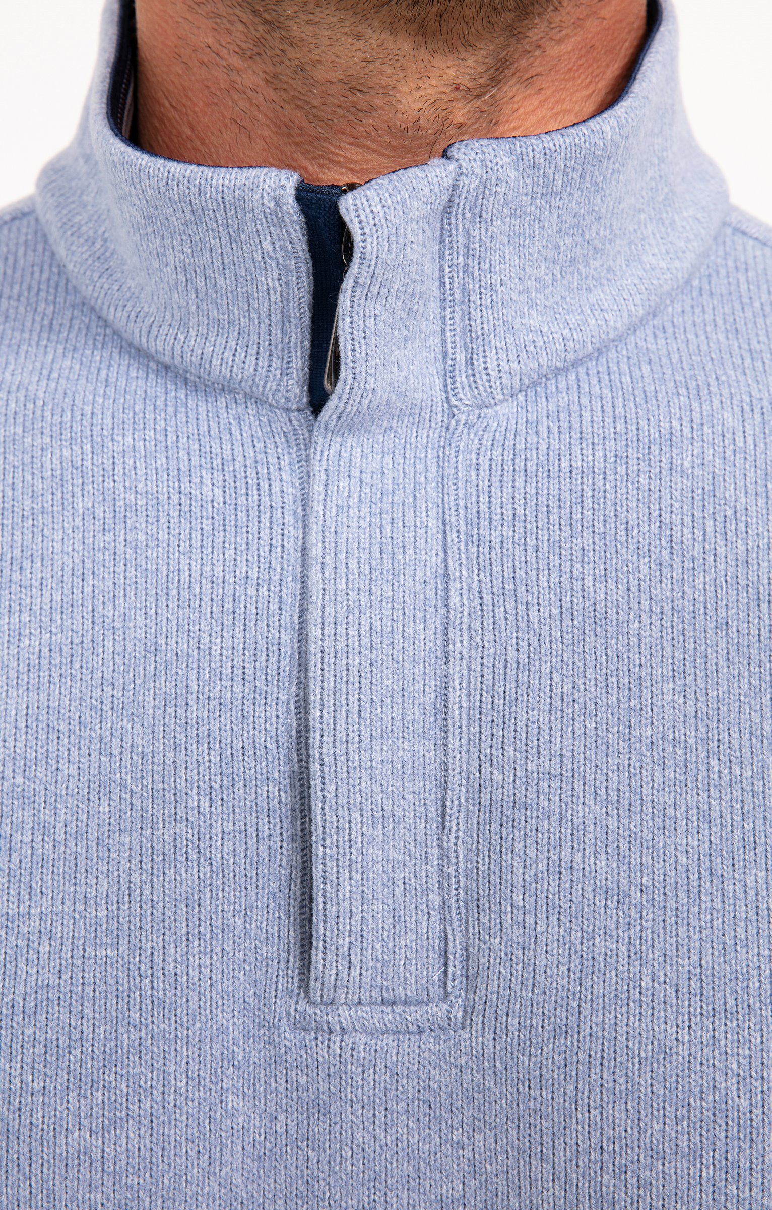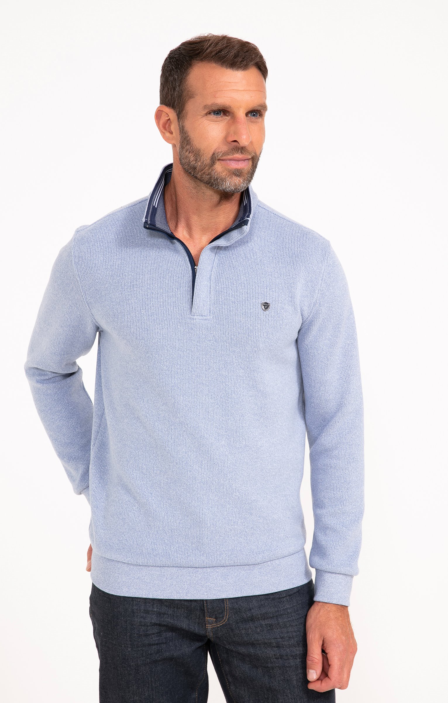 Polo inspiration pull camionneur à col montant zippé. Coupe droite. Manches longues. Emmanchures droites. Col montant. Fermeture zippée sous patte. Coloris chiné. Maille jersey. Poignets et base en bords-côtes. Doublure col en jacquard bicolore à petits points. Écusson géométrique siglé en métal cousu sur poitrine.