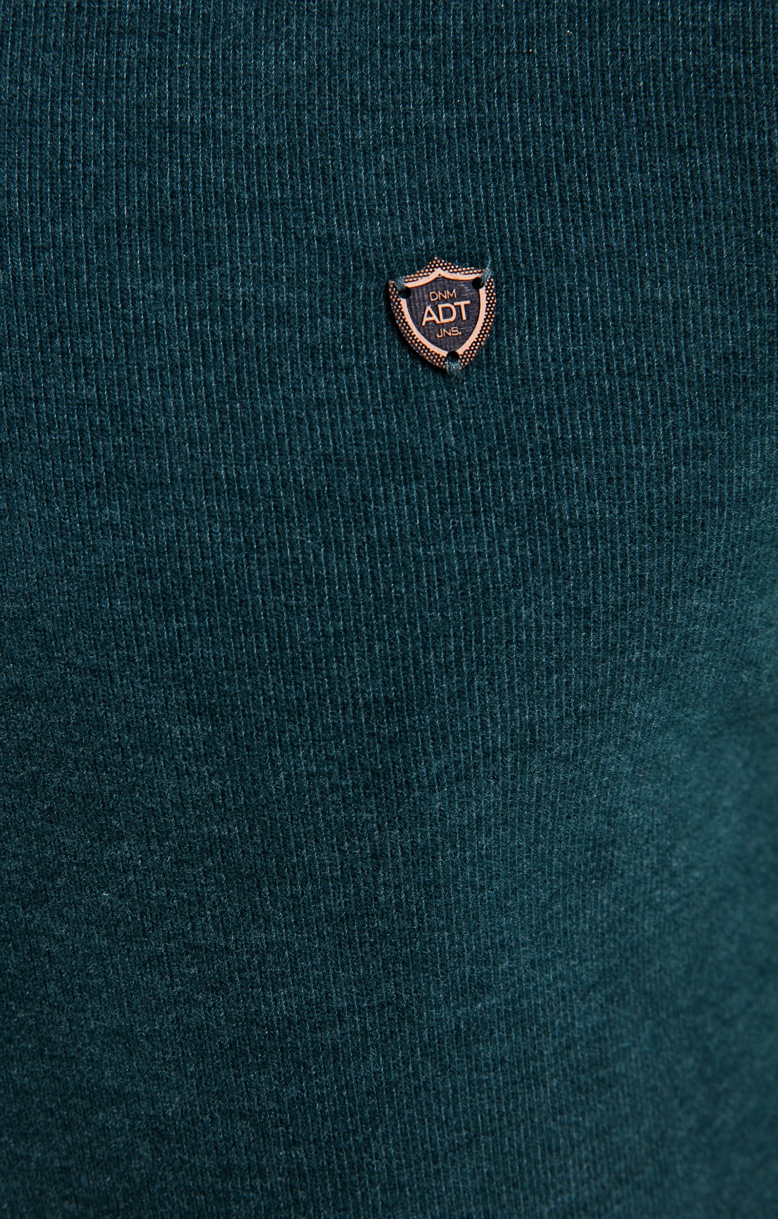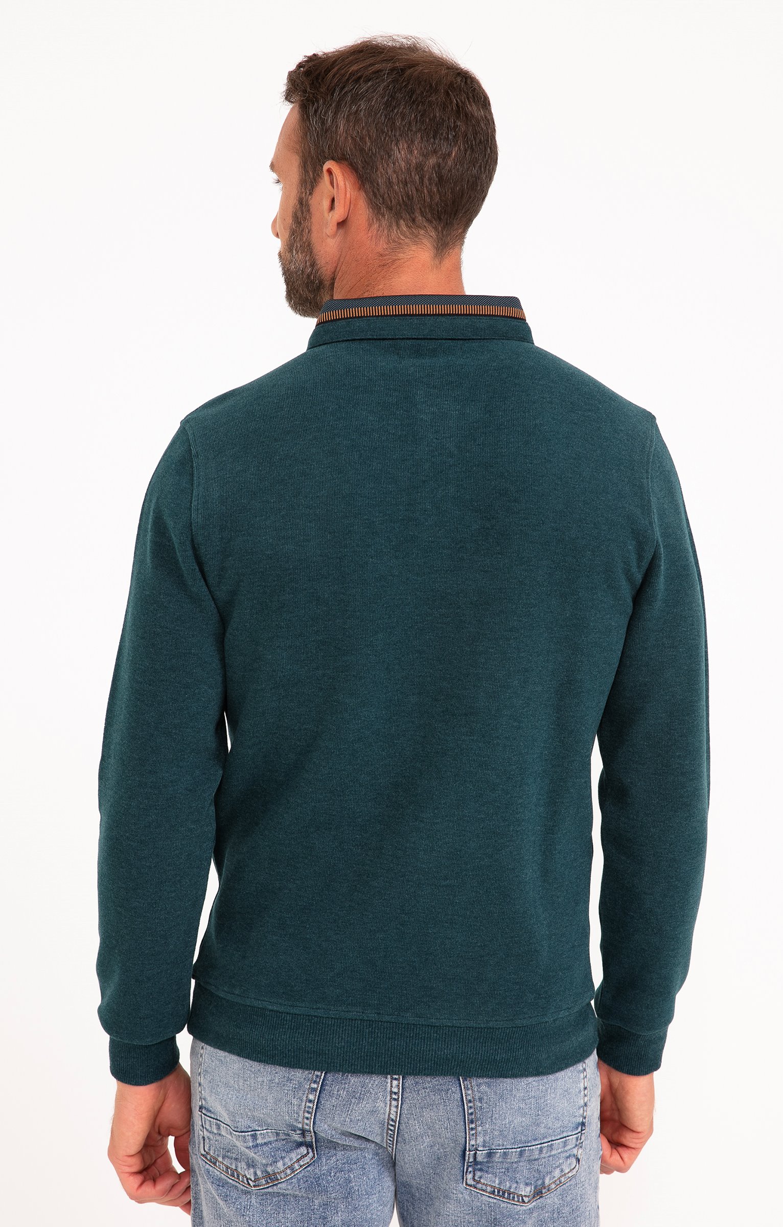 Polo fin avec col fantaisie. Coupe droite. Manches longues à emmanchures droites. Col polo avec pointes boutonnées, fermé par des boutons bicolores. Fine maille unie. Motifs fantaisie à l'intérieur de la patte boutonnée et sur le bord supérieur. Écusson métallique sur la poitrine. Finitions bords-côtes à la base et aux poignets.