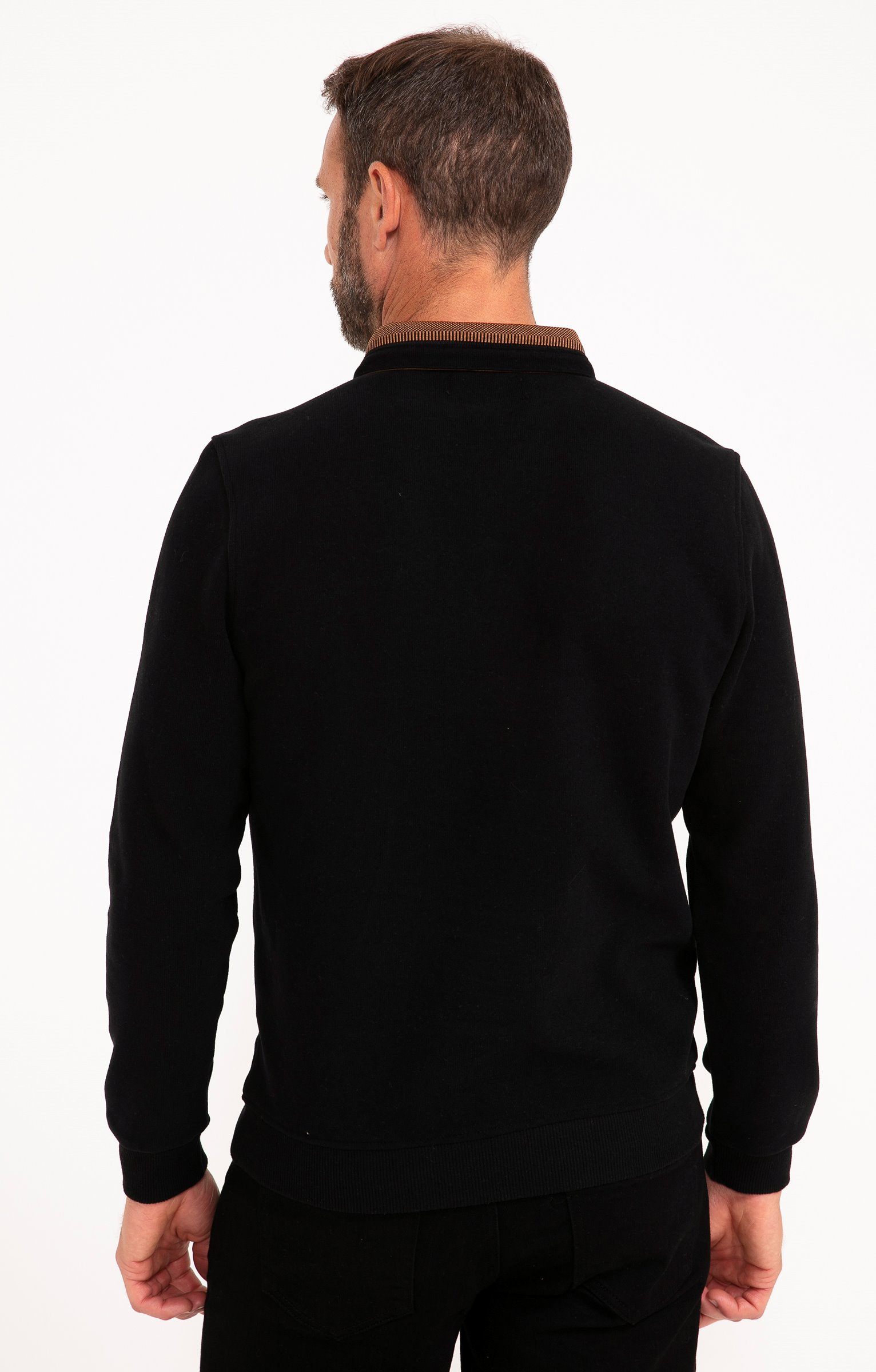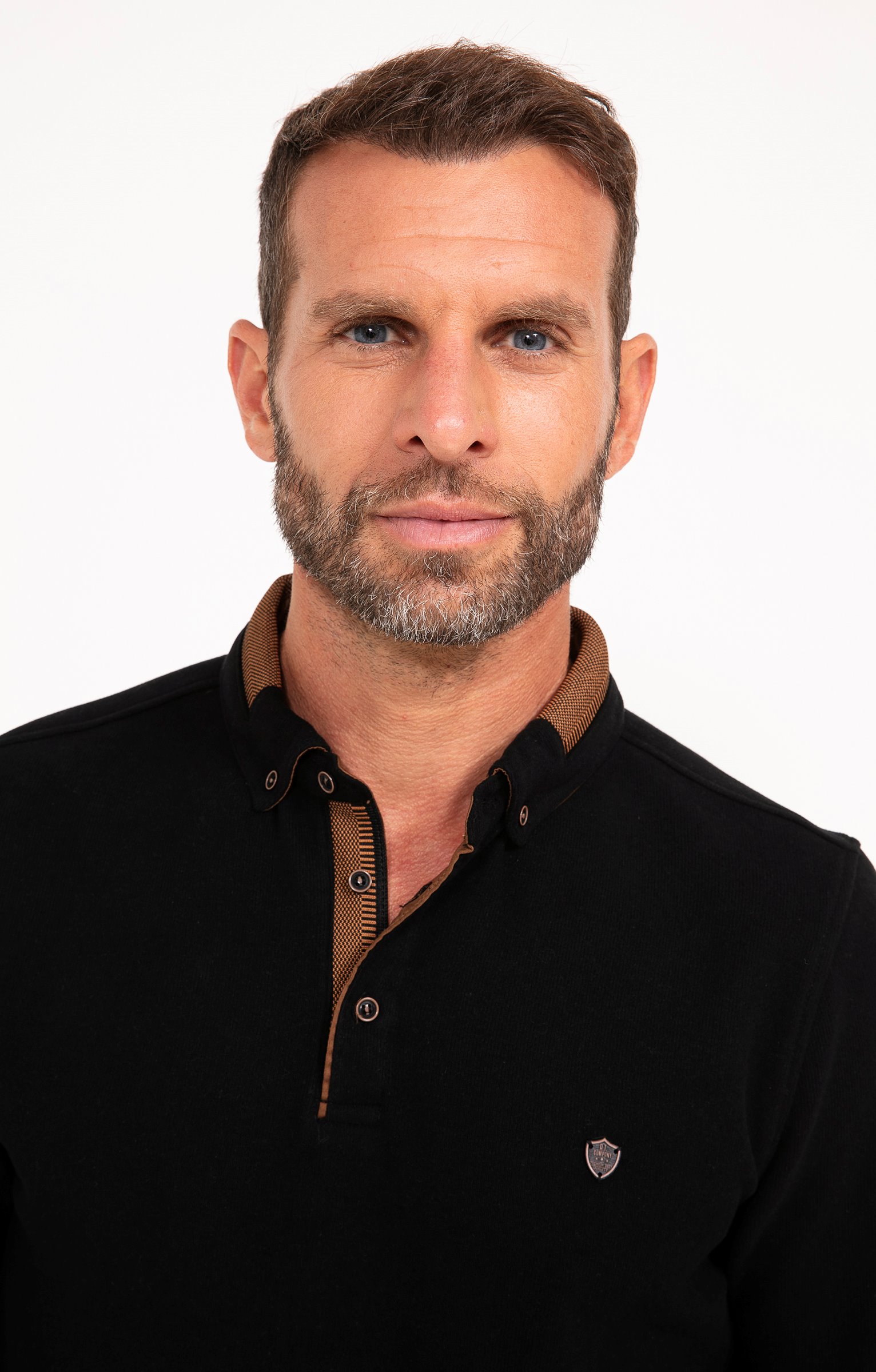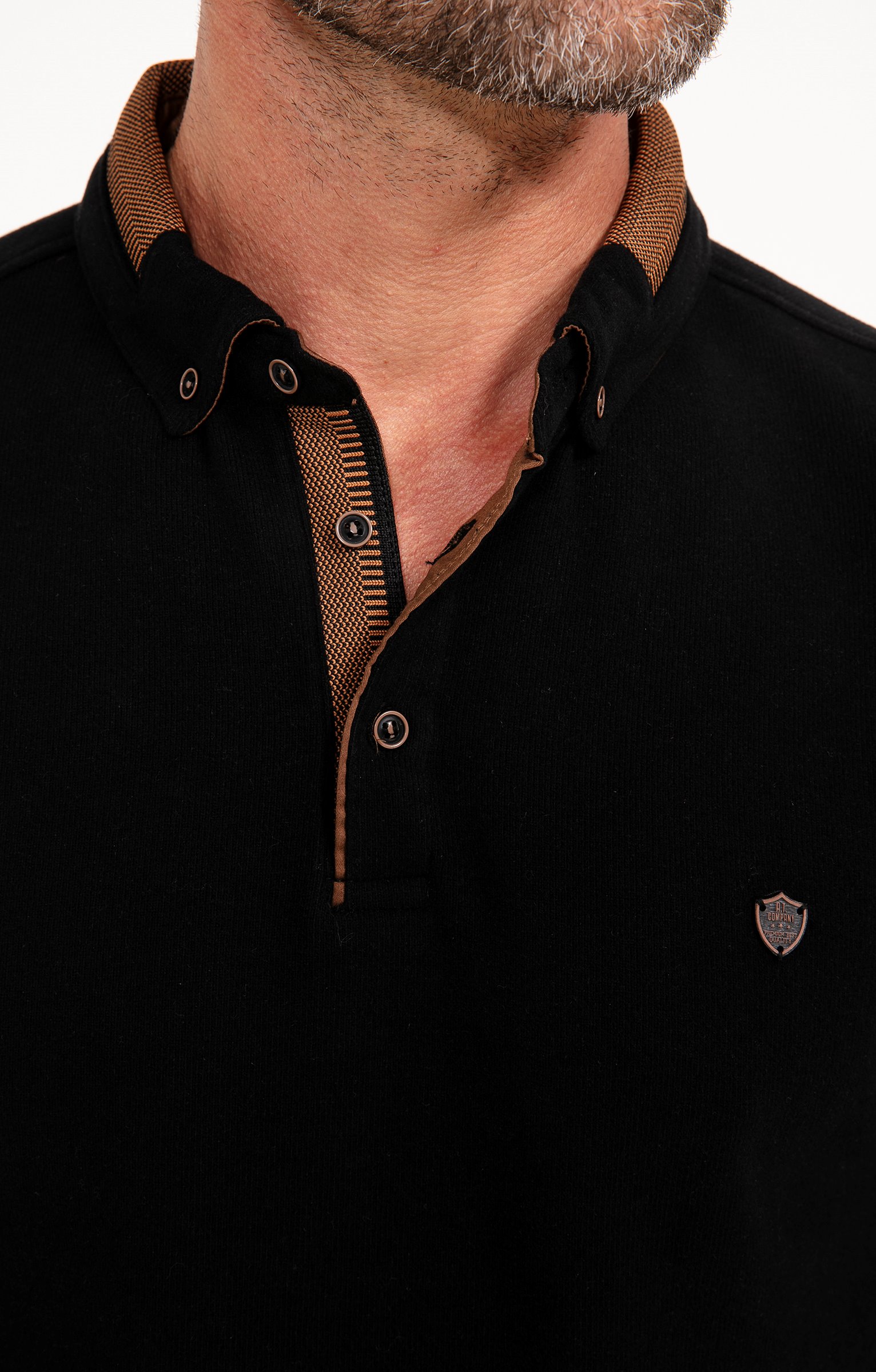 Polo fin avec col fantaisie. Coupe droite. Manches longues à emmanchures droites. Col polo avec pointes boutonnées, fermé par des boutons bicolores. Fine maille unie. Motifs fantaisie à l'intérieur de la patte boutonnée et sur le bord supérieur. Écusson métallique sur la poitrine. Finitions bords-côtes à la base et aux poignets.