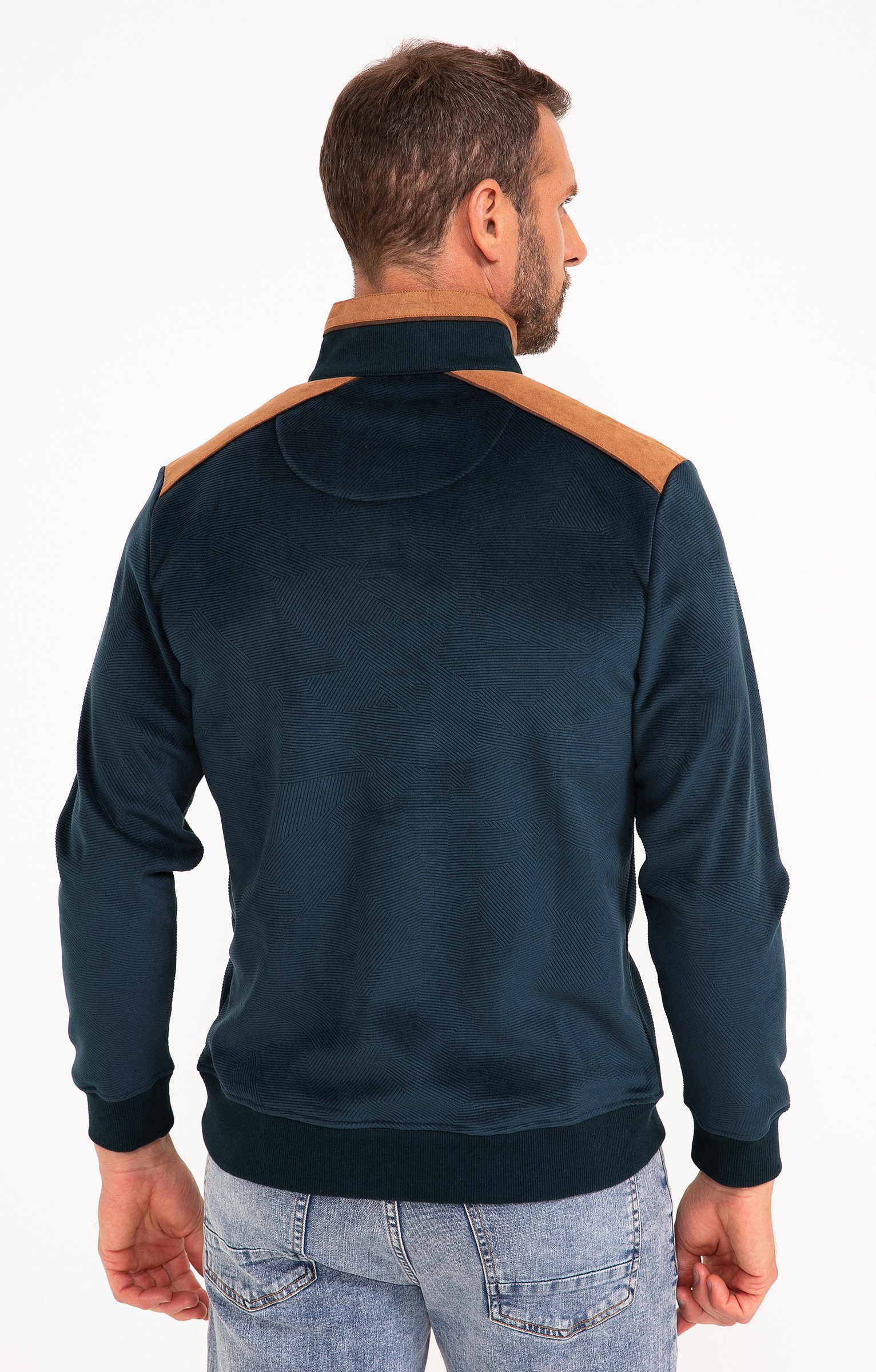 Polo façon pull camionneur zippé en maille à motifs tissés. Coupe droite. Manches longues. Emmanchures droites. Col montant. Fermeture zippée. Tons bicolores. Maille façonnée de motifs graphiques. Col, poignets et base en bords-côtes. Matière et liseré suédés finition col, fermeture et empiècement épaules. Tire-zip métal avec cordon suédé.