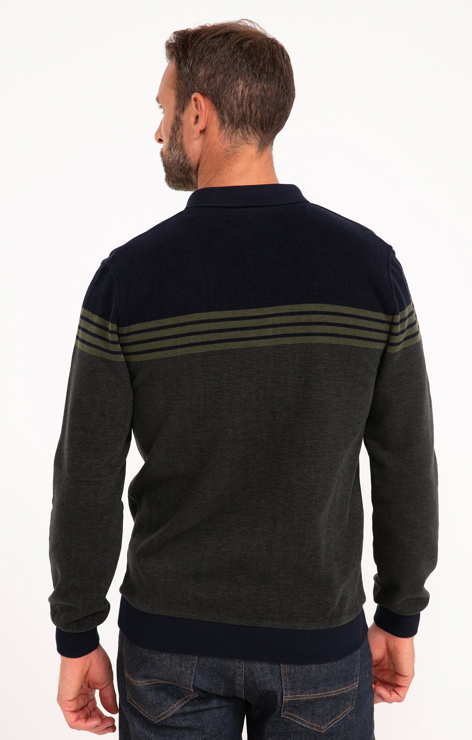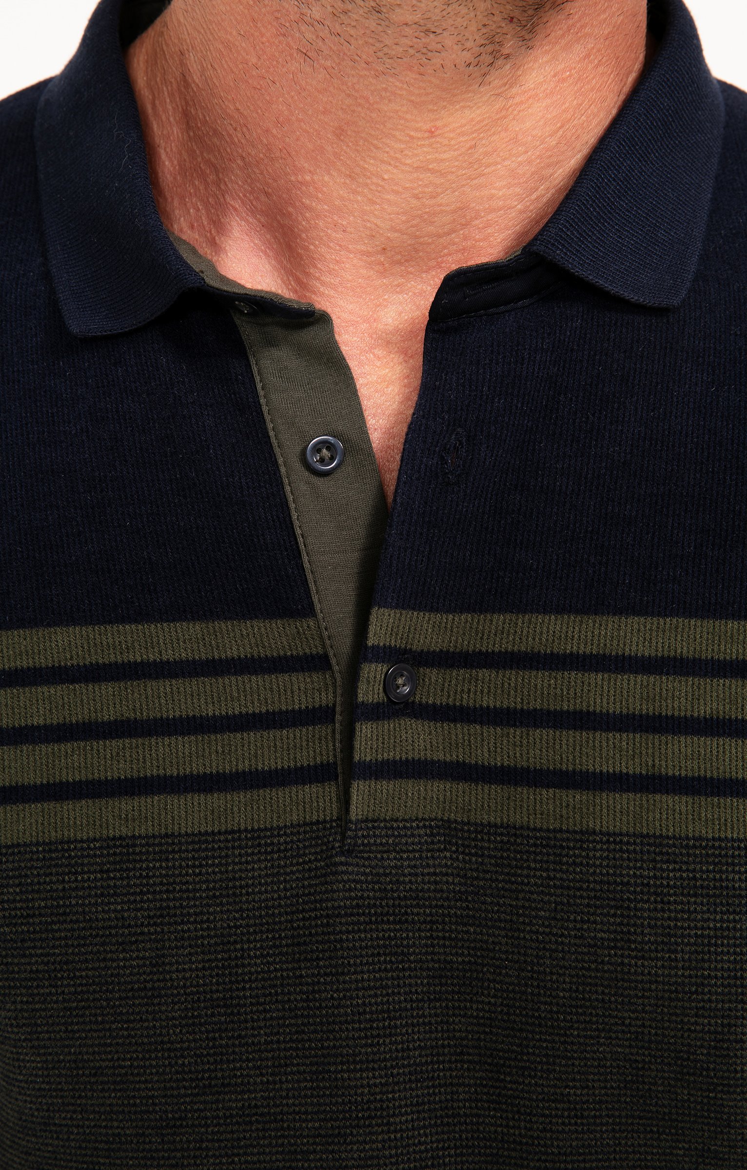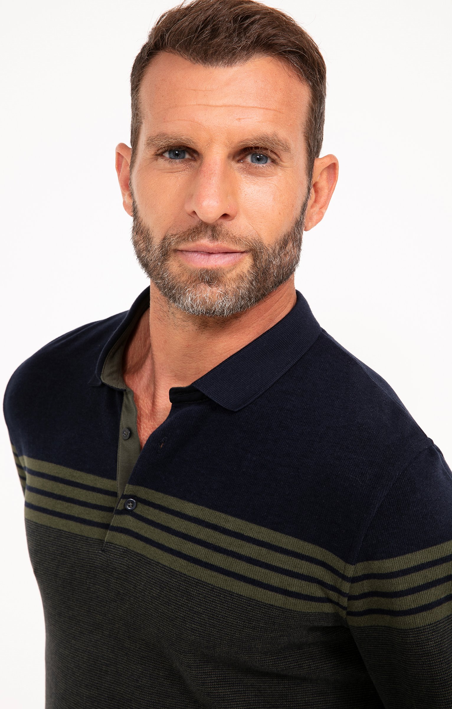 Polo à manches longues à rayures bicolores. Coupe droite. Manches longues. Emmanchures droites. Col classique. Fermeture boutonnée. Rayures bicolores horizontales en empiècement haut devant, manches et au dos. Partie haute, poignets et base unis. Partie base en jacquard mini-points bicolores. Maille jersey. Finitions en bords-côtes.