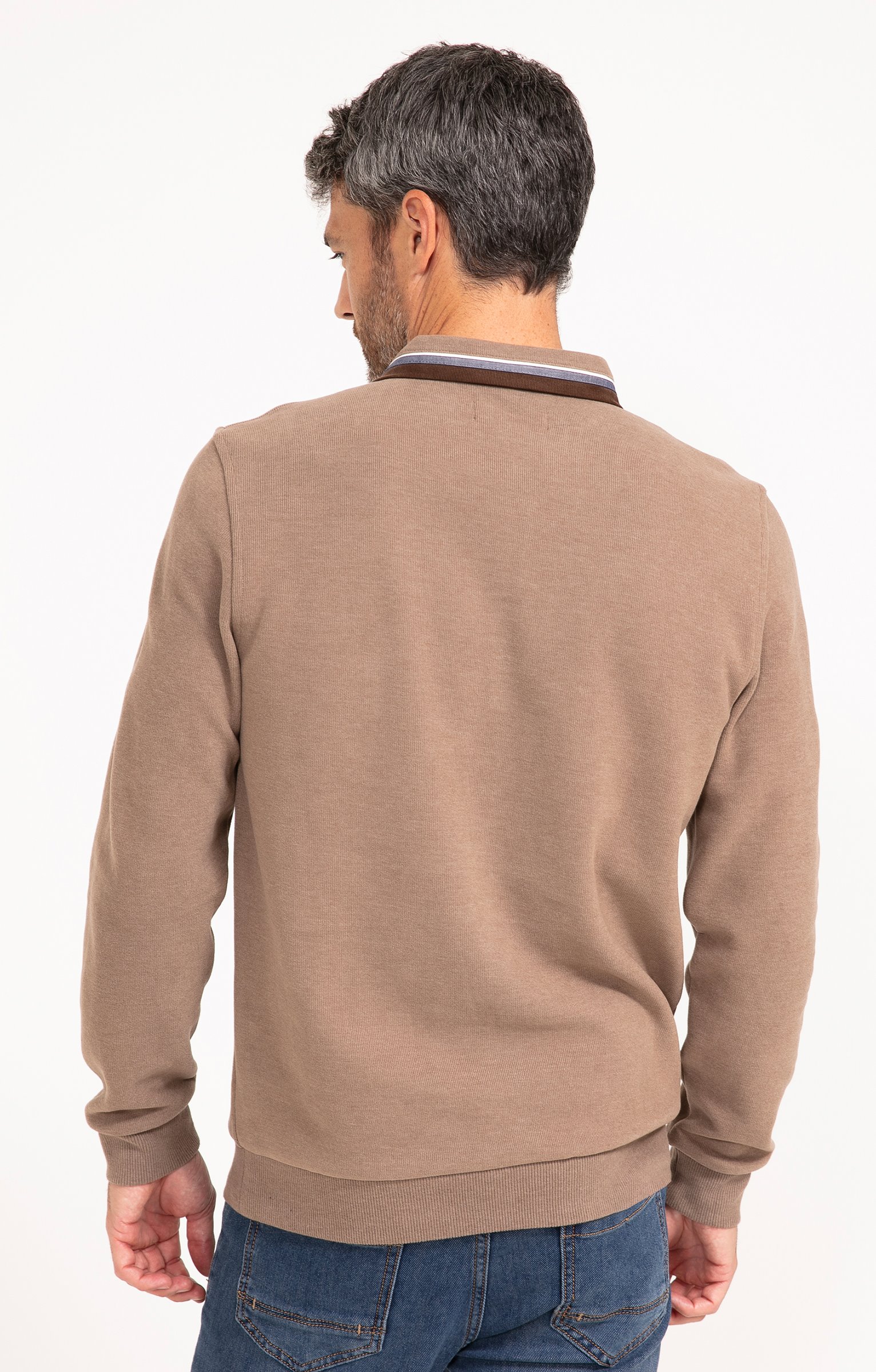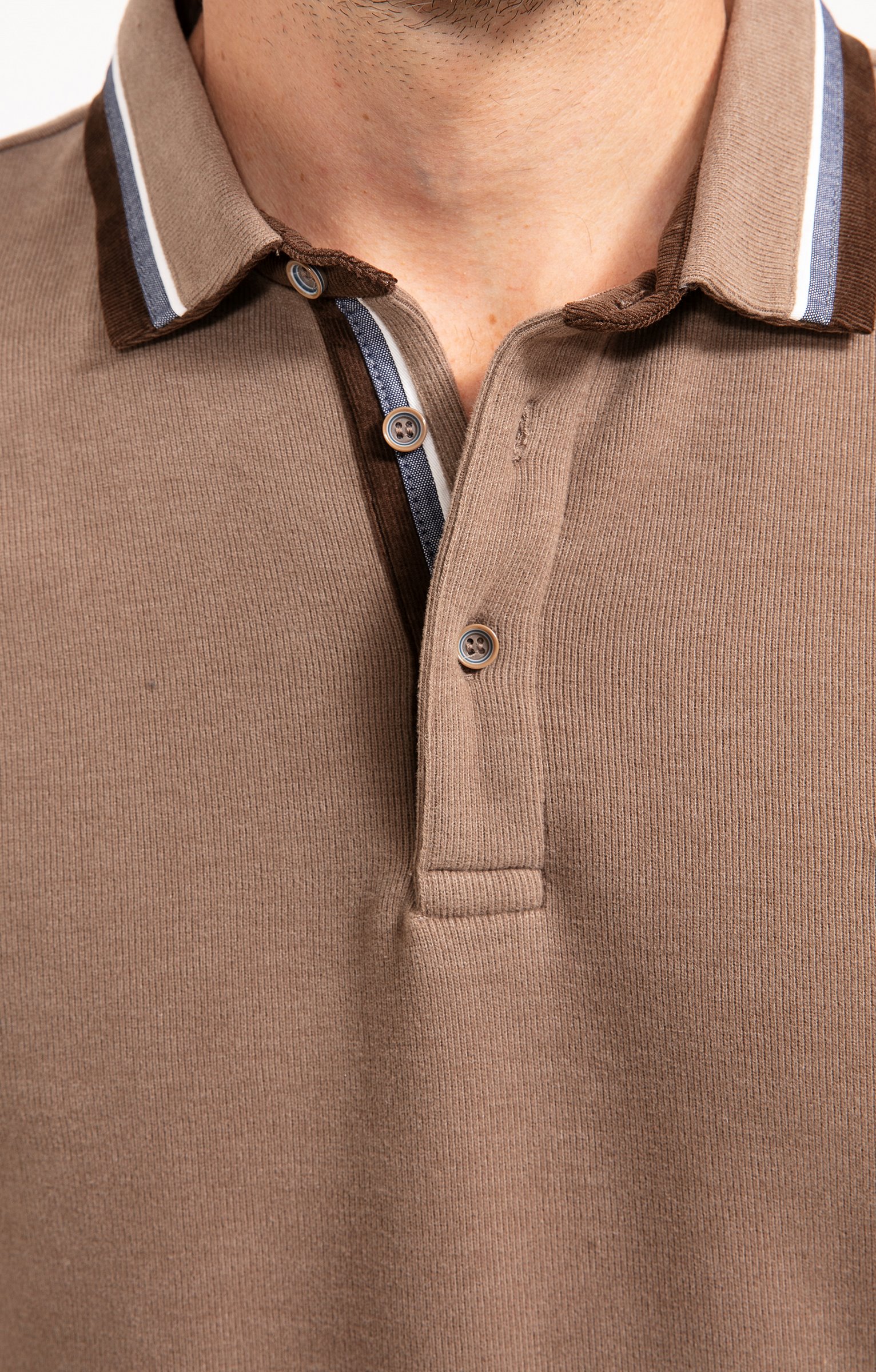 Polo à manches longues avec détails velours. Coupe droite. Manches longues. Emmanchures droites. Col classique. Fermeture boutonnée. Teinte unie. Maille jersey. Rayures au col et sur patte de boutonnage en velours et liseré contrasté. Pied de col velours uni. Poignets et base en bord-côte. Écusson géométrique siglé en métal cousu sur poitrine.