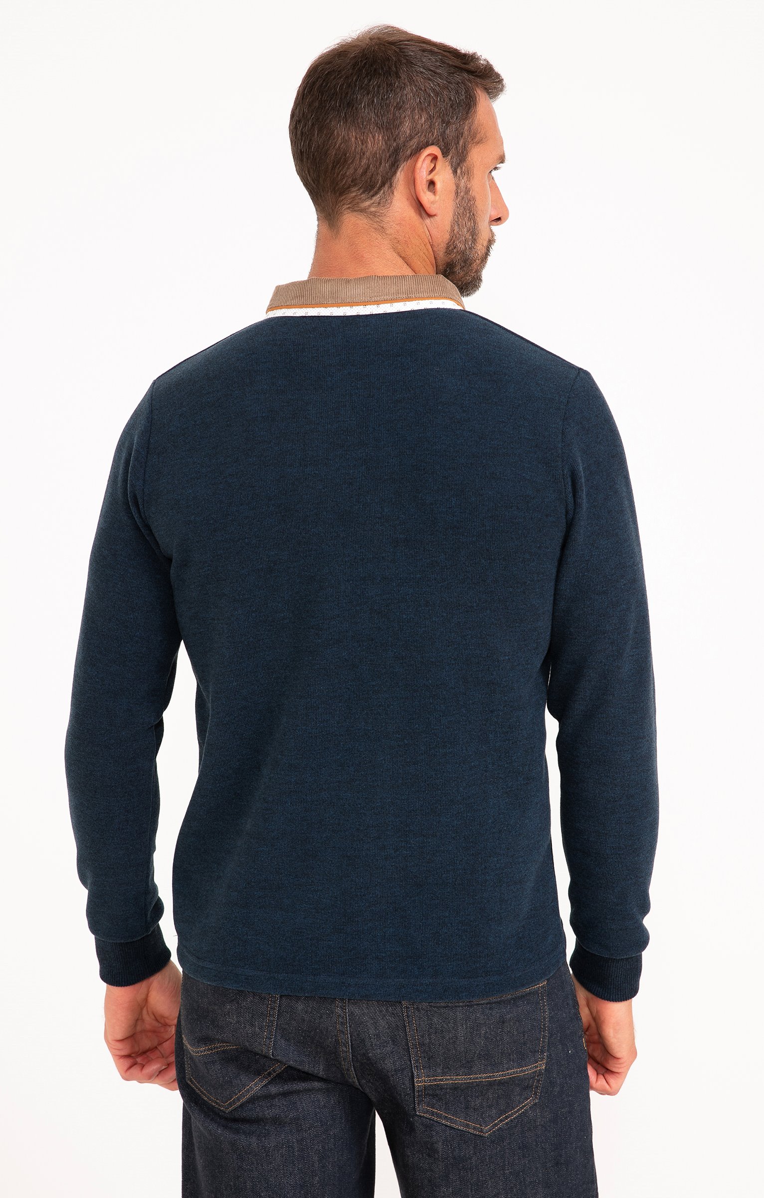 Polo à manches longues uni avec col en velours. Coupe droite. Manches longues avec poignets en bord-côtes. Col polo boutonné avec revers en velours et détails mix matières à motifs. Coloris uni. Tissu en maille fine aspect chiné. Patte de boutonnage avec tissu rayé et à motifs graphiques. Mini motif brodé sur la poitrine. Petits boutons cerclés.