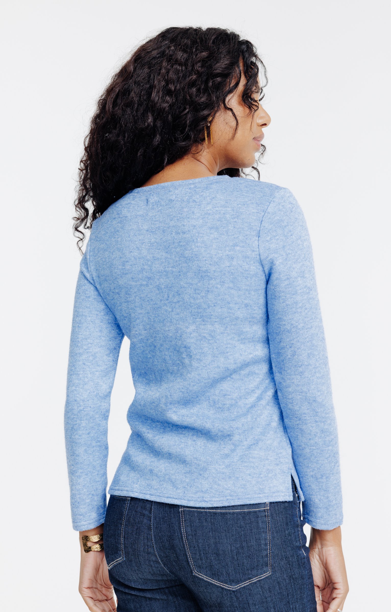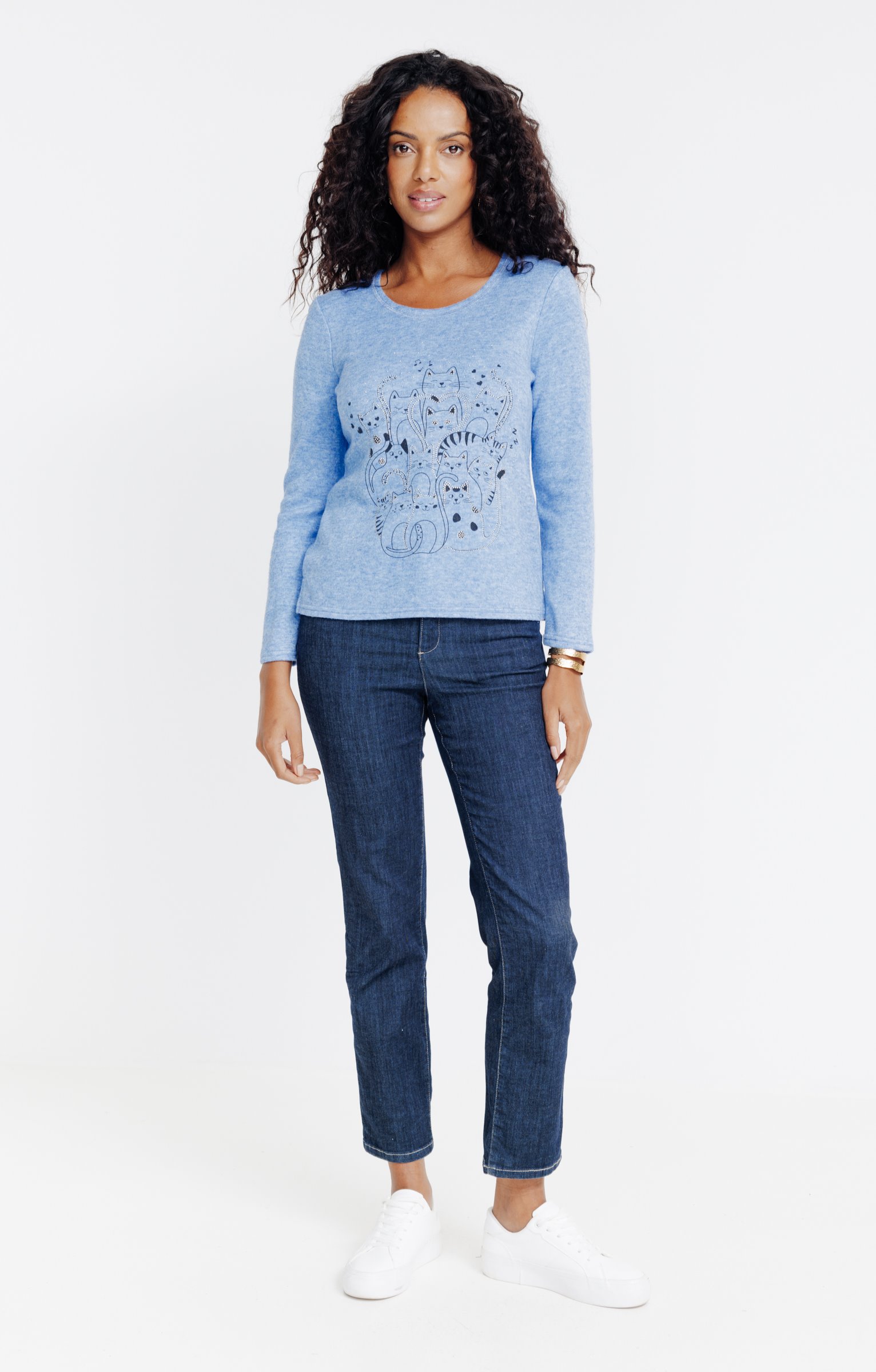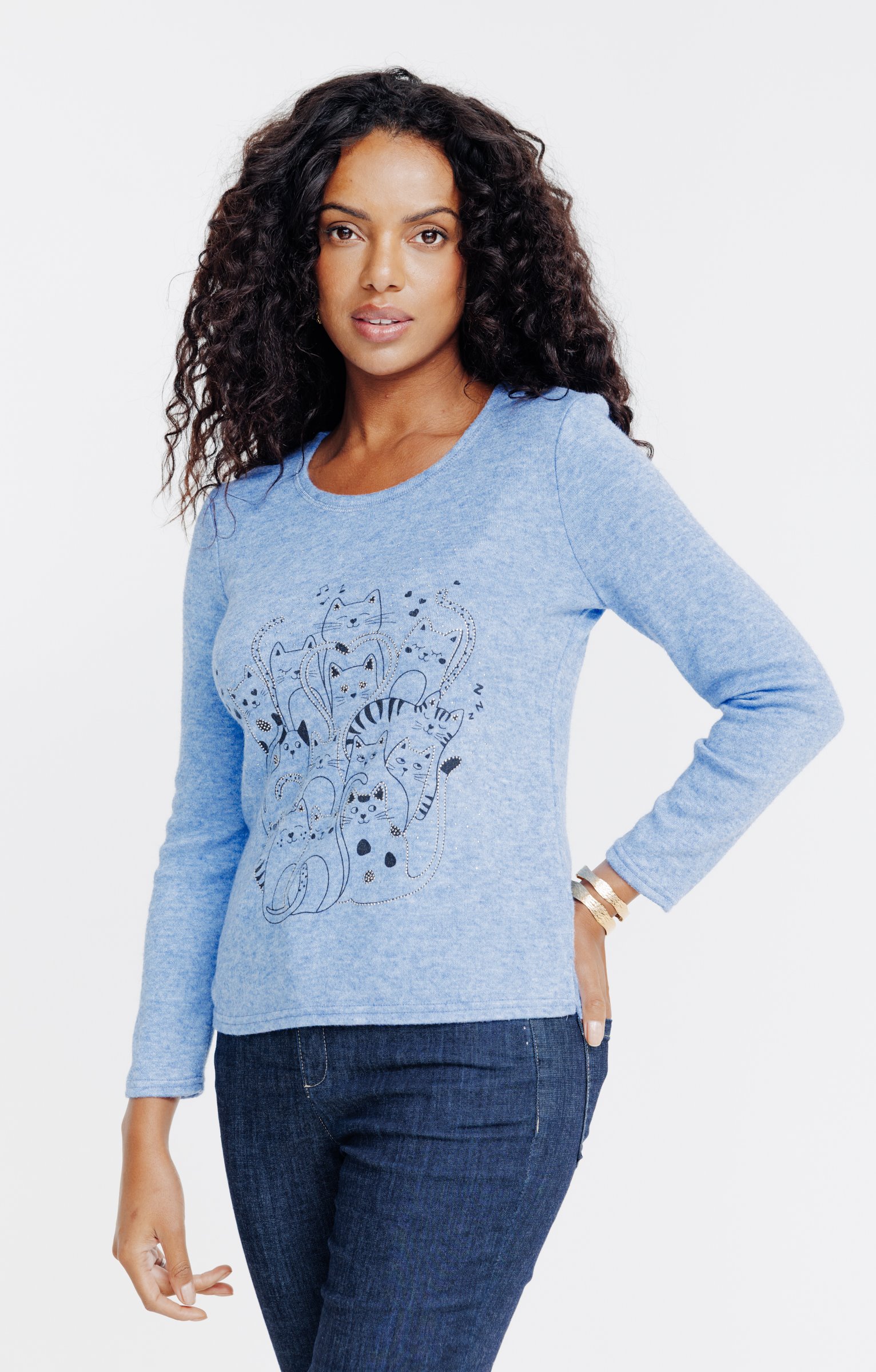 Pull droit à manches longues et col rond. Longueur standard. Imprimé central représentant un groupe de chats stylisés, rehaussé de strass décoratifs. Coloris chiné. Fentes latérales discrètes à la base.