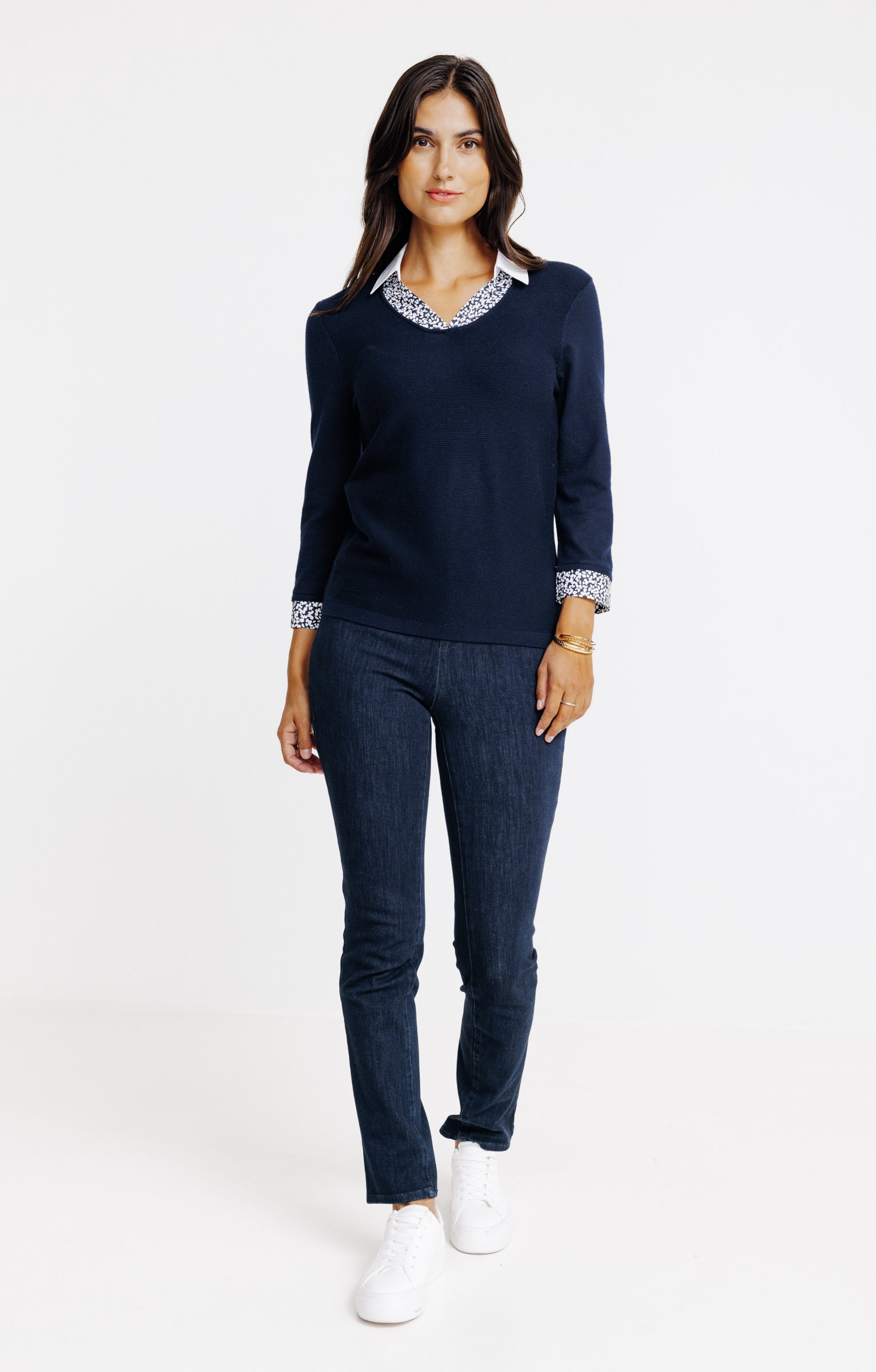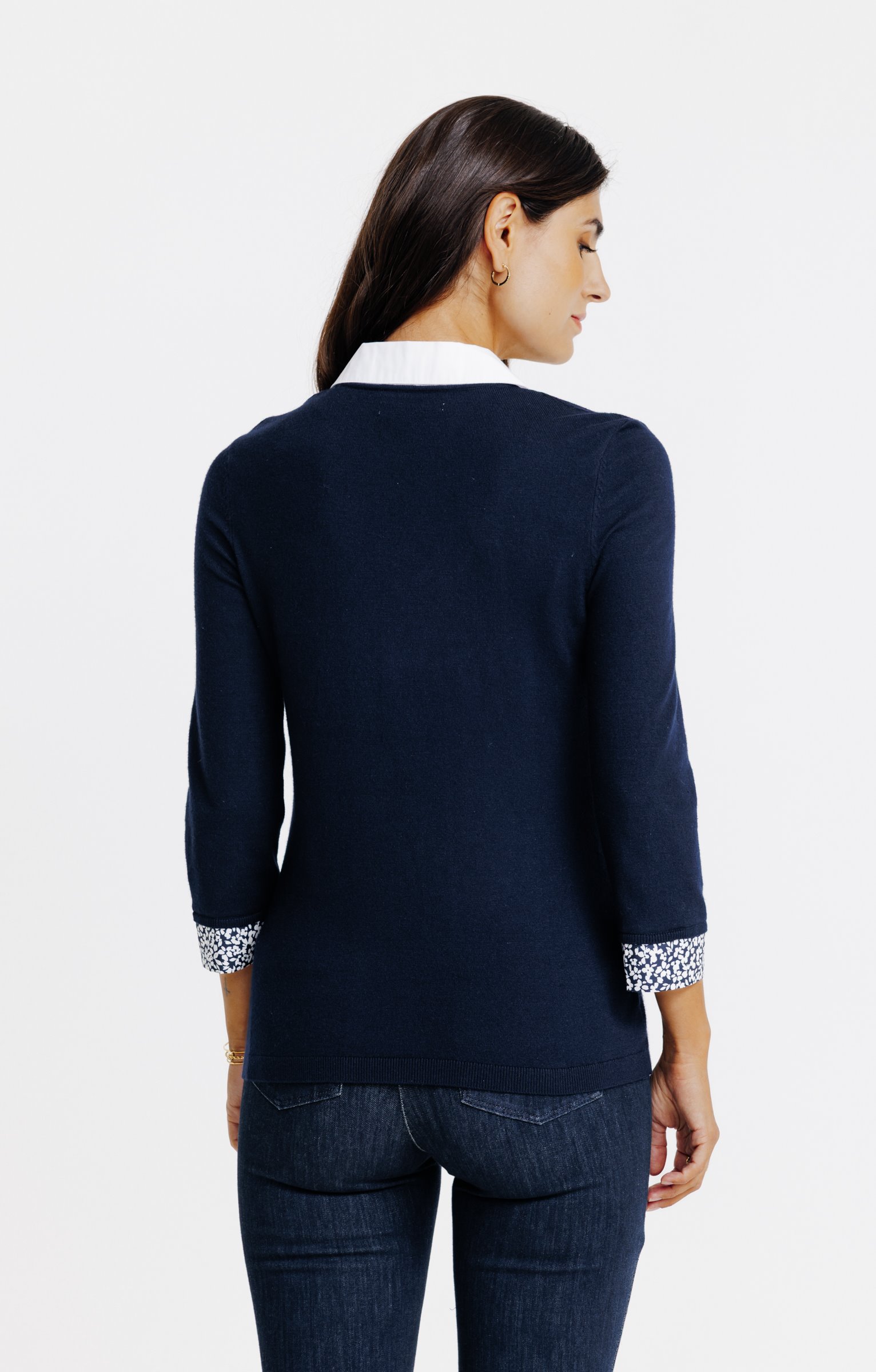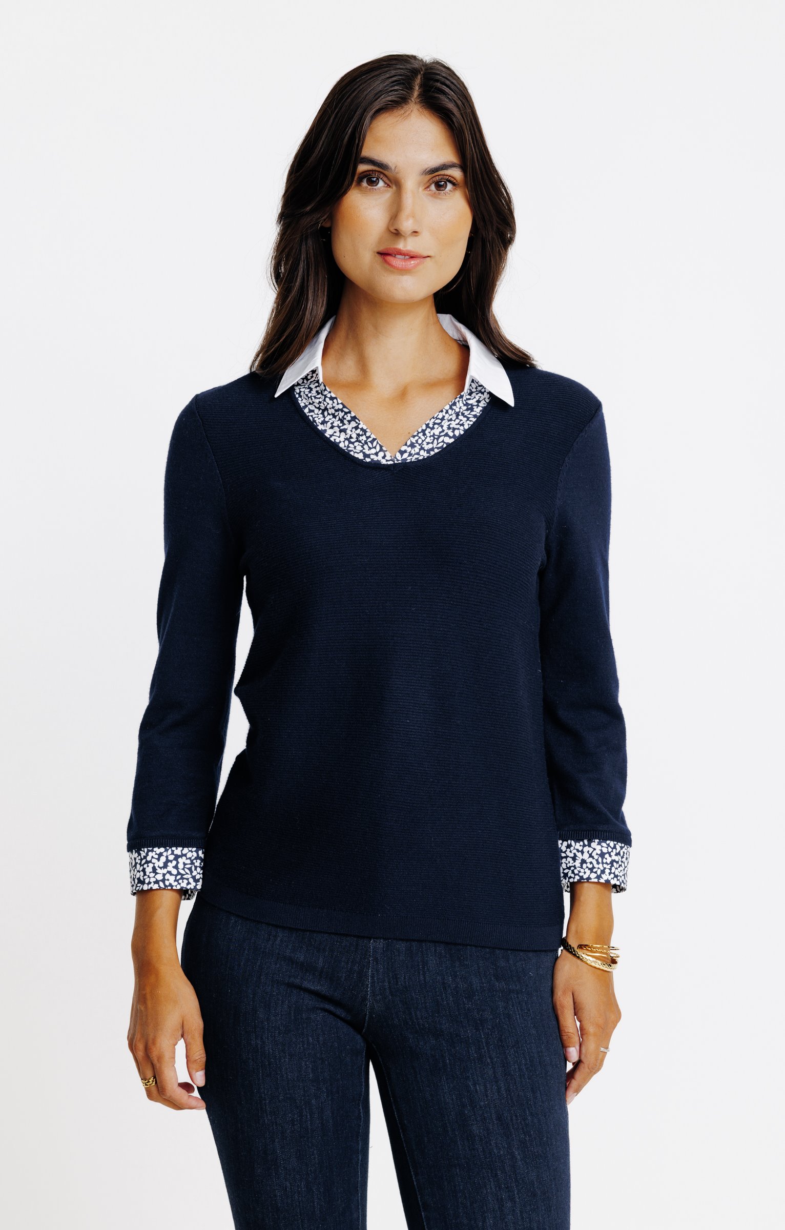 Pull 2-en-1 droit à manches 3/4 avec col chemise contrastant. Encolure en V surmontée d’un col chemise à motif floral et revers de manches assortis. Finition en maille fine à texture côtelée. Longueur standard.