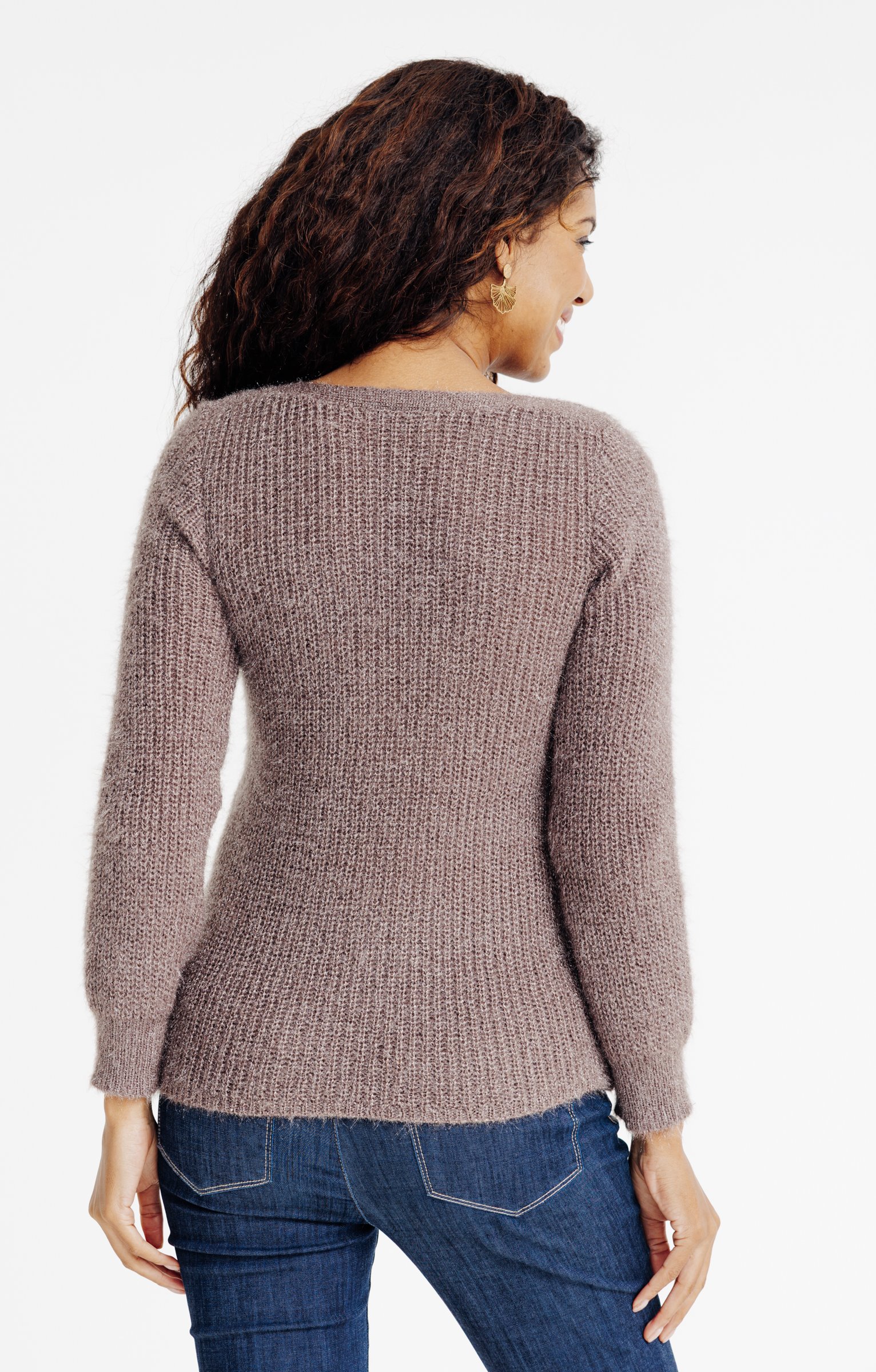 Notre mannequin Bérengère mesure 1m76 et porte un pull taille 1.