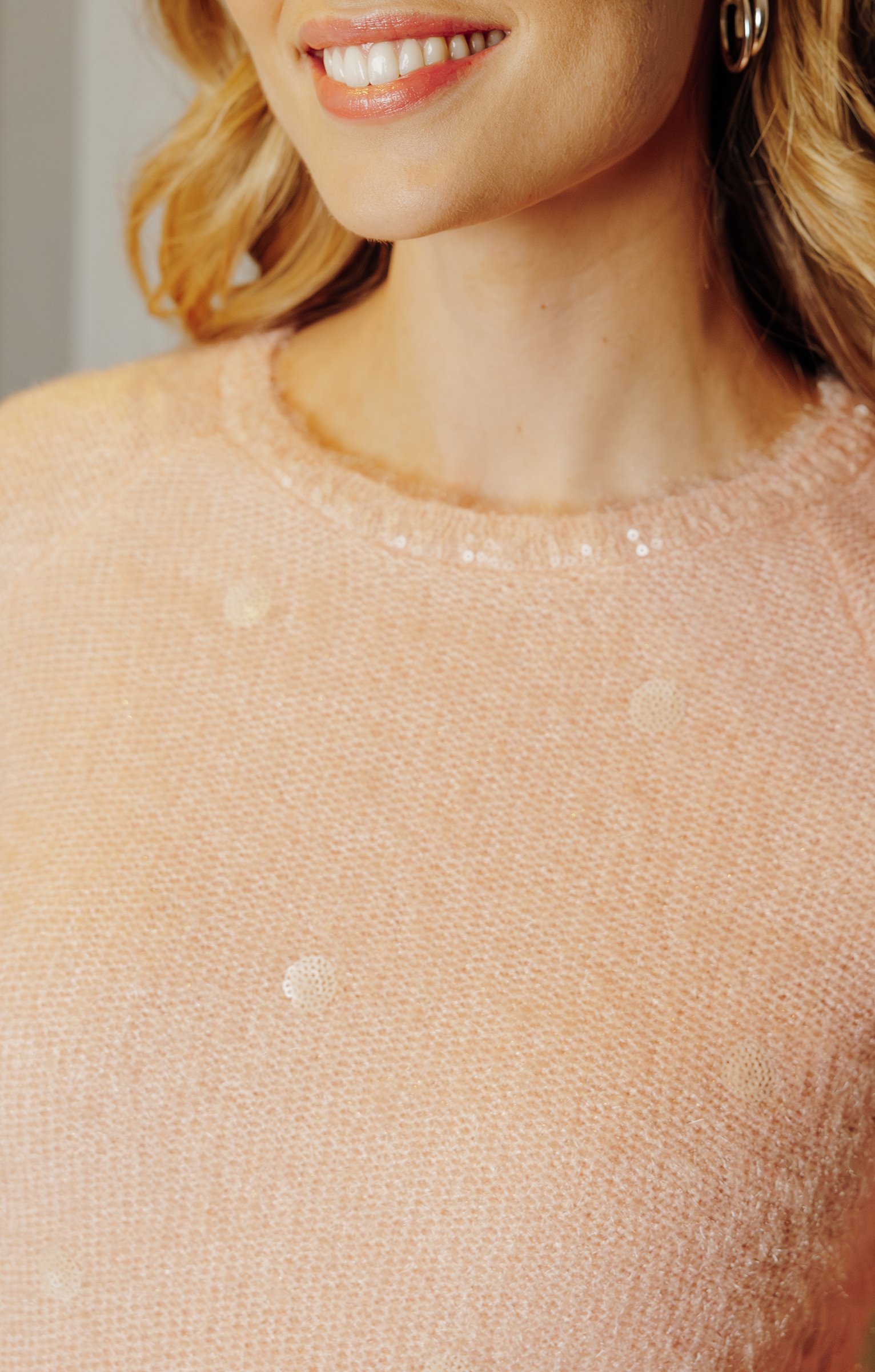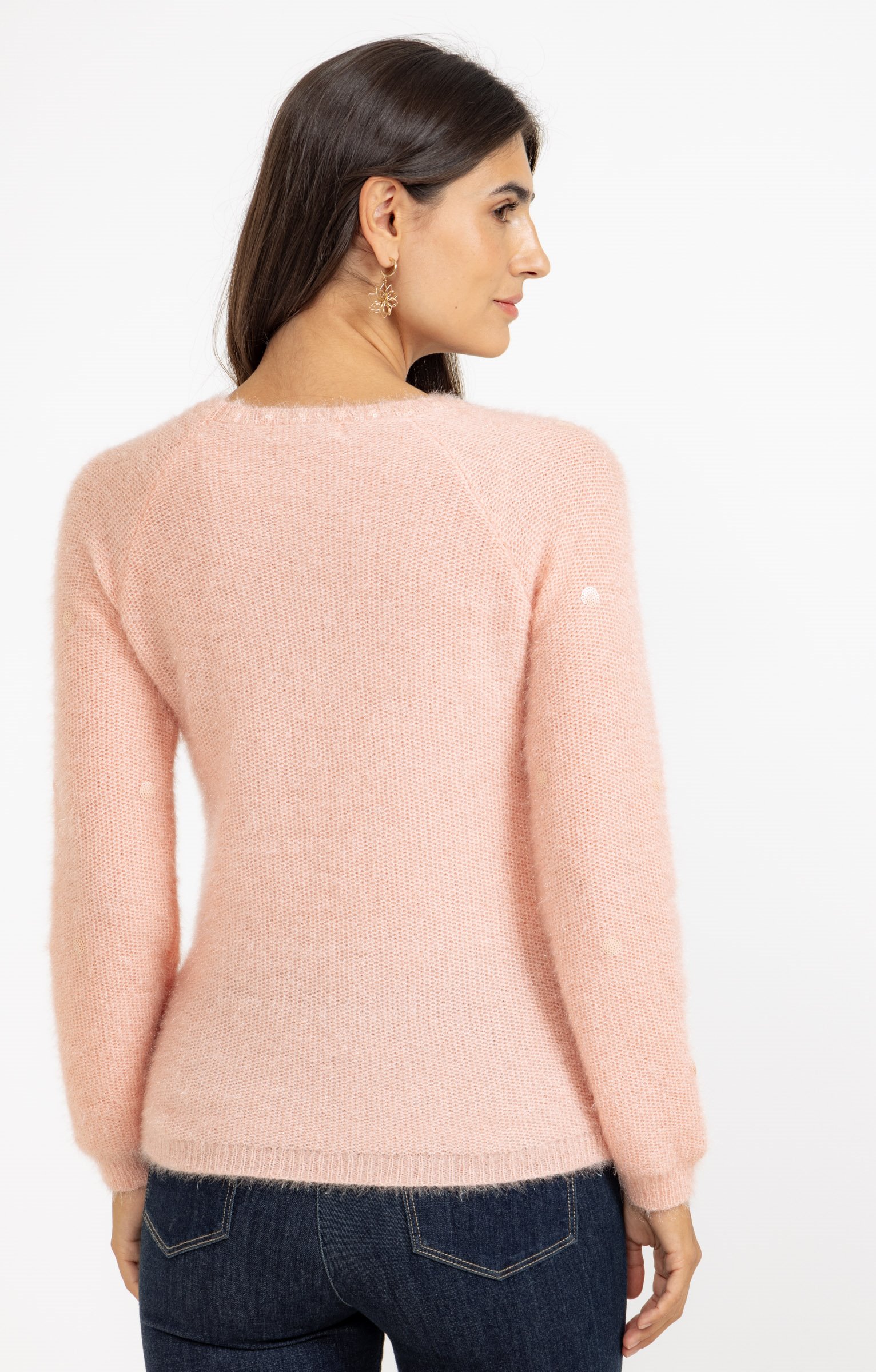 Pull droit à manches longues en maille duveteuse. Col rond orné de paillettes. Détails de pois en strass répartis sur l’ensemble du modèle. Finition bord franc à la base et aux poignets. Coloris uni.