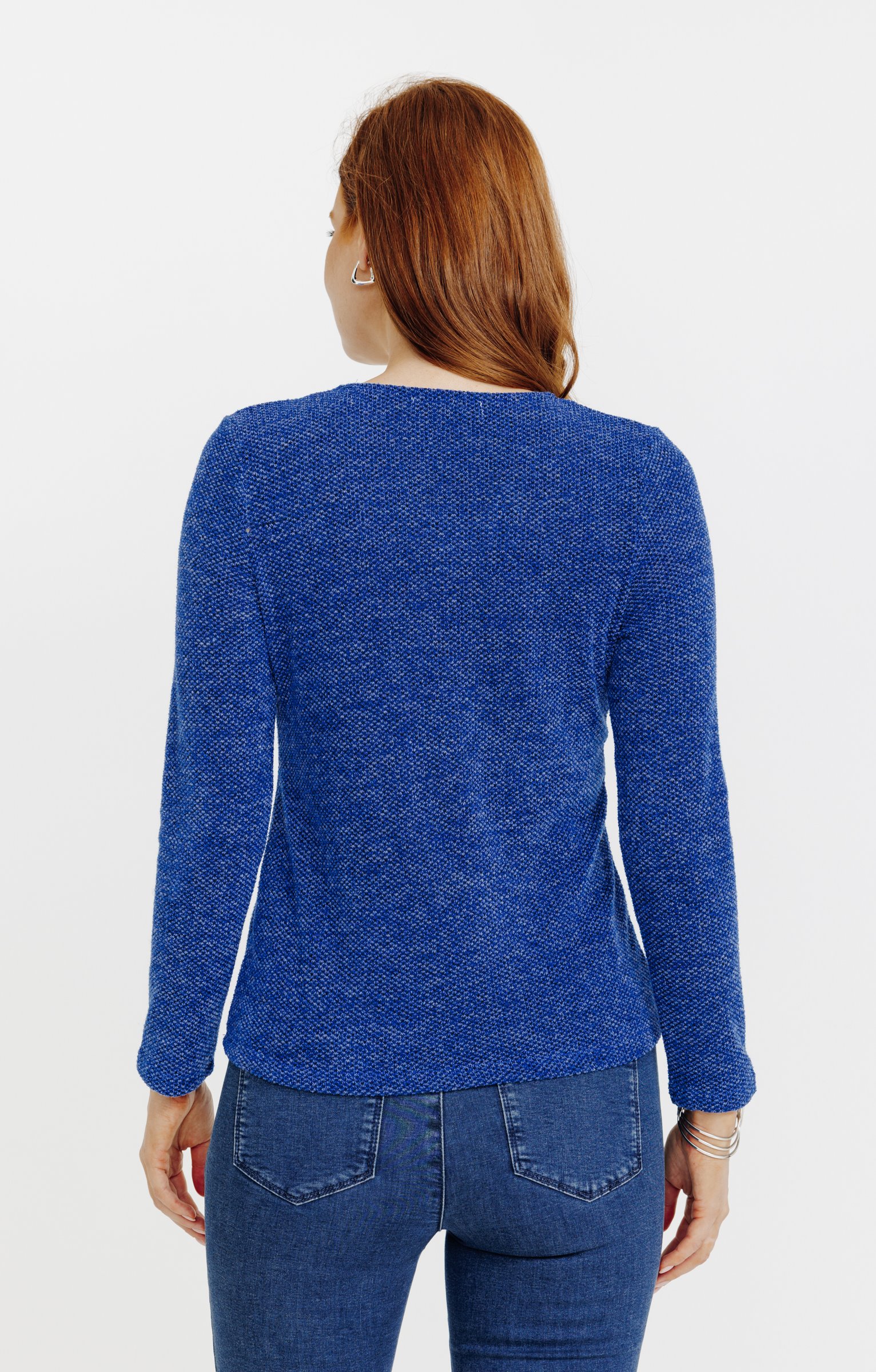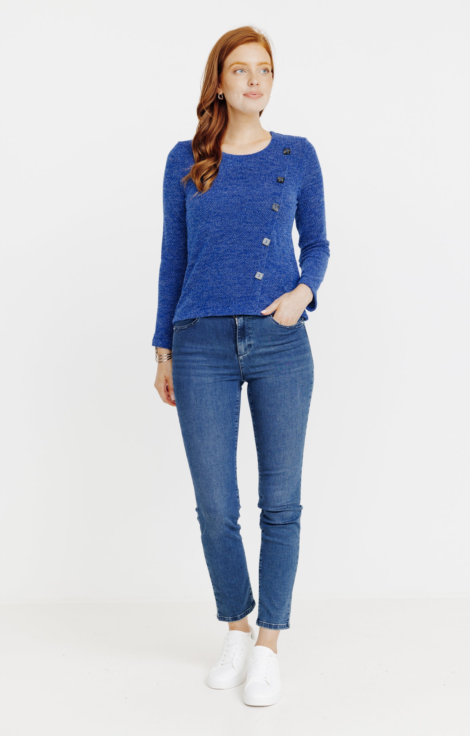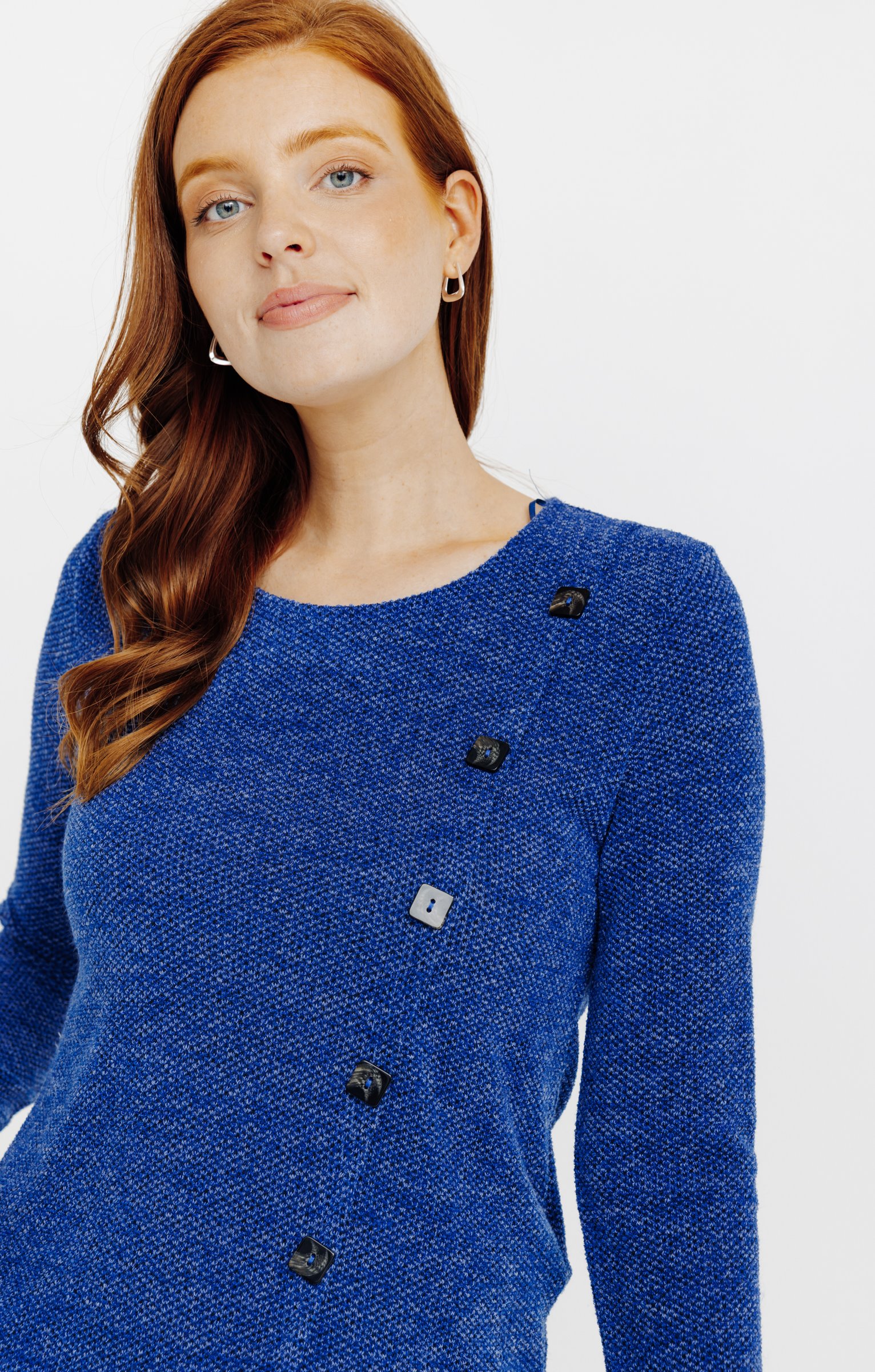 Pull à manches longues de longueur standard. Coupe droite. Col rond. Fausse patte de boutonnage avec des boutons carrés contrastants disposés en diagonale sur le devant. Maille texturée à motif discret en relief. Finition droite à la base et aux poignets.