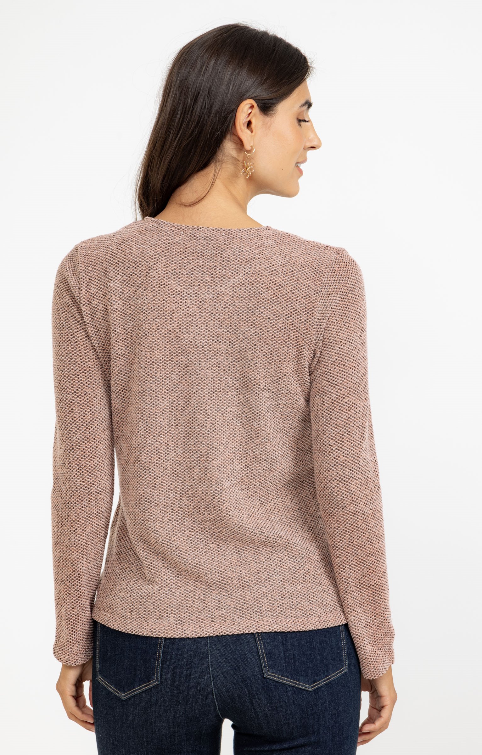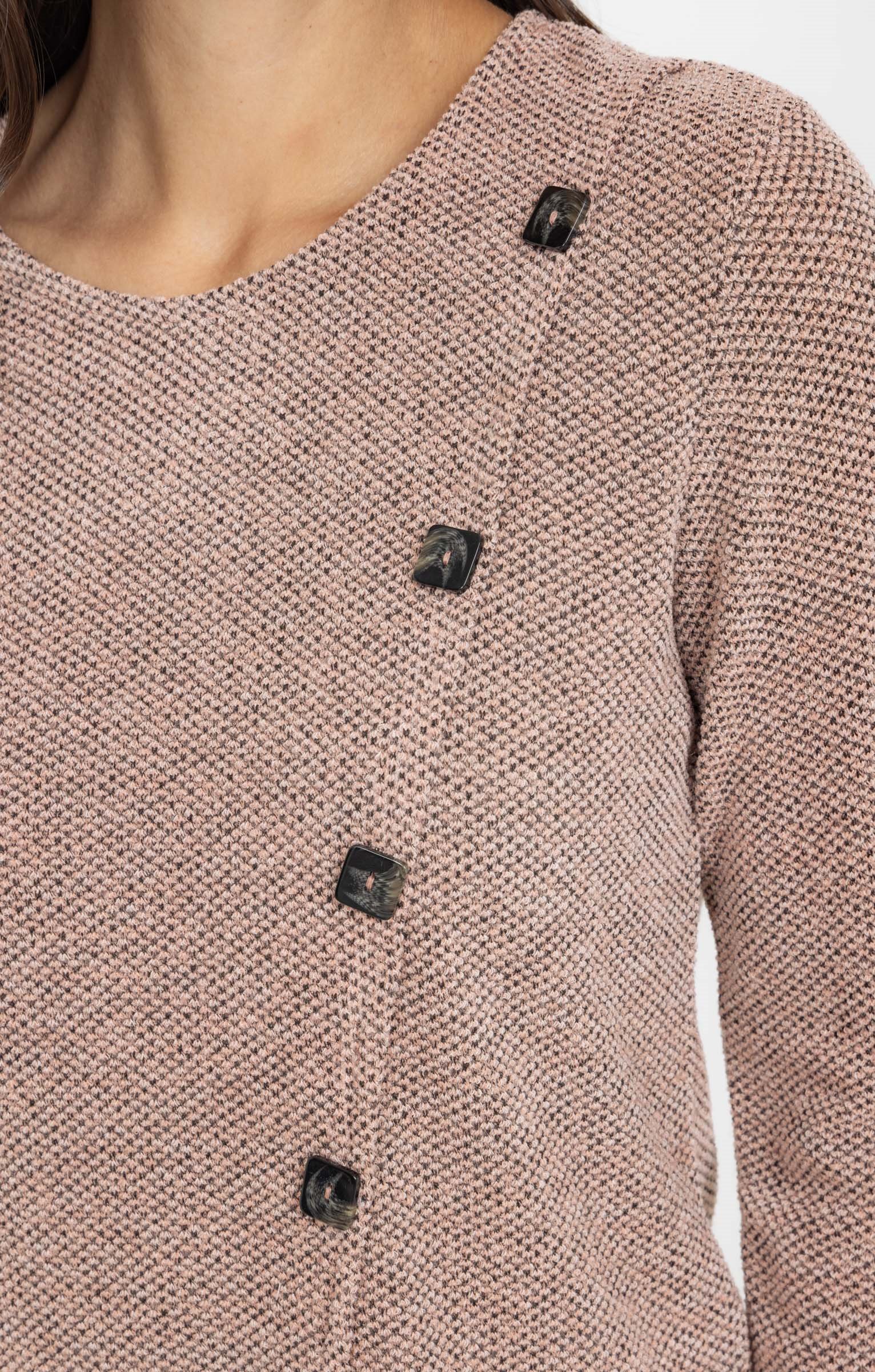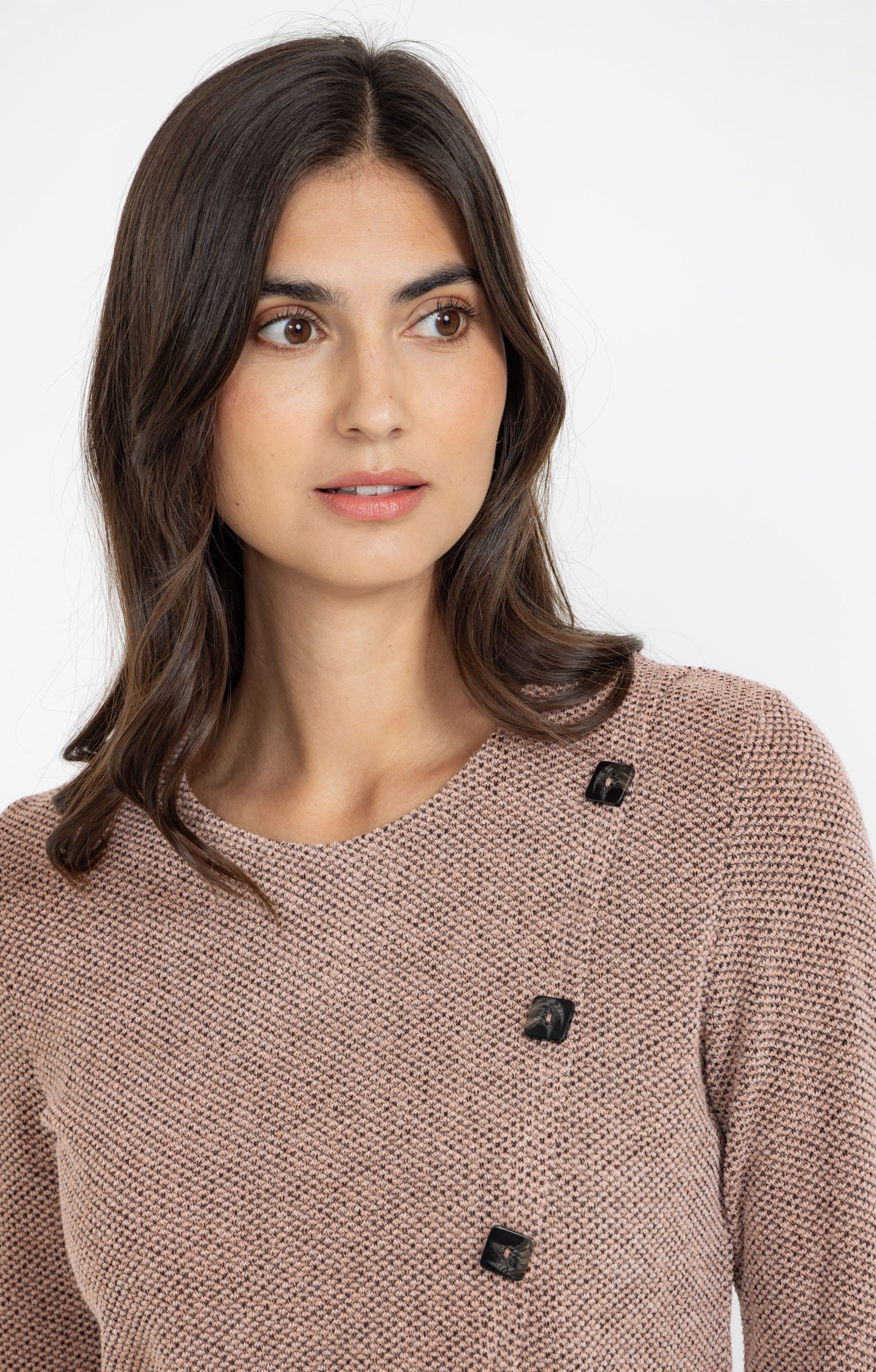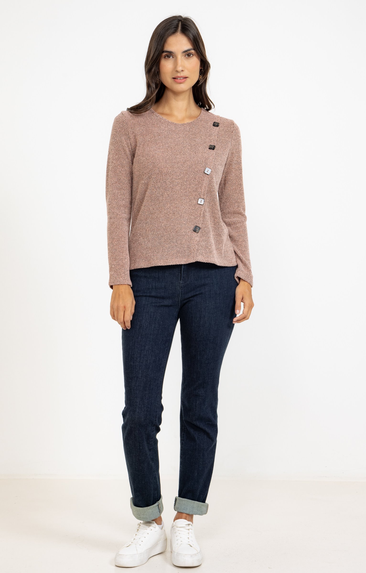 Pull à manches longues de longueur standard. Coupe droite. Col rond. Fausse patte de boutonnage avec des boutons carrés contrastants disposés en diagonale sur le devant. Maille texturée à motif discret en relief. Finition droite à la base et aux poignets.