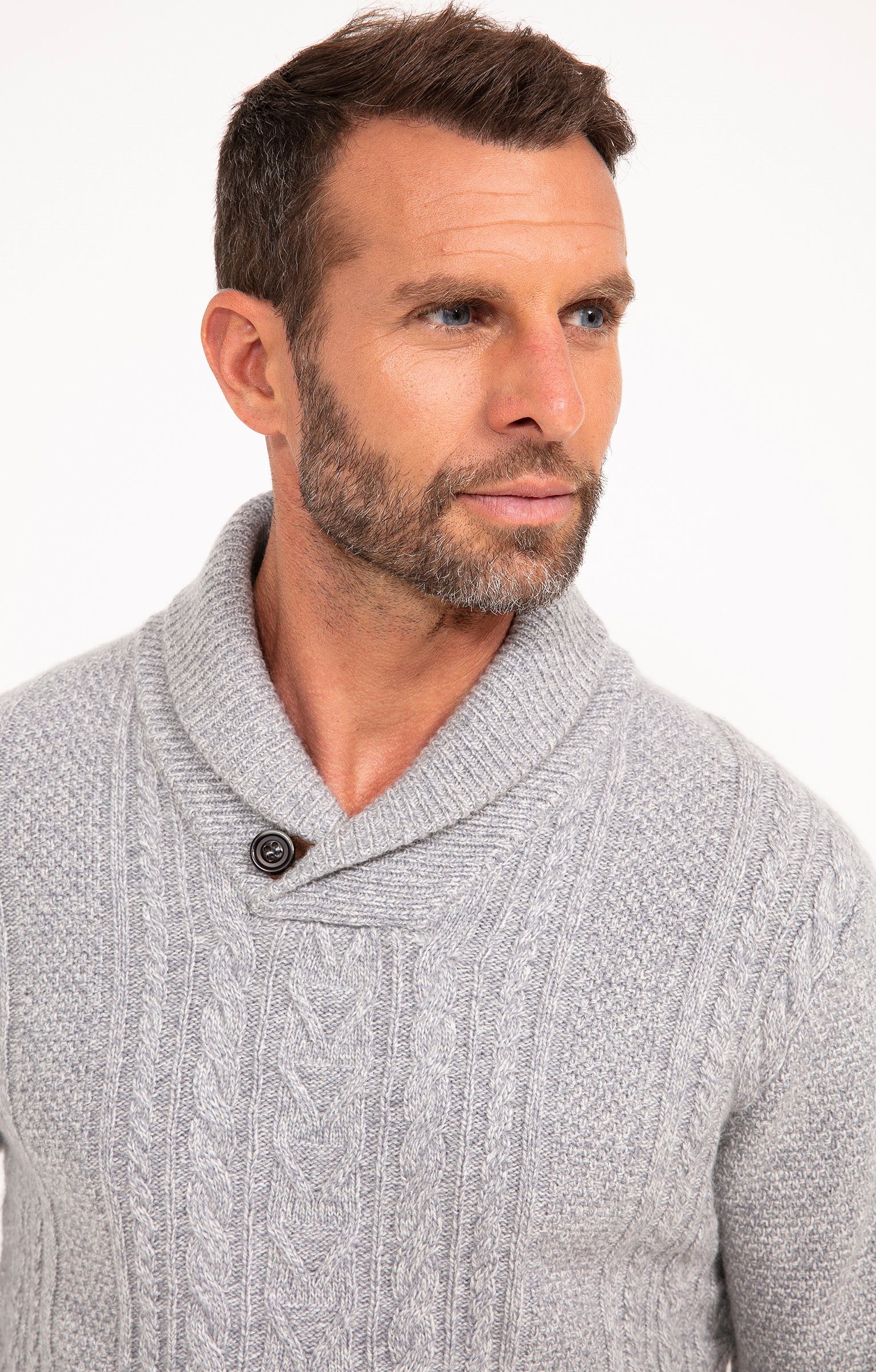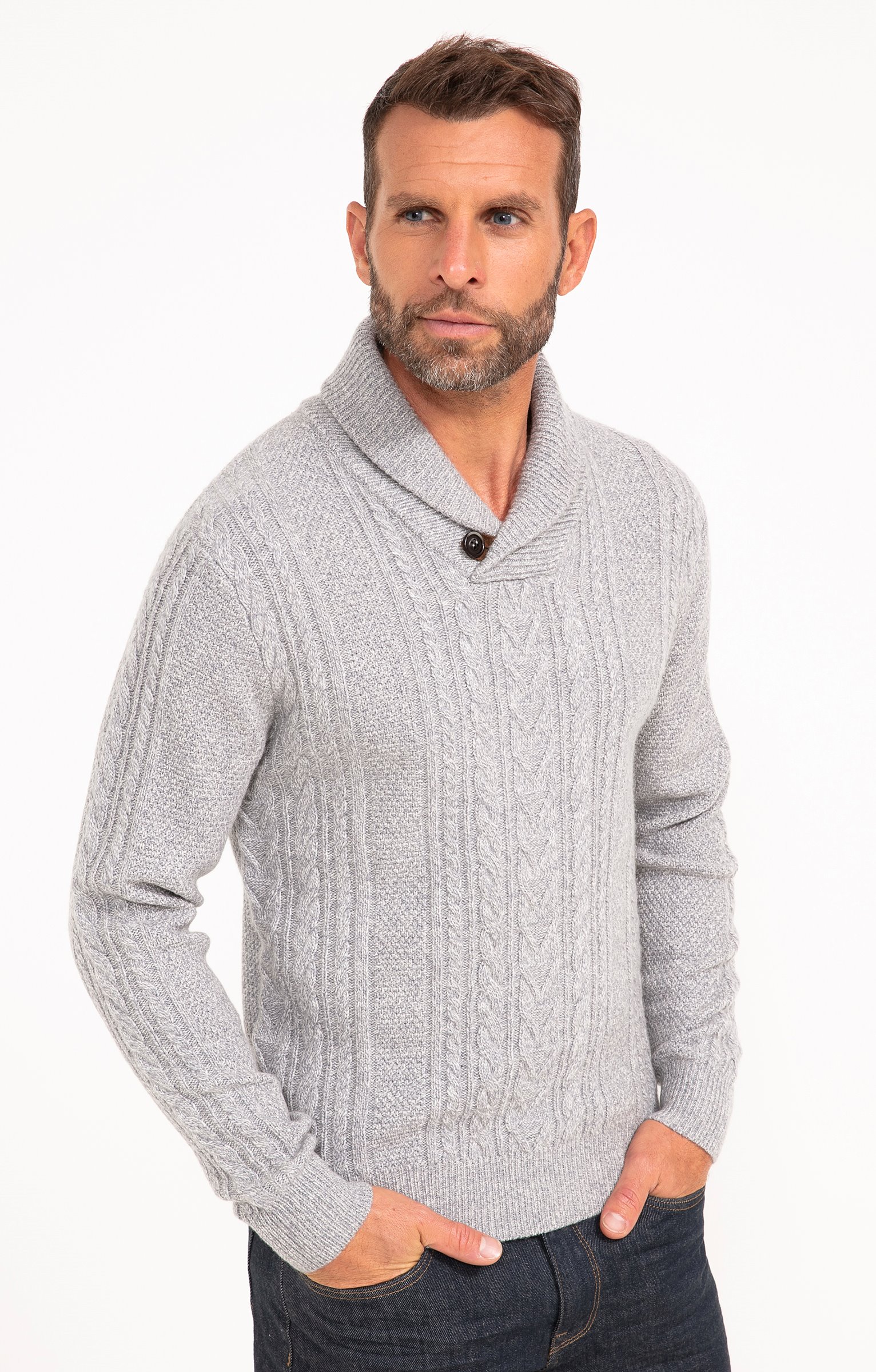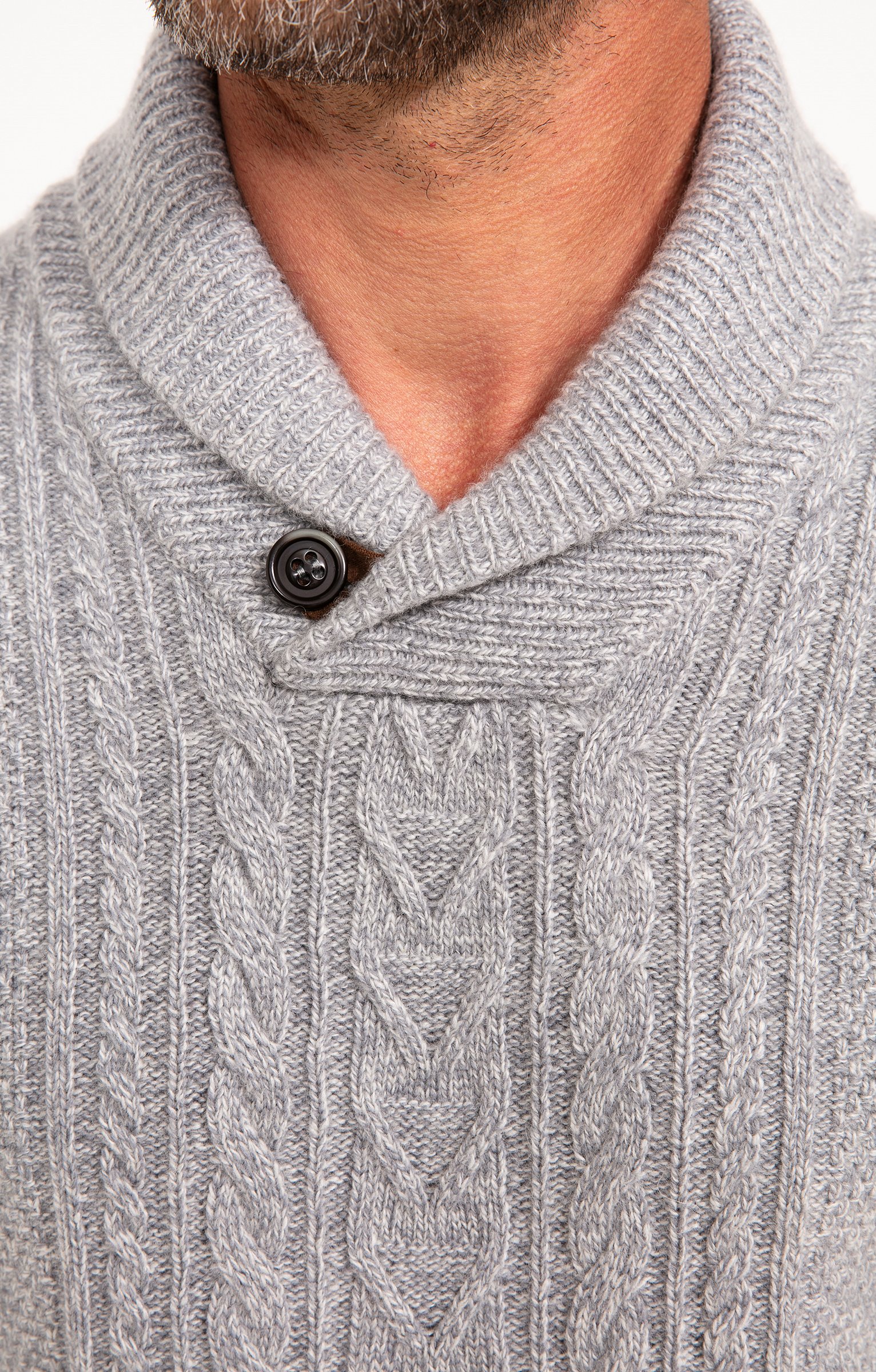 Pull uni en maille torsadée à manches longues et col châle avec détail bouton. Coupe droite. Manches longues. Col châle. Coloris uni. Tissu en maille épaisse torsadée devant et aux manches. Maille simple au dos. Col aux finitions côtelées avec détail gros bouton contrastant. Larges bord-côtes en finition des poignets et de la base. Composition contenant de la laine.