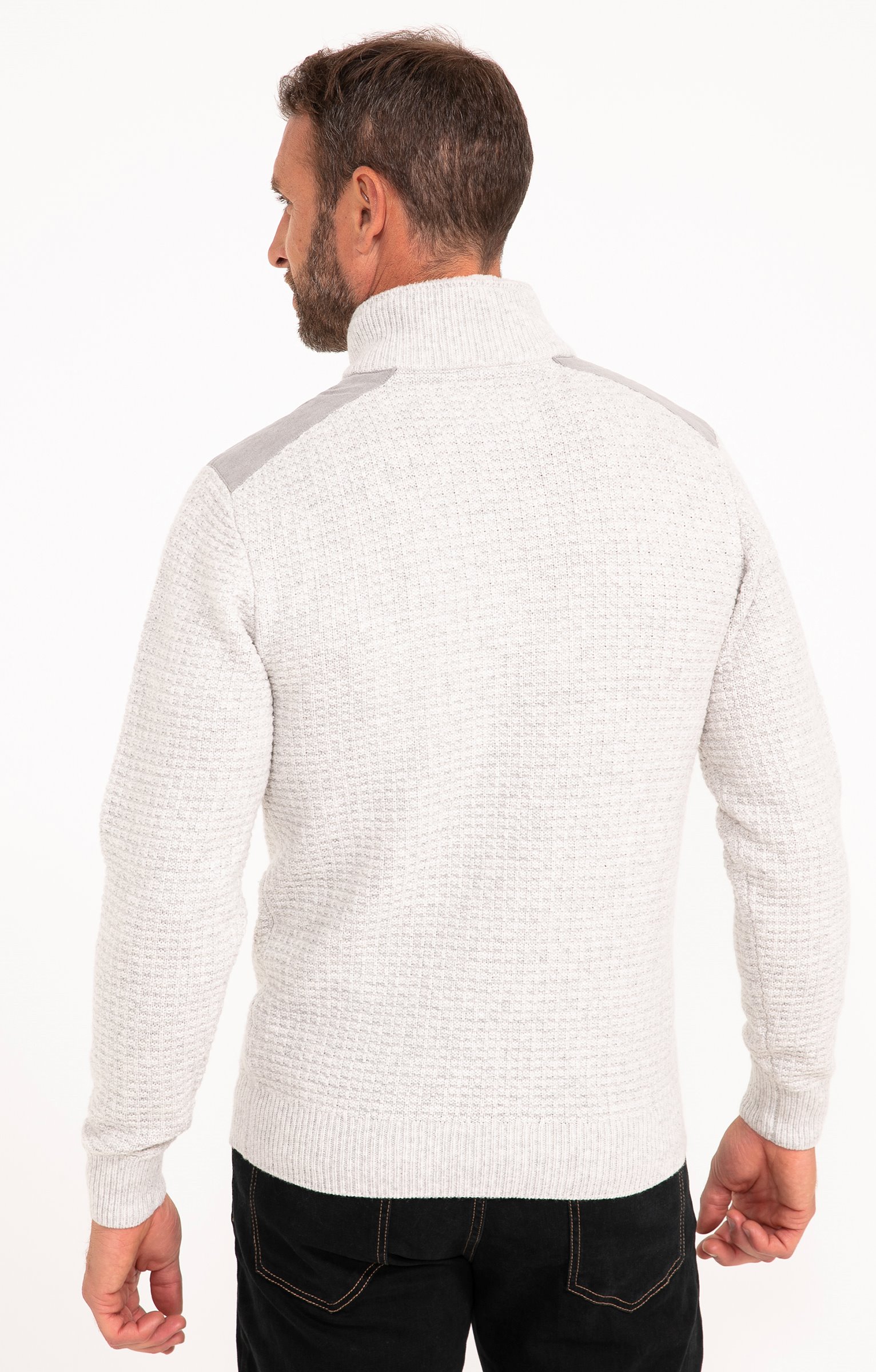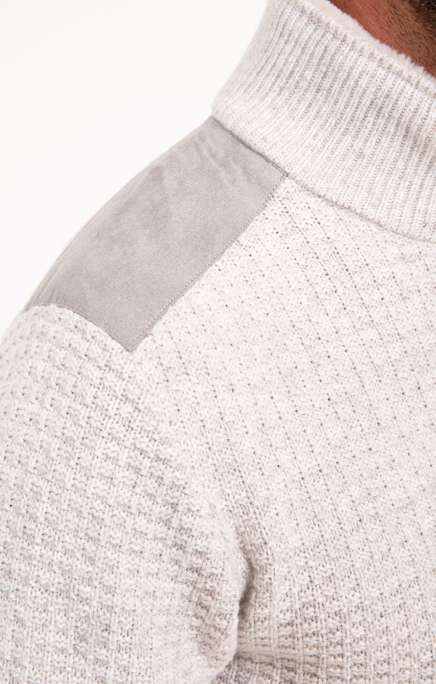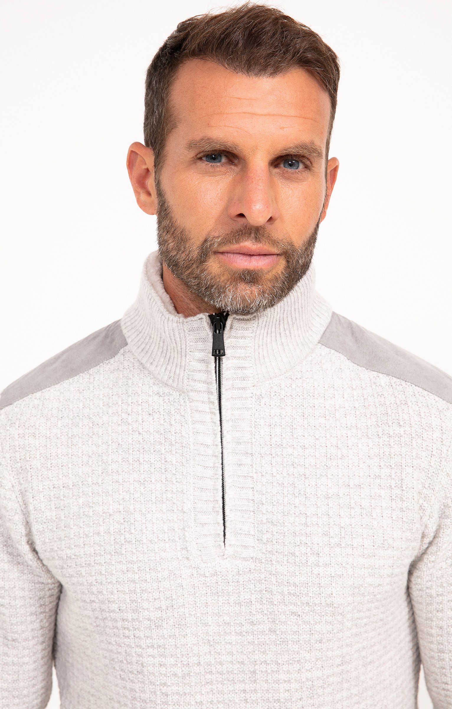 Pull uni en maille avec empiècements à manches longues et col montant zippé. Coupe droite. Manches longues. Col montant à zip. Coloris uni. Tissu en maille épaisse texturée. Empiècement en tissu suédé aux épaules. Intérieur col avec finition façon fourrure. Larges bord-côtes au col, à la base et aux poignets. Composition contenant de la laine.