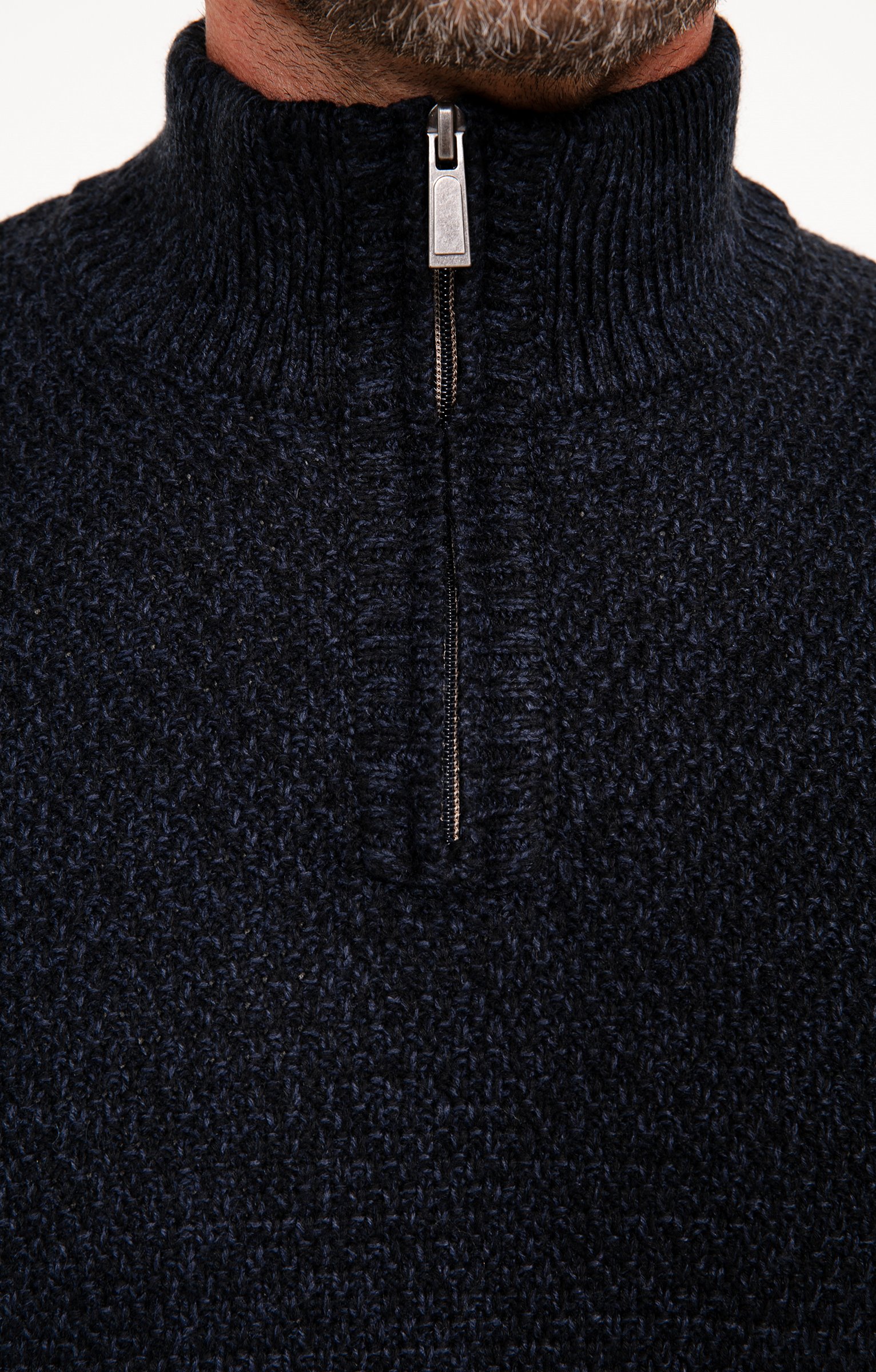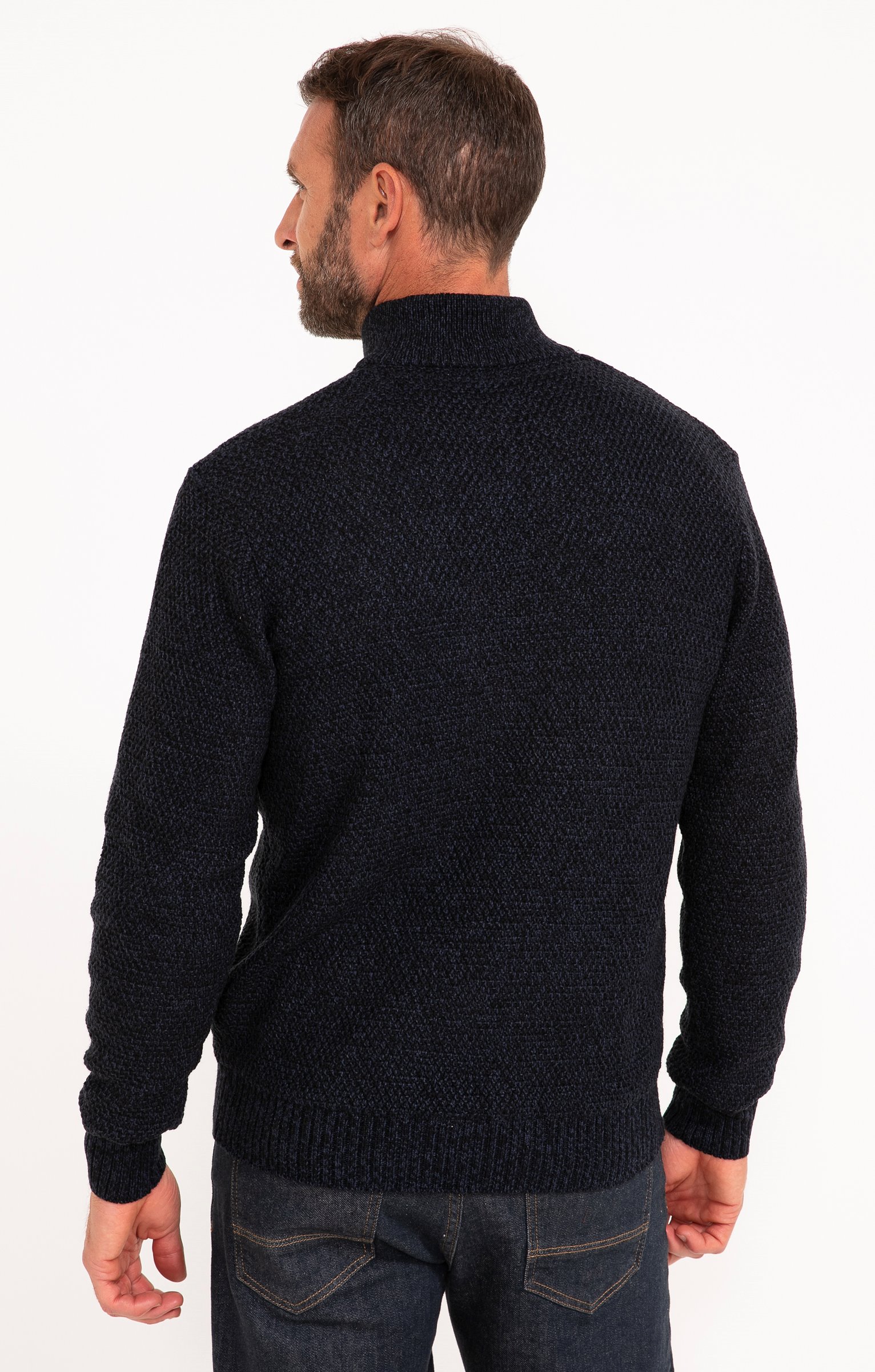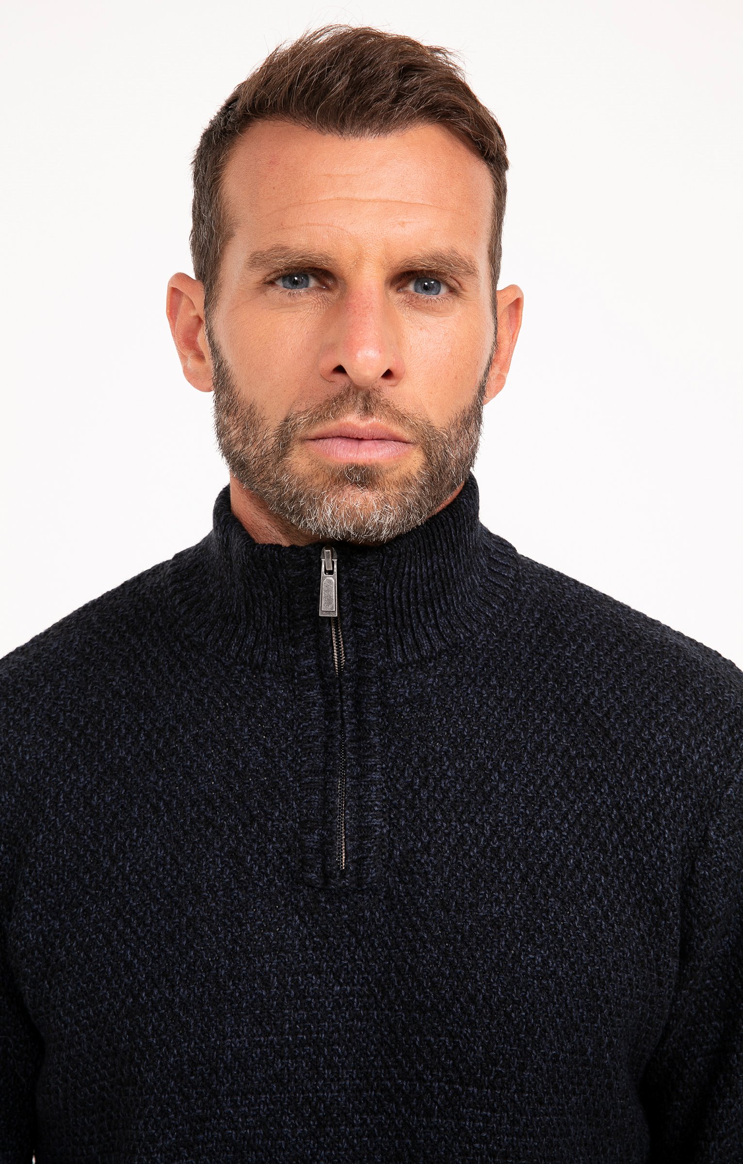 Pull en maille épaisse texturée unie à manches longues et col montant à zip. Coupe droite. Manches longues. Col montant à zip. Coloris uni. Tissu en maille épaisse texturée aspect chiné. Modèle avec doublure. Larges bord-côtes en finition du col, de la base et des poignets. Base droite.
