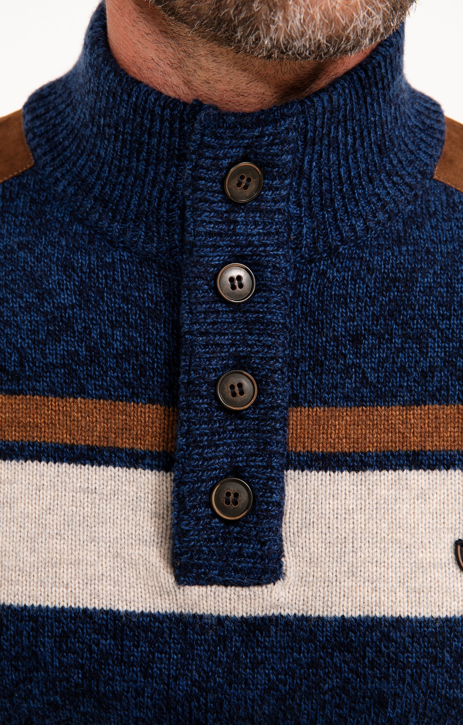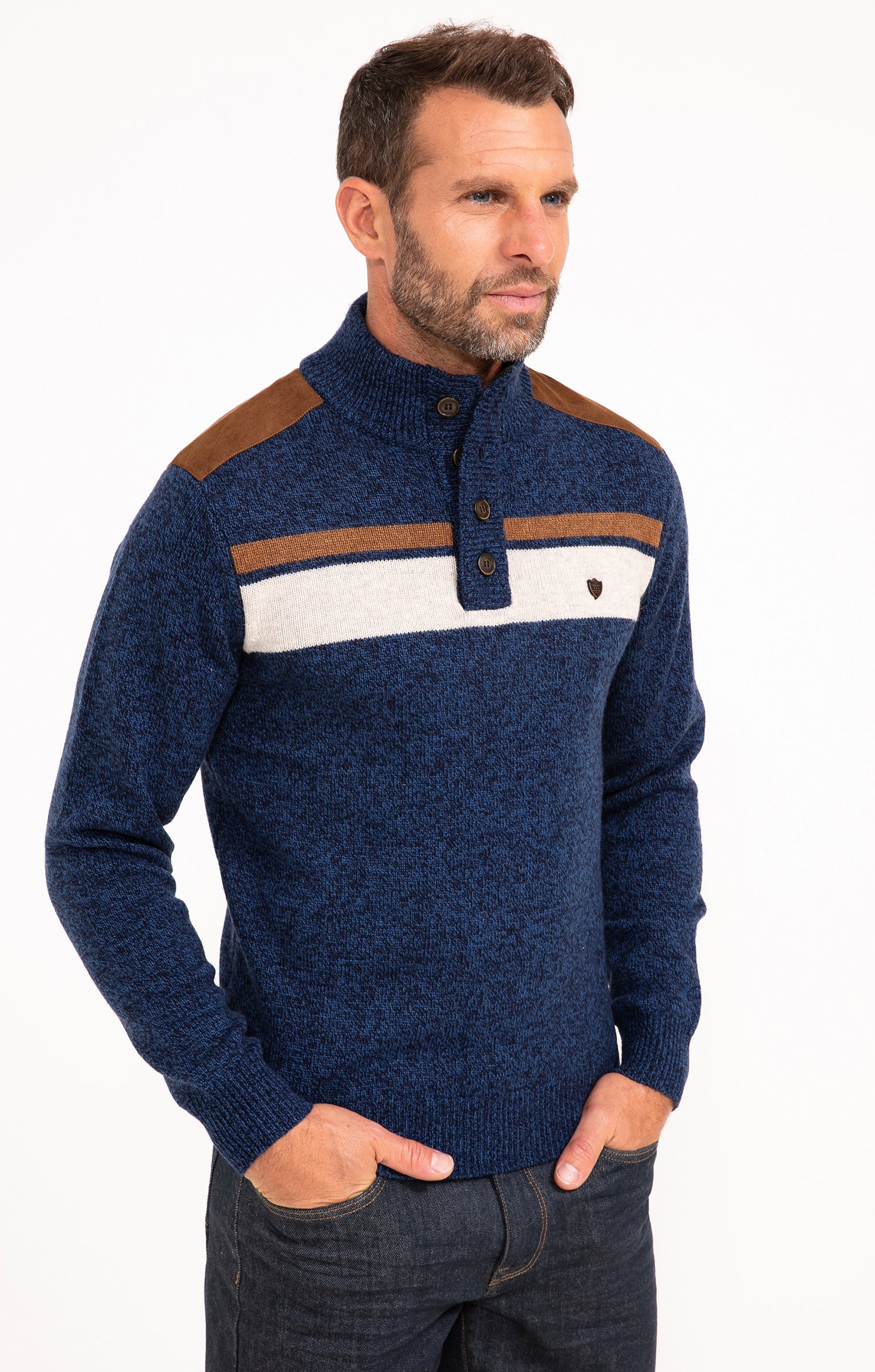 Pull à manches longues et col montant boutonné en maille avec rayures et empiècements. Coupe droite. Manches longues. Col montant boutonné. 2 bandes horizontales contrastantes sur la poitrine devant. Empiècements en tissu suédé aux épaules. Tissu en maille chaude chinée. Petit écusson cousu sur la poitrine. Bord-côtes en finition du col, de la base et des poignets. Composition contenant de la laine.