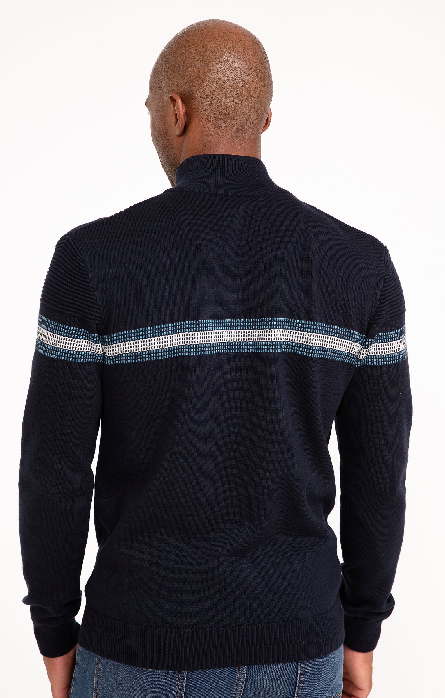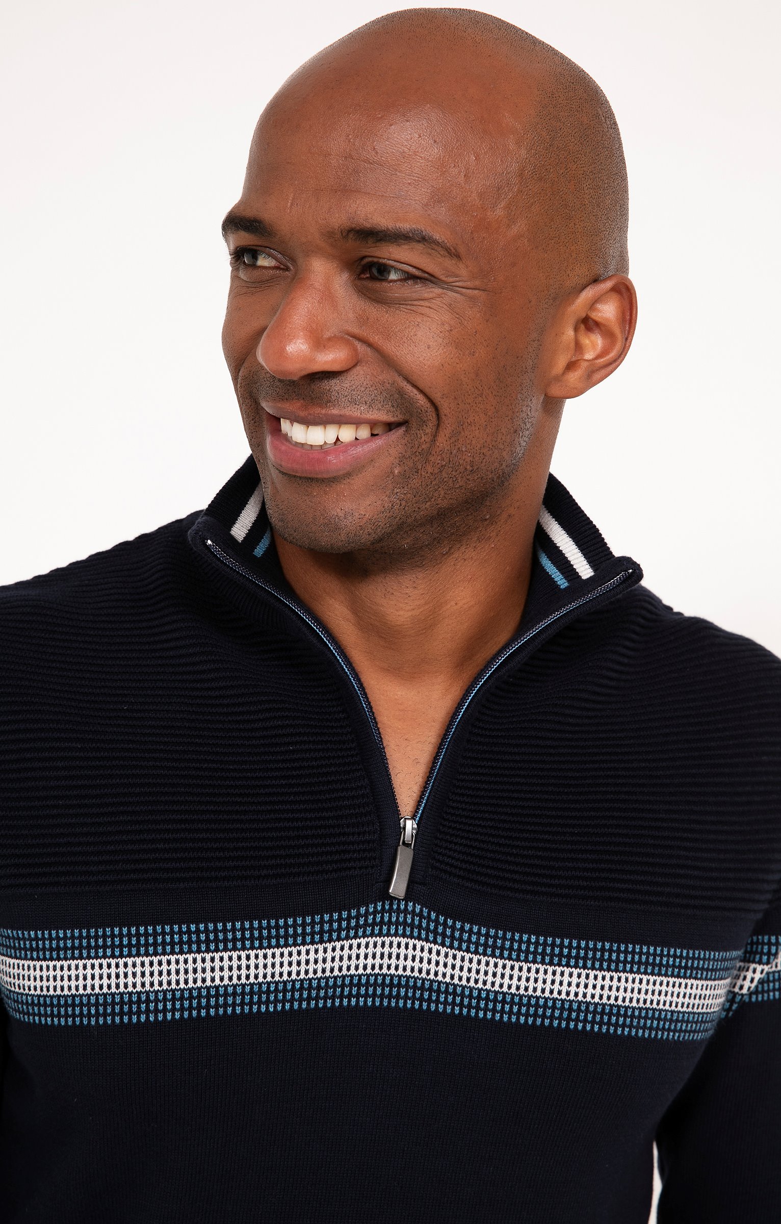Pull à col montant zippé avec motif rayé contrastant. Coupe droite. Manches longues. Col montant en maille côtelée avec rayures contrastantes à l’intérieur. Fermeture zippée avec tire-zip métallique. Motif rayé multicolore en bande horizontale sur la poitrine et les manches. Haut du buste et épaules en maille texturée. Poignets et base en bords-côtes. Notre mannequin Marvin mesure 1m87 et porte un pull taille M.