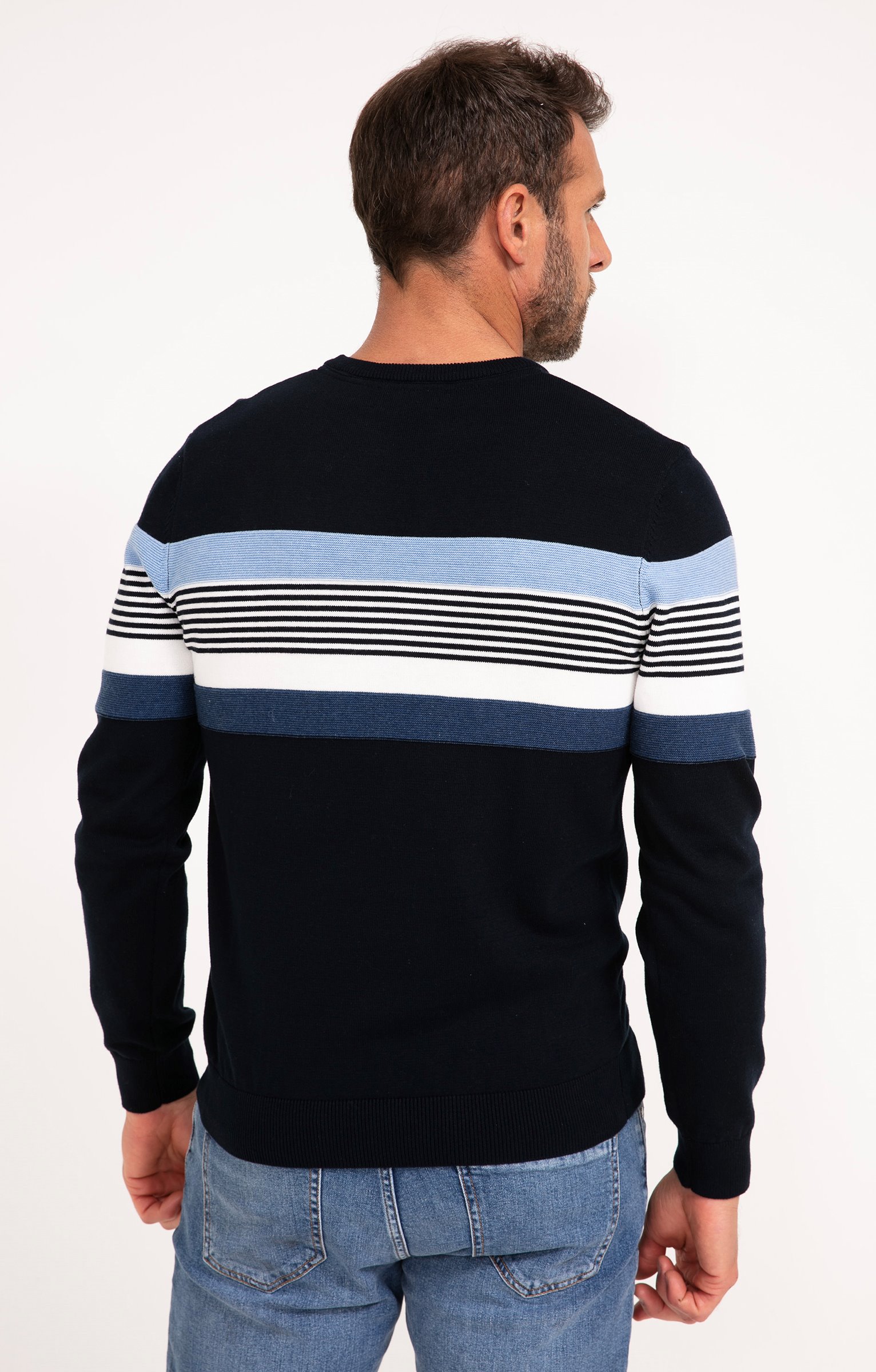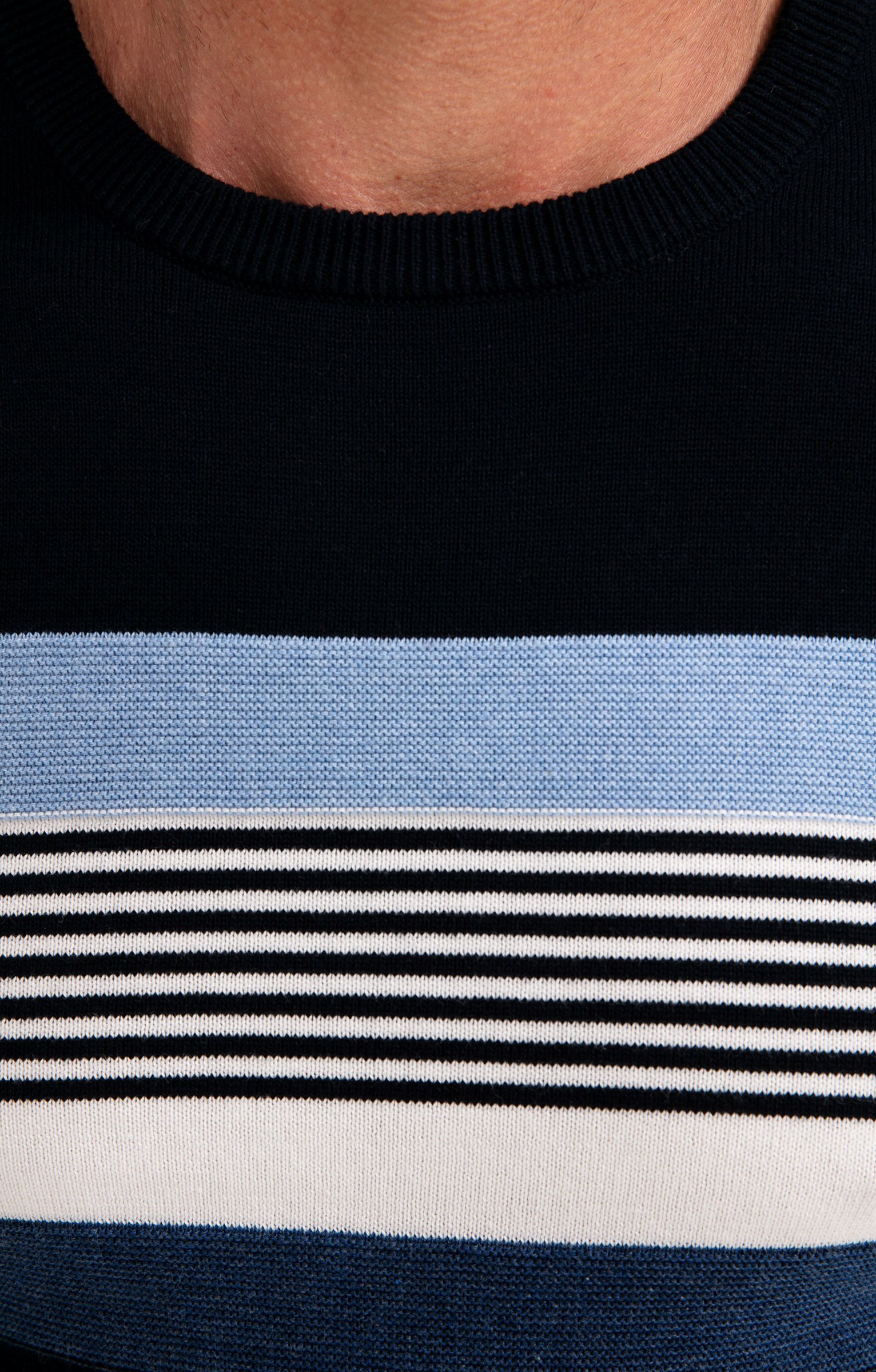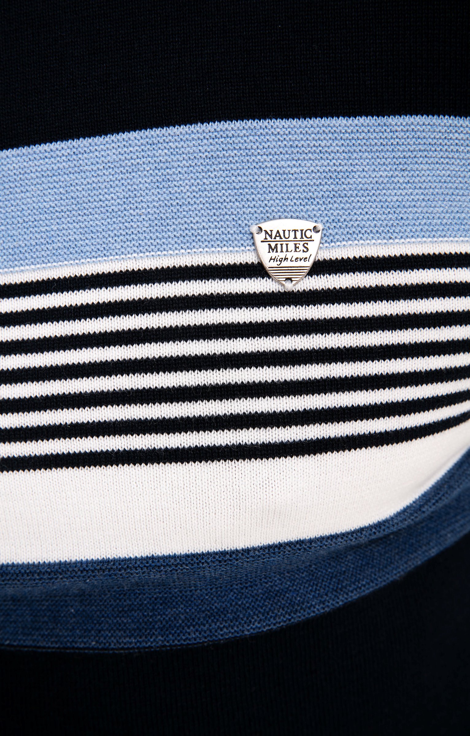 Pull à manches longues et col rond avec rayures placées. Coupe droite. Manches longues. Col rond côtelé. Motifs rayés placés en haut du buste et des manches. Mix fines rayures et larges bandes. Tissu en maille chaude. Petit écusson aspect métallique gravé cousu sur la poitrine. Larges bord-côtes en finition de la base et des poignets. Base droite.