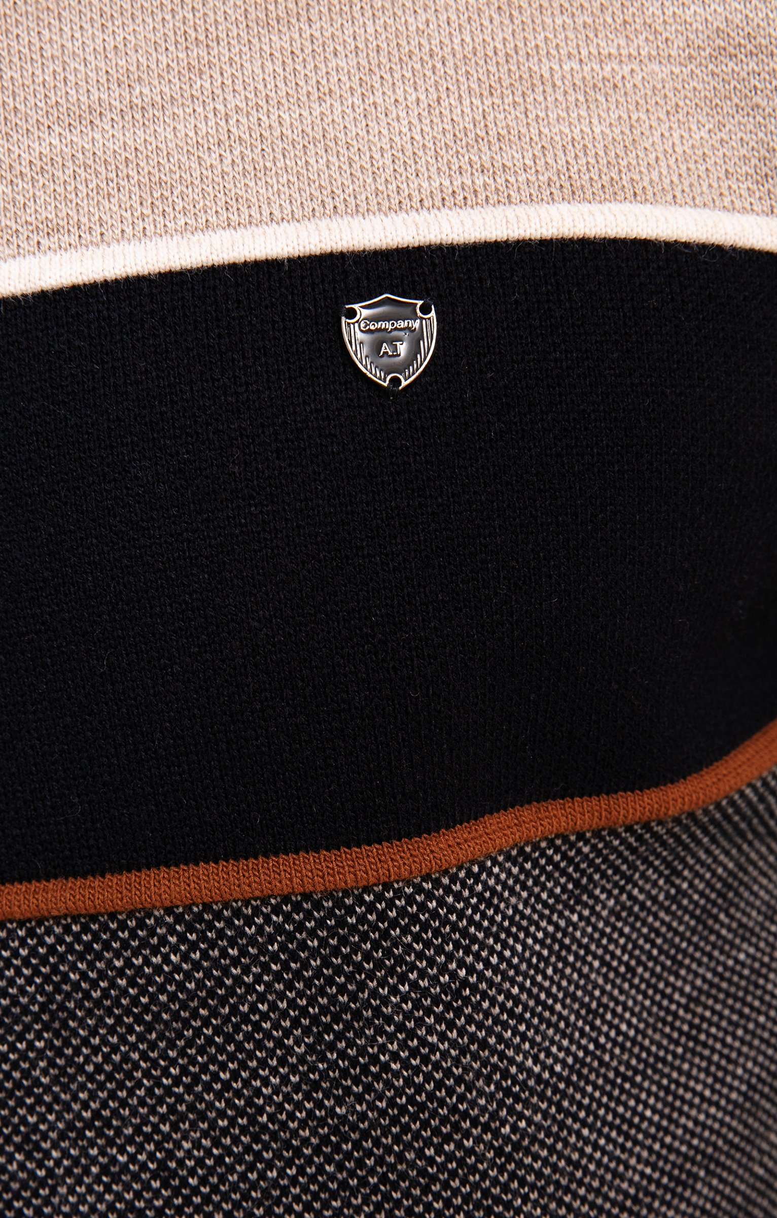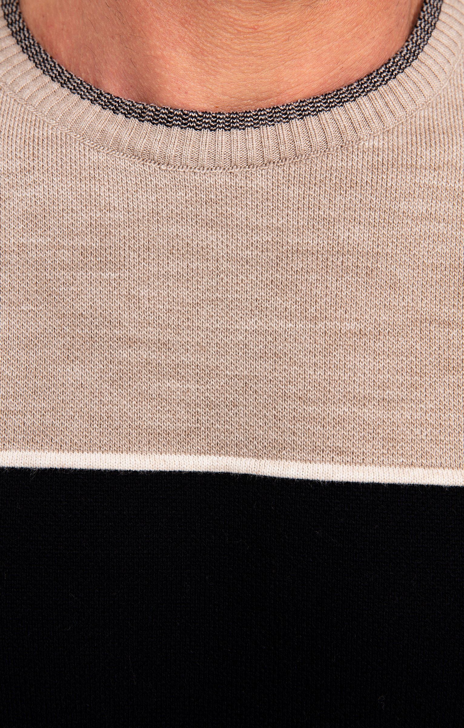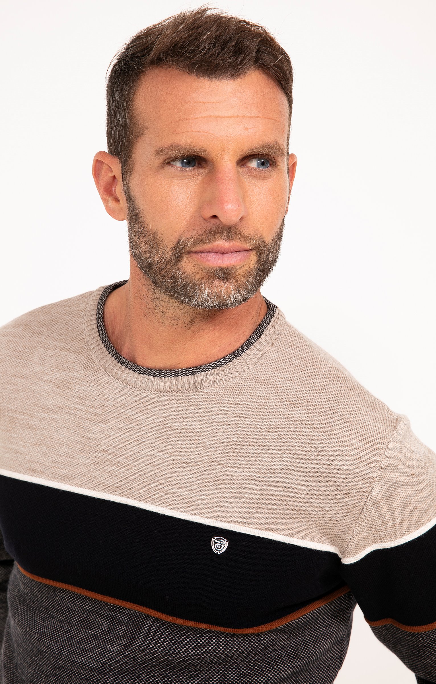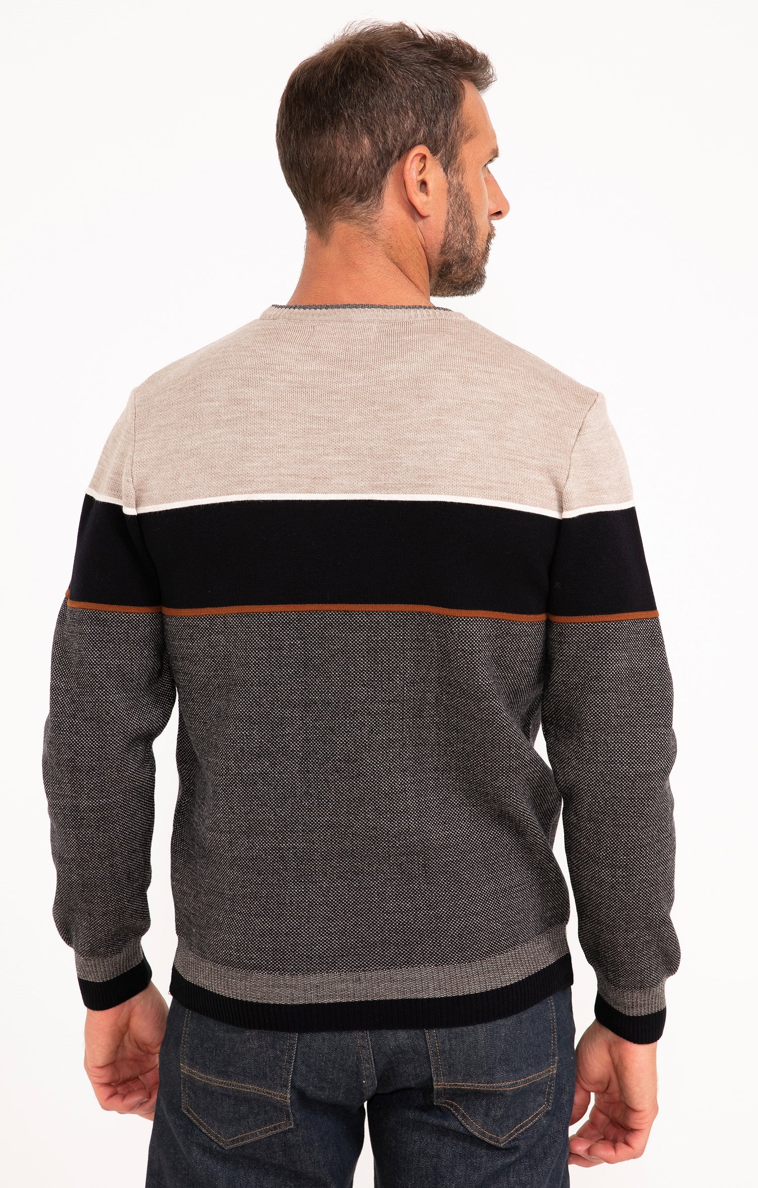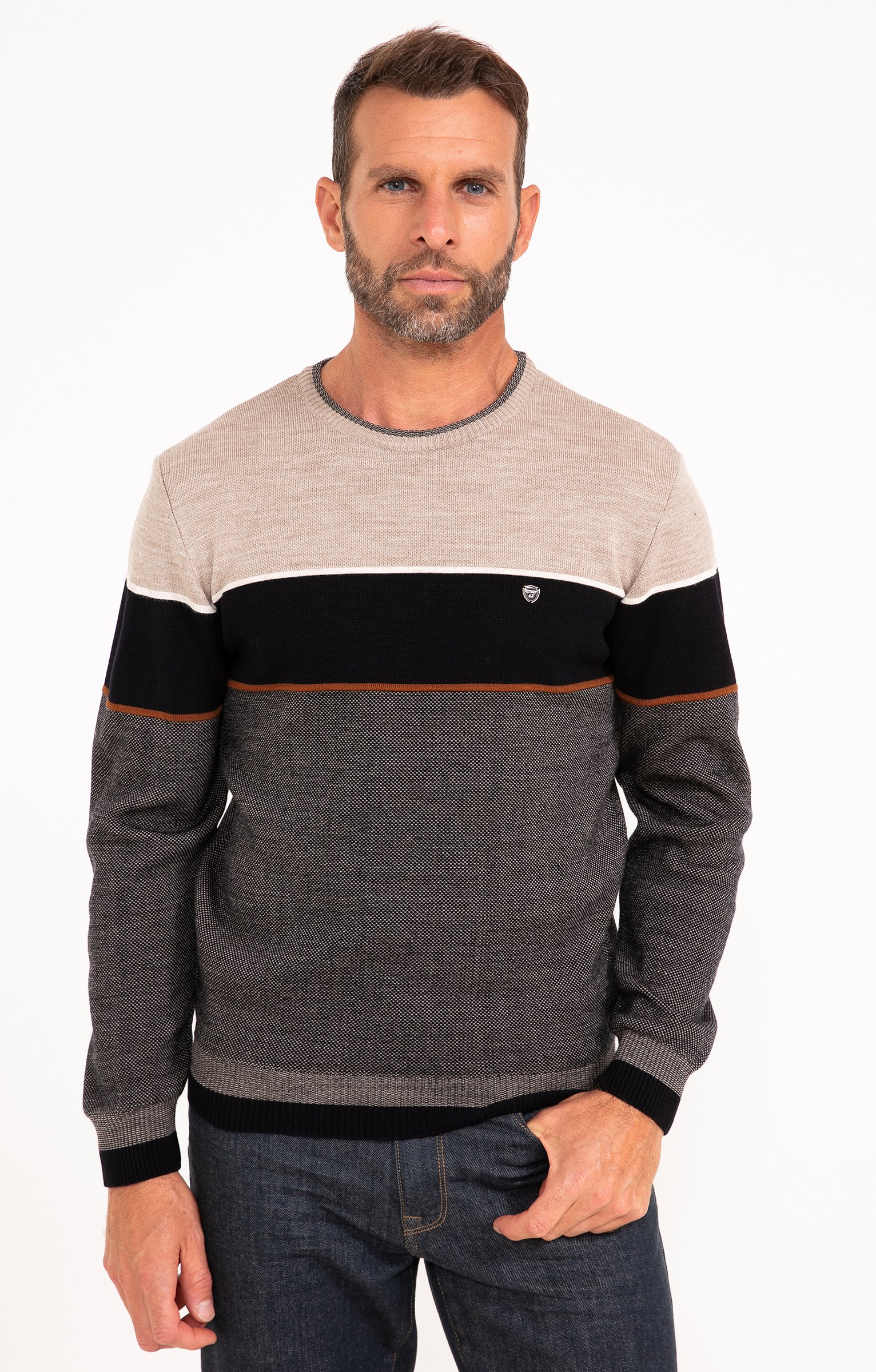 Pull en maille chaude avec rayures à manches longues et col rond. Coupe droite. Manches longues. Col rond côtelé avec liseré contrastant. Jeu de rayures composées de larges et de fines bandes sur le haut du buste et des manches. Tissu en maille chaude. Larges bord-côtes bicolores en finition de la base et des poignets.