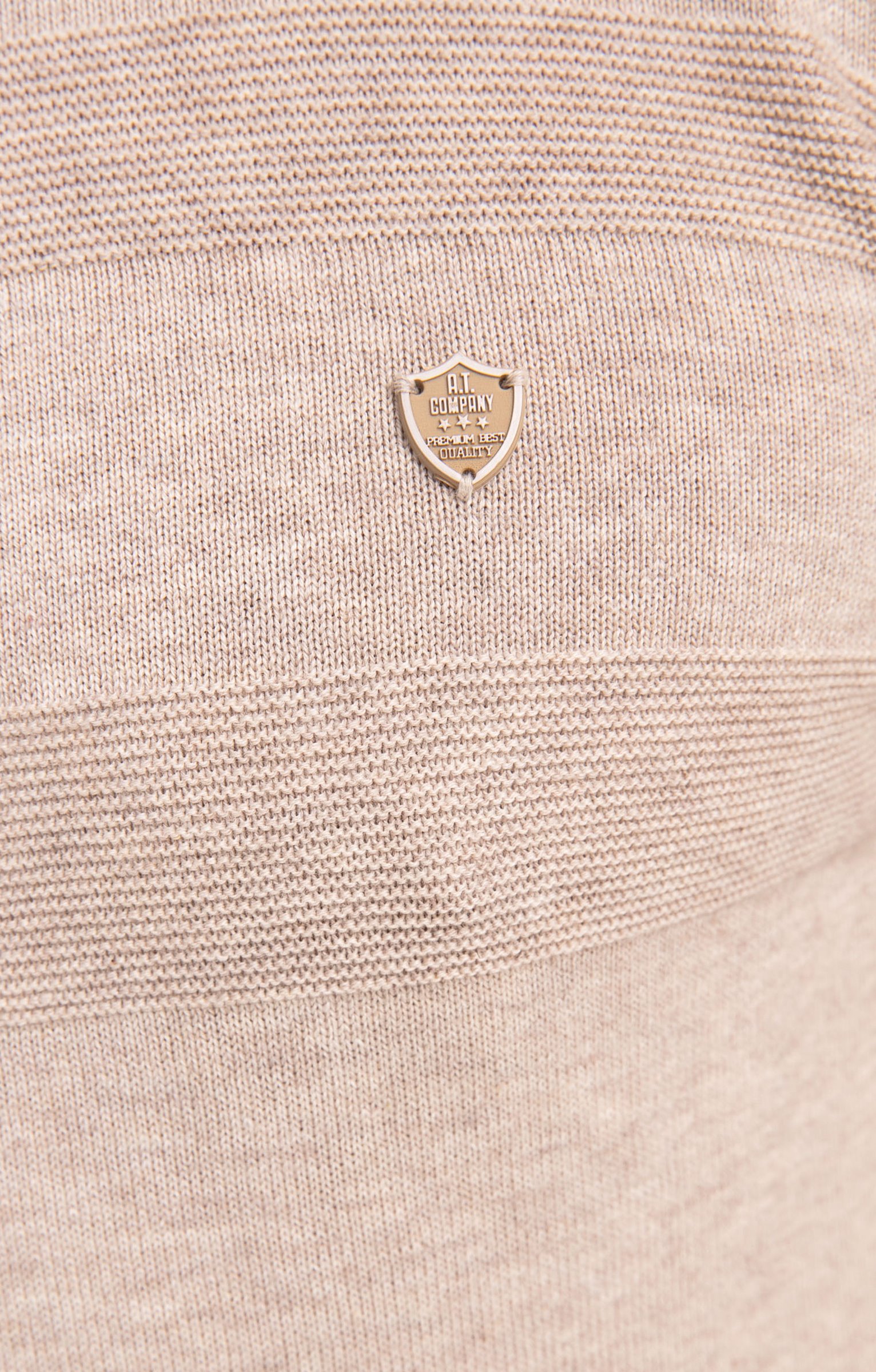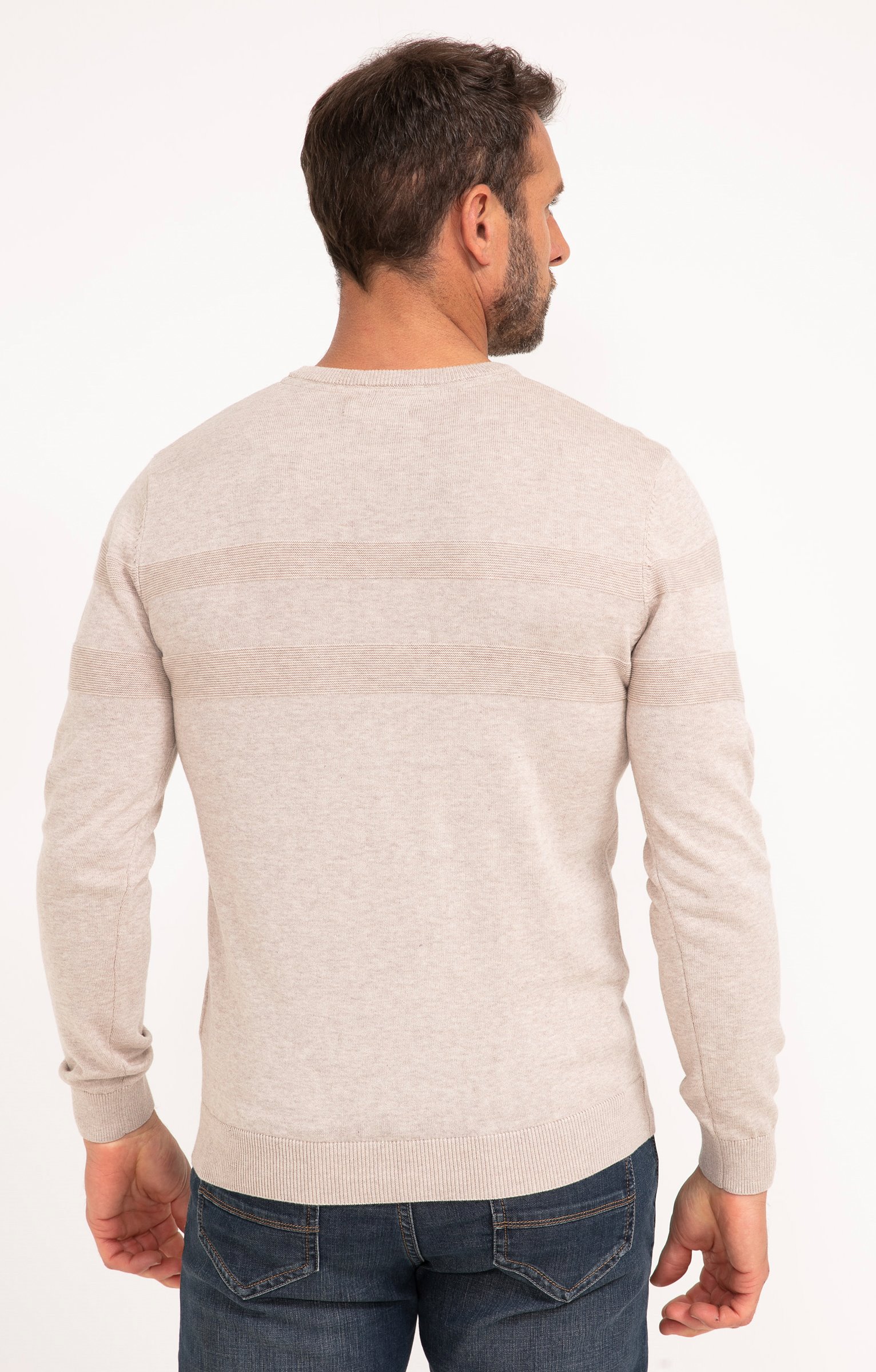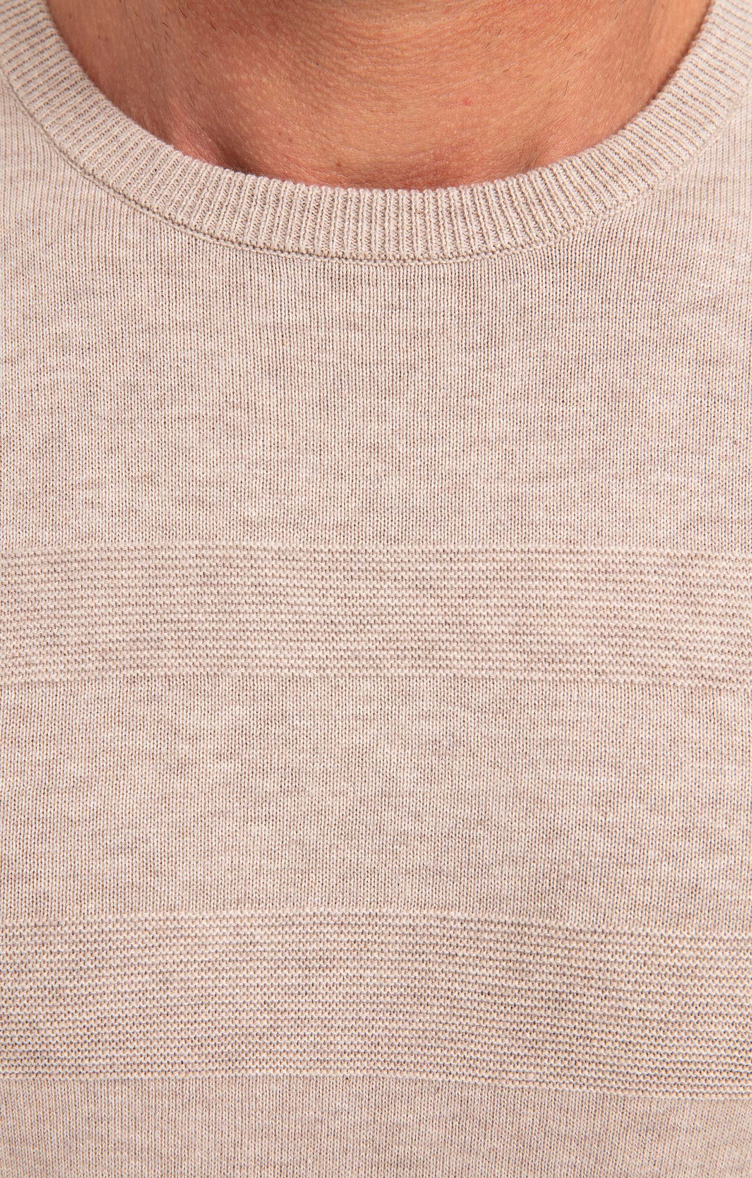 Pull uni avec détails texturés à manches longues et col rond. Coupe droite. Manches longues. Col rond côtelé. Coloris uni. Tissu en maille chaude aspect chiné. Détails texturés effet rayé en haut du buste et des manches. Petit écusson avec marque embossée cousu sur la poitrine. Larges bord-côtes en finition de la base et des poignets. Base droite.