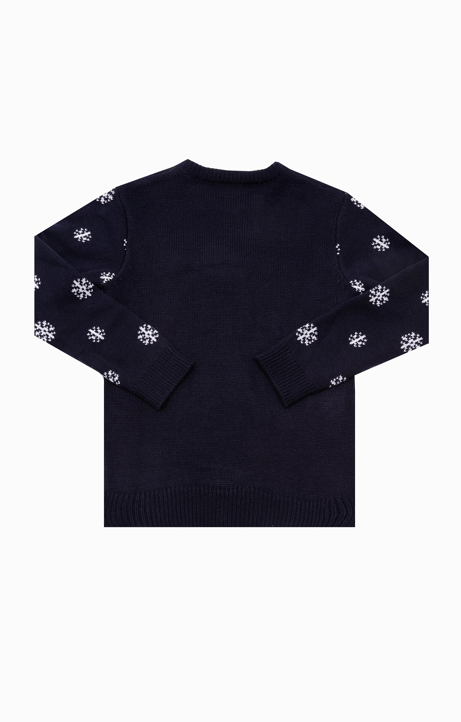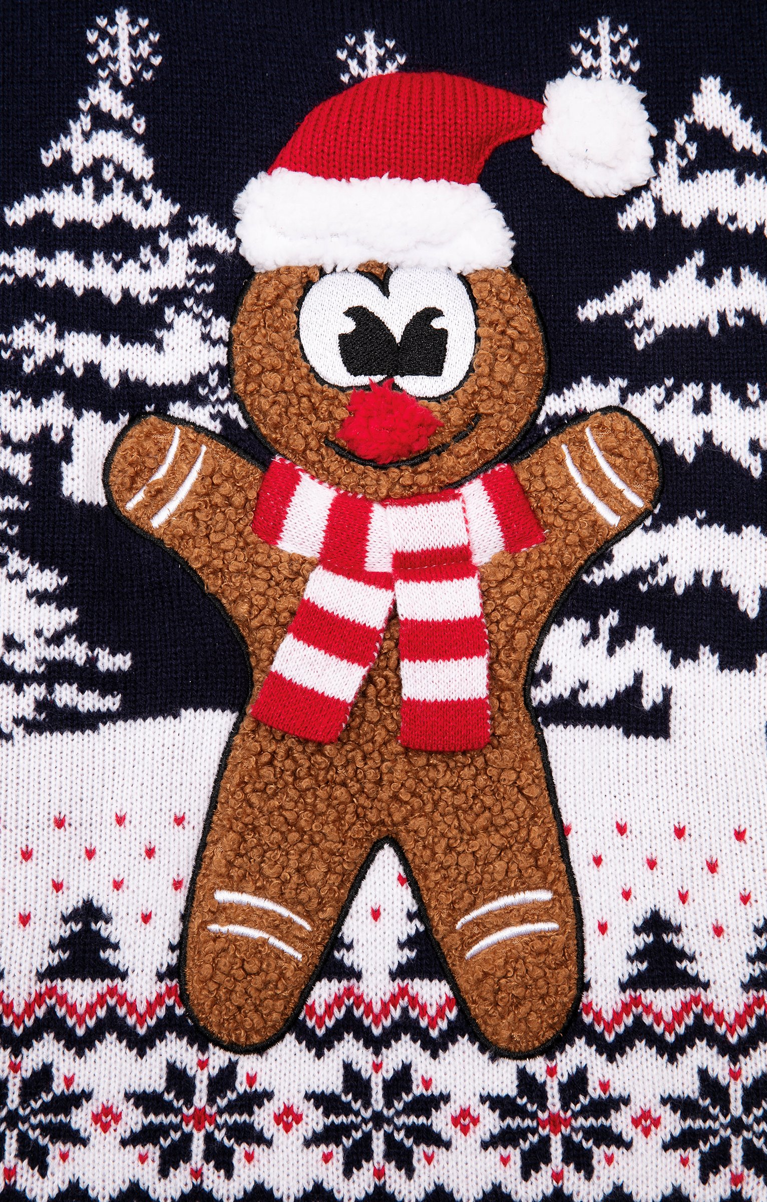 Pull fantaisie de Noël à manches longues et col rond. Coupe droite. Manches longues. Col rond côtelé. Motif jacquard devant et aux manches. Mannele en tissu bouclette avec écharpe en maille rayée et bonnet rembourré. Détails brodés et en tissu façon fourrure. Mix motifs Noël en toile de fond. Flocons de neige aux manches. Dos uni. Tissu en maille chaude. Larges bords-côtes en finition des poignets et de la base.
