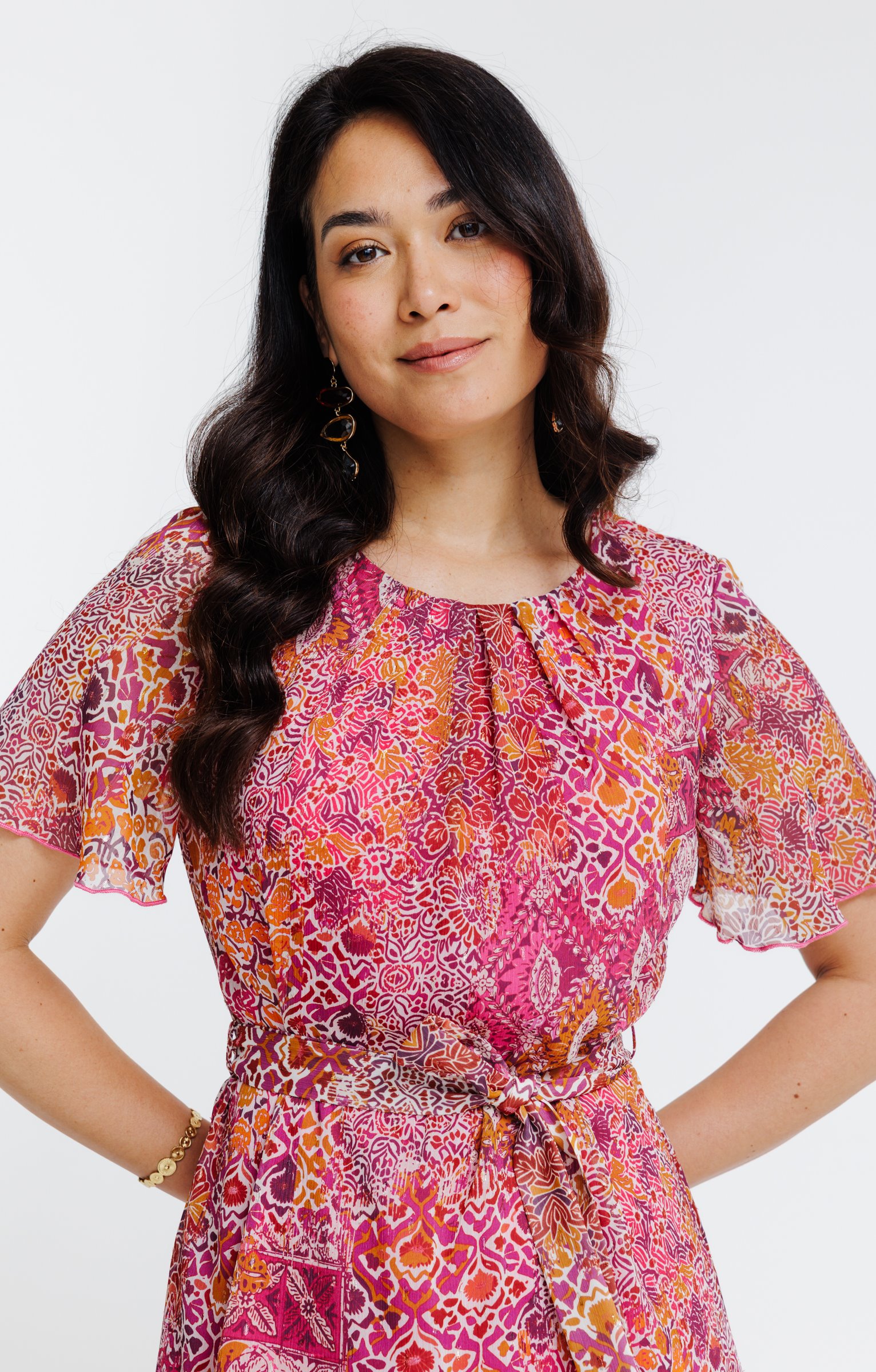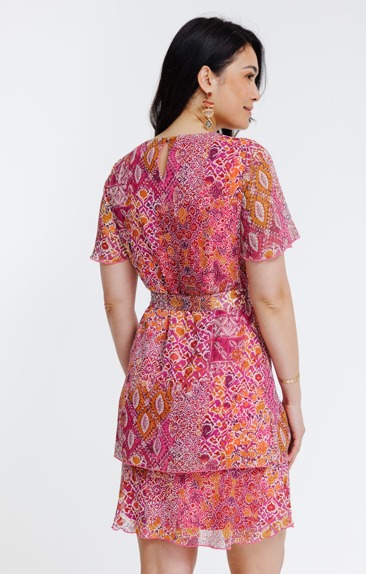 Robe courte à fleurs avec volants. Coupe droite structurée par une découpe sous la poitrine et un jeu de fronces au niveau du buste. Longueur genou. Manches très courtes formées par un volant. Décolleté carré. Imprimé à motif floral sur l'ensemble du modèle. Matière extensible. Doublure. Composition en matières recyclées majoritaires.