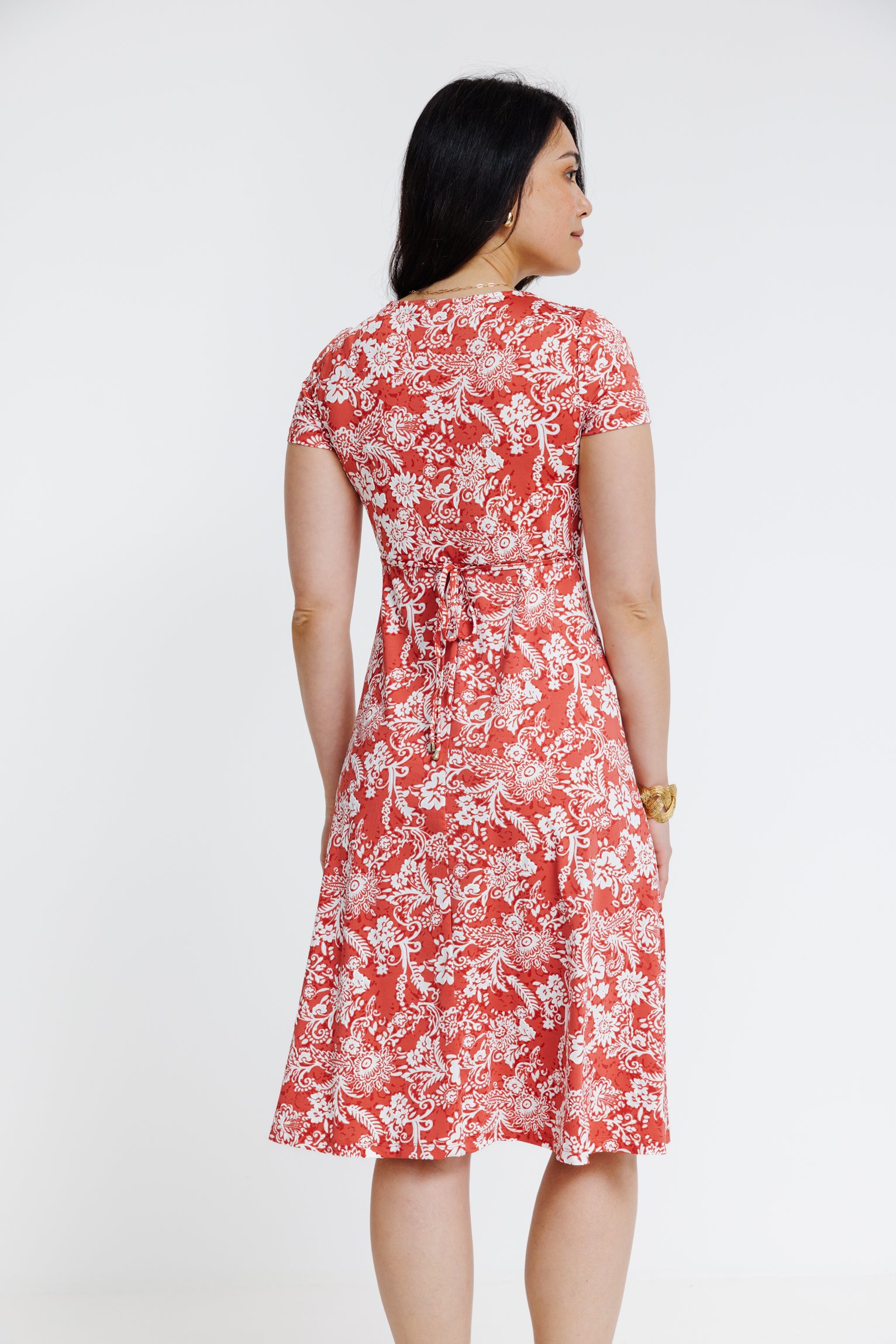Robe midi à manches courtes avec col en V. Coupe ajustée au niveau du buste et évasée à partir de la taille. Imprimé floral sur l'ensemble du modèle. Longueur midi, tombé fluide. Ceinture à nouer à la taille dans un tissu ton sur ton. Détails de fronces sur les côtés.