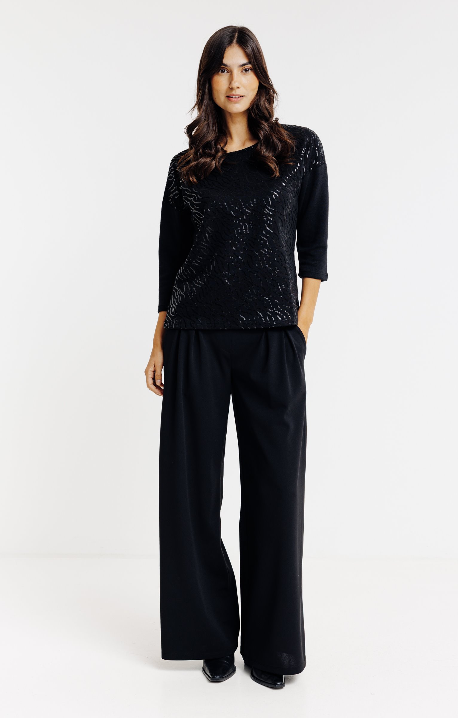 T-shirt de soirée à manches 3/4, col rond et sequins brodés devant. Coupe subtilement cintrée. Manches 3/4 montées sur des emmanchures tombantes. Décolleté rond. Teinte unie. Maille jersey extensible. Sequins en ton sur ton brodés formant des vagues devant. Base droite. Finitions ourlées.