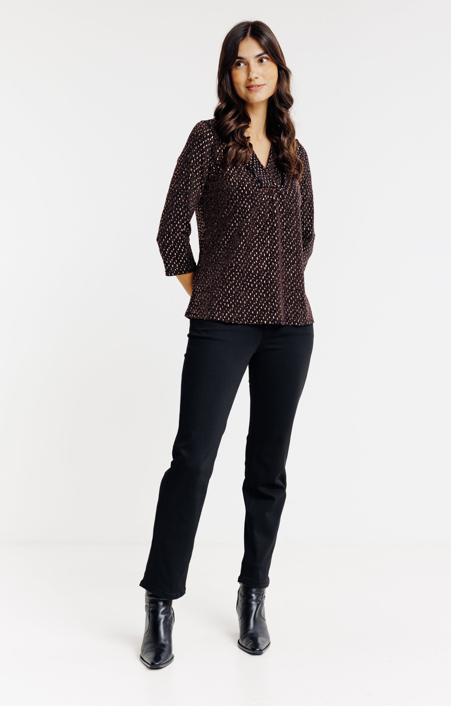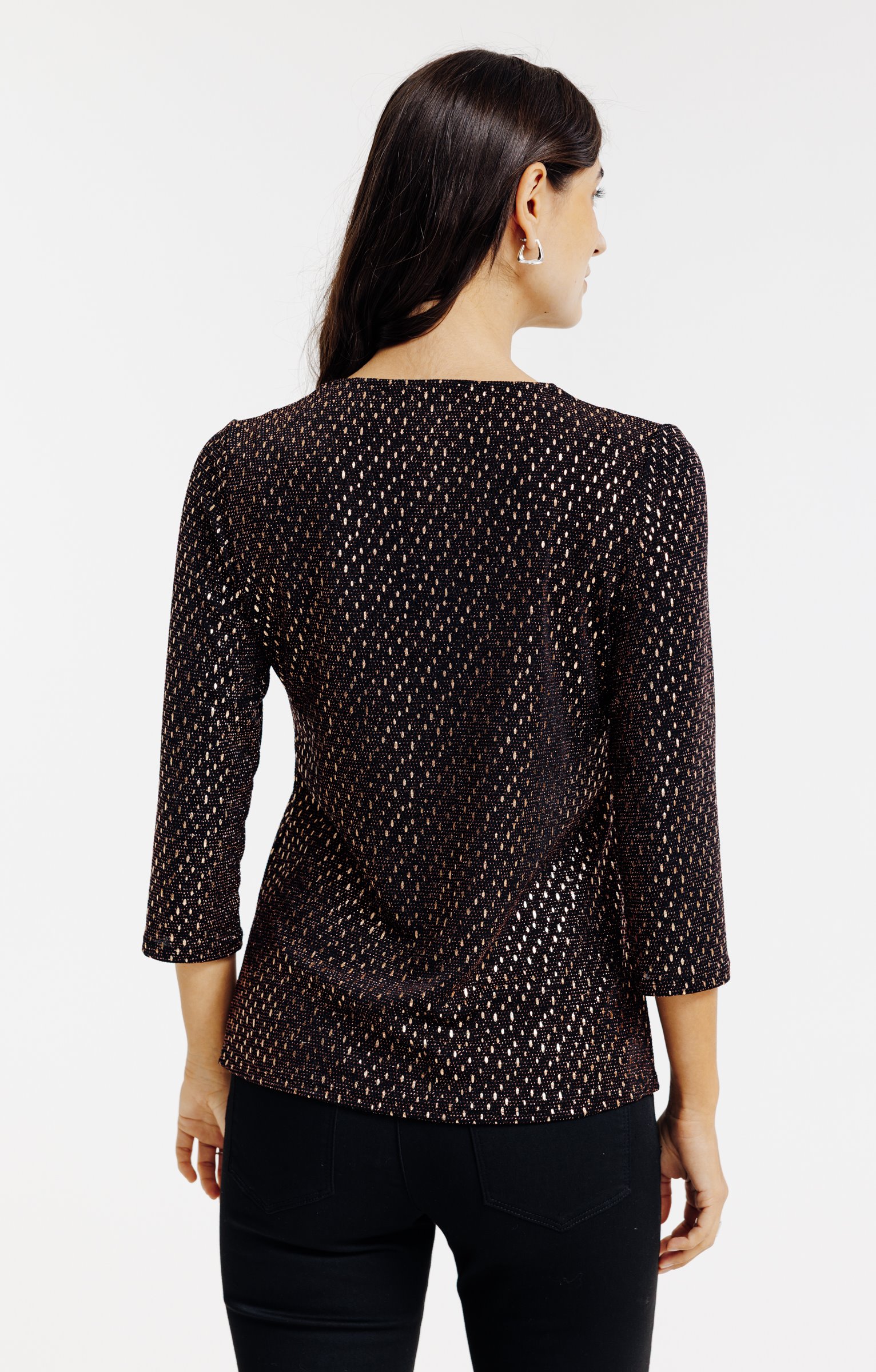 T-shirt de fête avec détails métallisés. Coupe droite fluide. Manches 3/4 à emmanchures droites, légèrement bouffantes. Col V. Galon au niveau du col. Motifs métallisés sur l'ensemble du modèle. Matière extensible. Coutures discrètes en finition du modèle. Portez ce t-shirt avec un pantalon noir, tout simplement.
