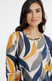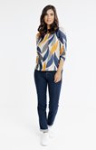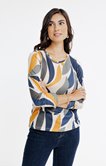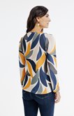 T-shirt graphique à col rond et manches longues impression pétales détail lurex. Coupe droite. Manches longues sur emmanchures droites. Col rond avec petit biais souligné d’un passepoil métallisé. Imprimé grands pétales multicolores sur l’ensemble. Maille fine extensible. Finition double surpiqûre aux poignets et aux manches.