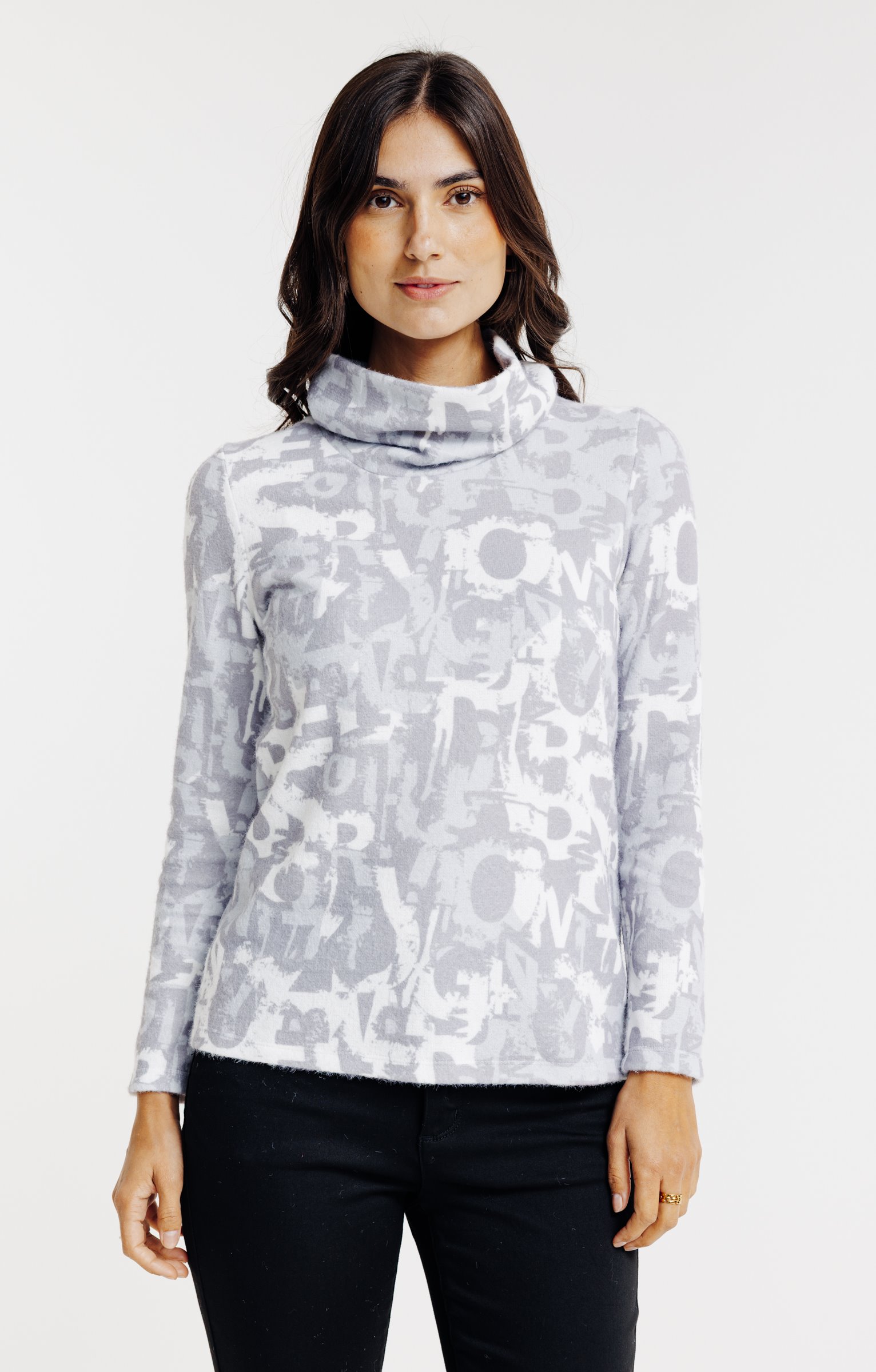 T-shirt en maille chaude imprimé graphique à manches longues et col boule. Coupe droite. Manches longues. Col boule. Imprimé graphique sur toute la surface du modèle. Motifs lettrage déstructuré effet flou. Tissu en maille chaude à texture poilue. Fines surpiqûres discrètes en finition des poignets et de la base. Base droite.