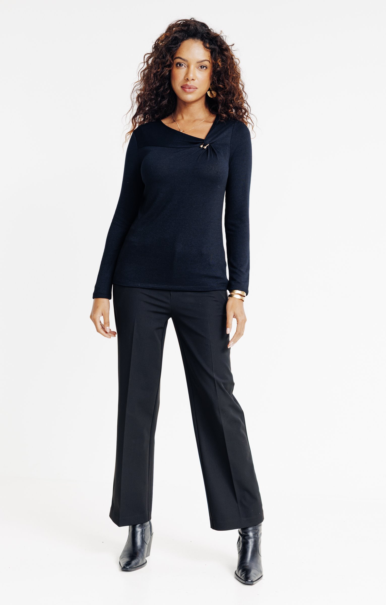 T-shirt en maille unie à manches longues et col rond avec nœud et boucle. Coupe ajustée. Manches longues. Col rond avec nœud déporté sur le côté avec détail anneau ouvert en forme de fer à cheval. Coloris uni. Tissu en maille extensible. Empiècement décoratif et détail fronces en haut du buste au niveau de l'encolure. Boucle aspect métal doré. Fines surpiqûres ton sur ton en finition du modèle. Base droite.