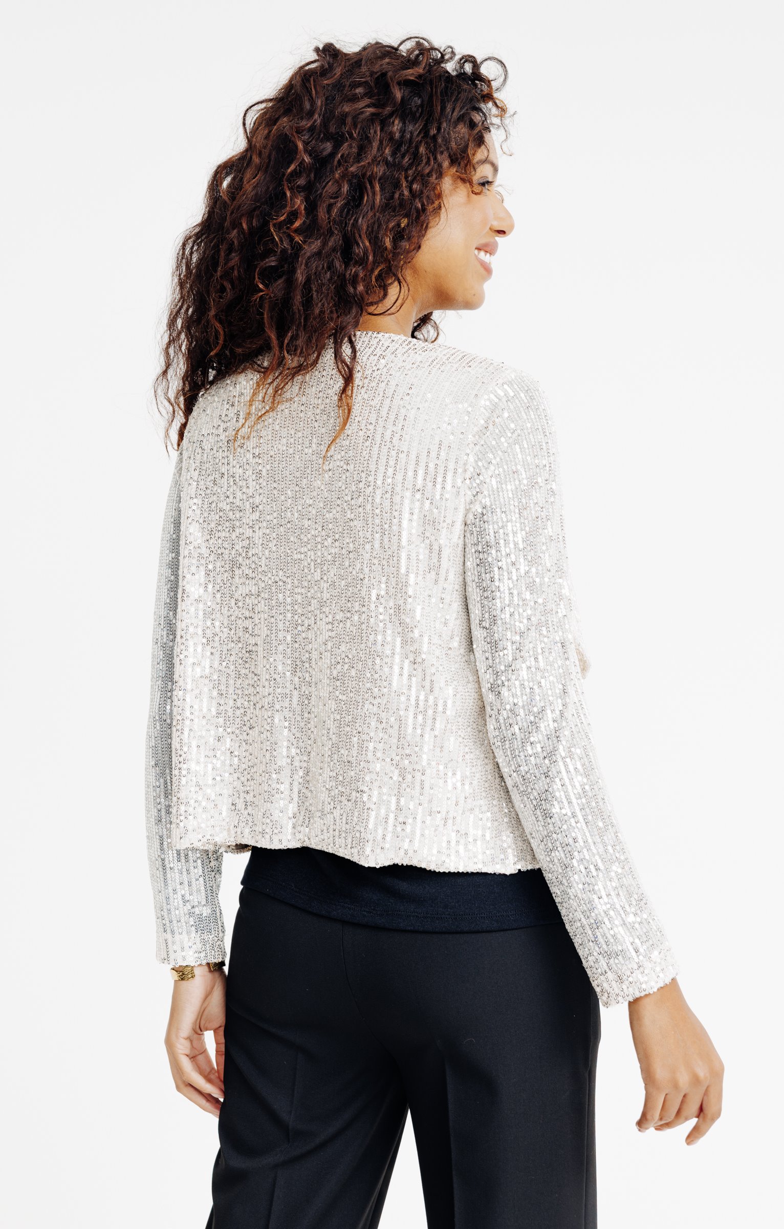 "T-shirt à sequins style veste ouverte à manches longues et col châle. Coupe droite. Manches longues. Col châle. Modèle sans fermeture. T-shirt à sequins. Tissu en maille à sequins. Matière extensible. Modèle avec doublure ton sur ton. Base droite. Pièce idéale pour compléter un combi pantalon uni contrastant.