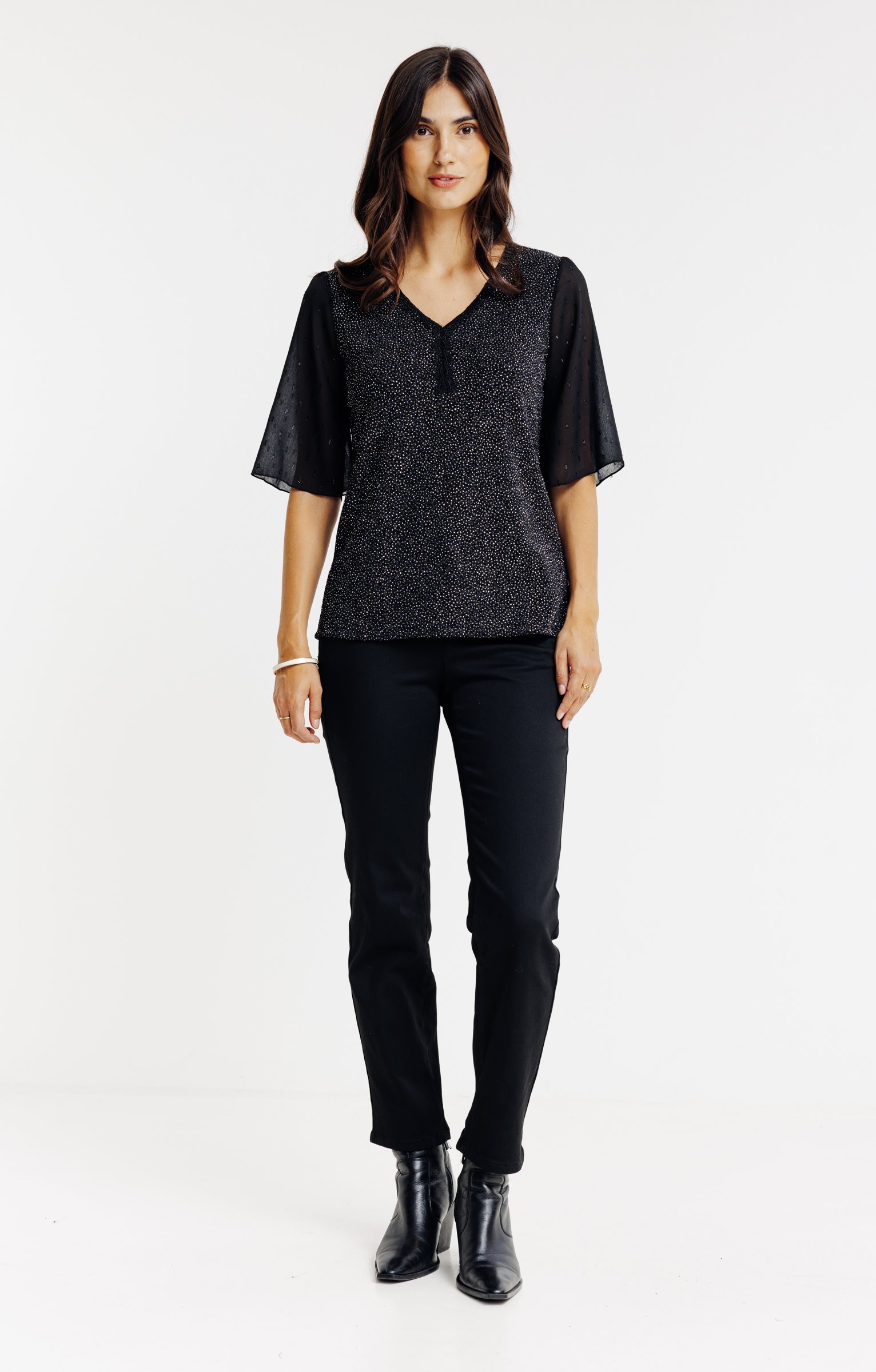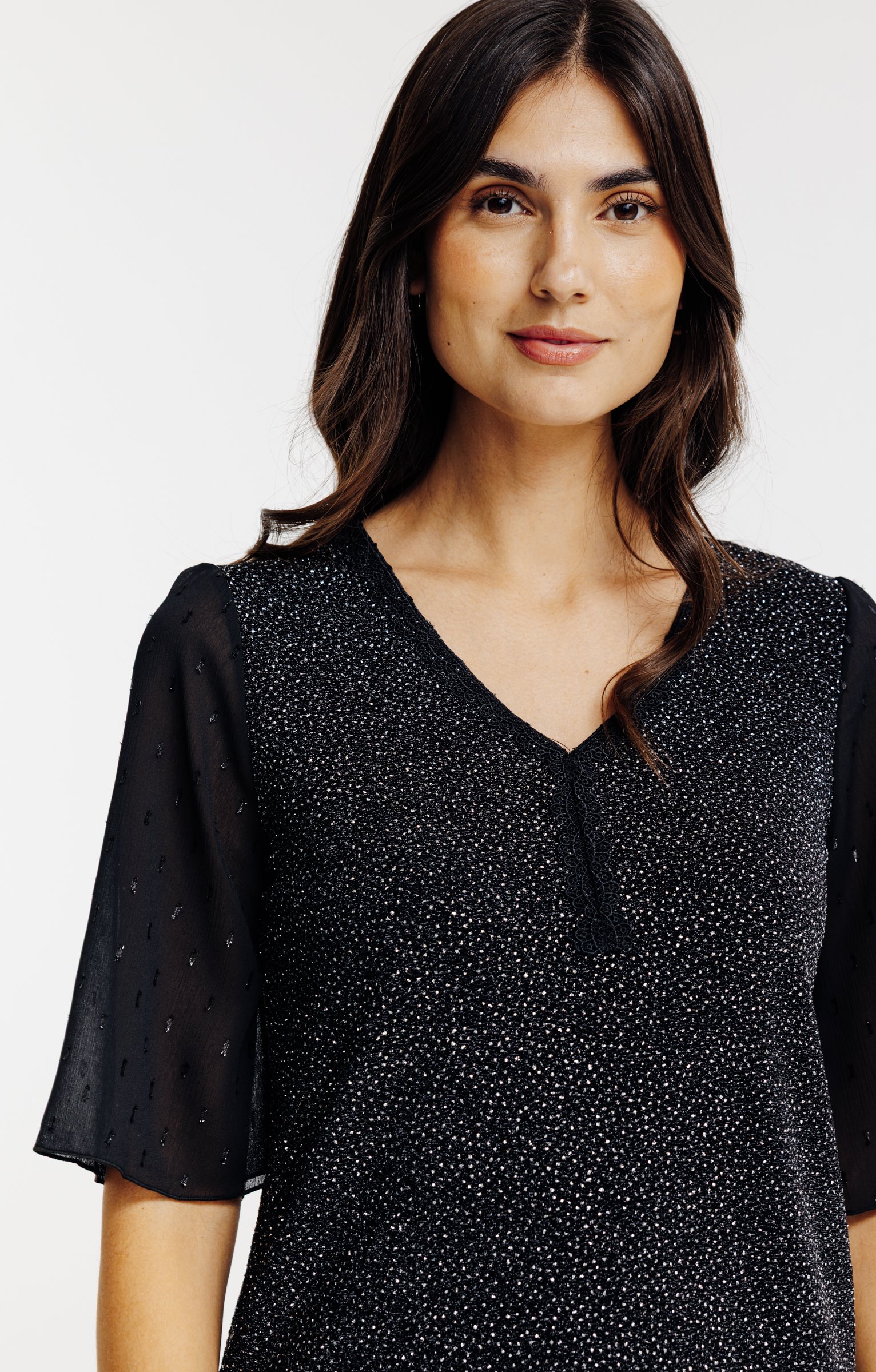 T-shirt de fêtes bimatière à manches courtes et détails dentelle. Coupe légèrement ajustée. Manches coudes. Col V avec galon. Coloris uni. Devant et dos en matière extensible tissée de micro points métallisés. Manches et empiècement en haut au dos en voile plumetis. Finition col et patte centrée sous le col en dentelle macramé festonnée ton sur ton. Base droite.
