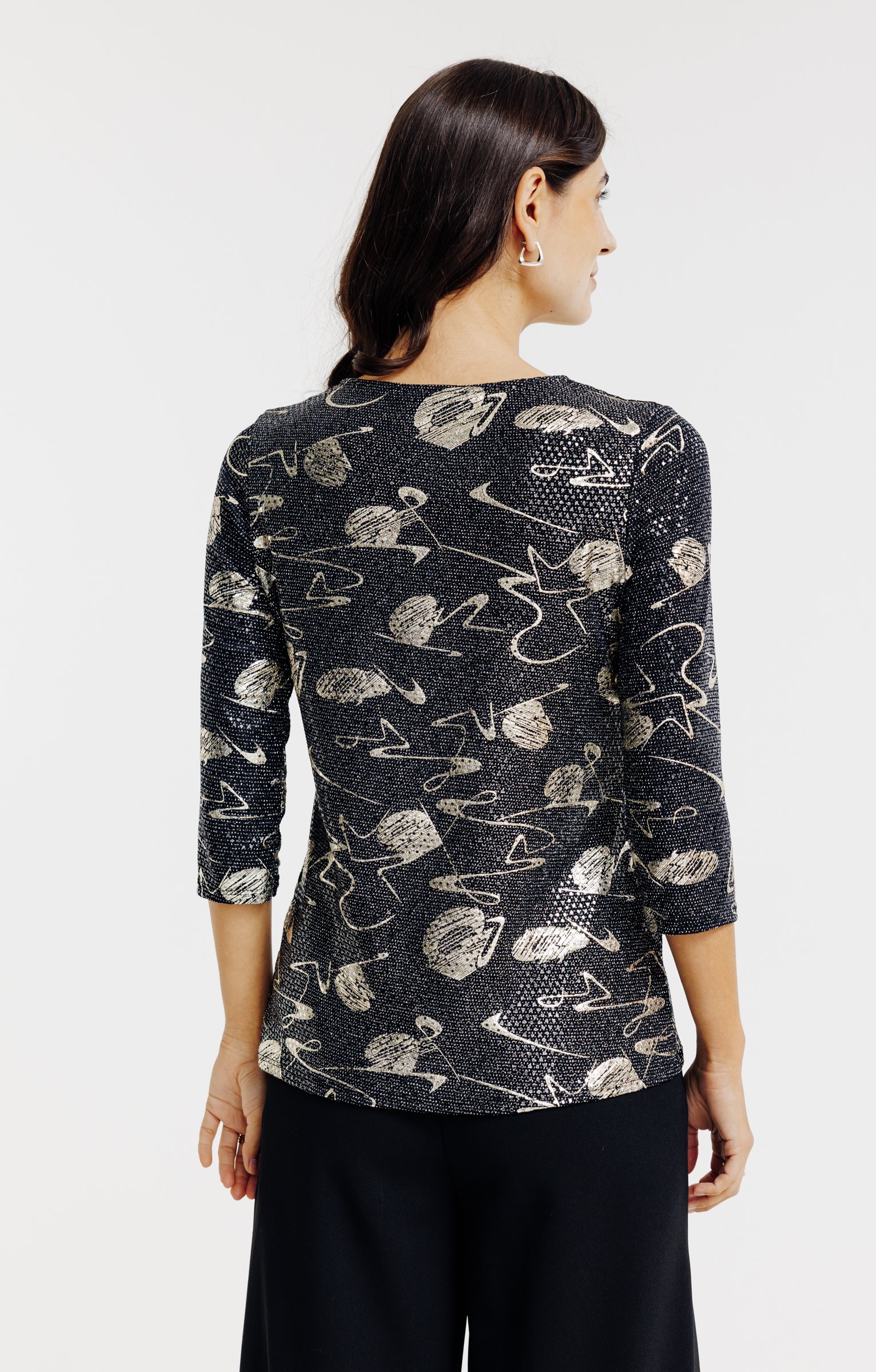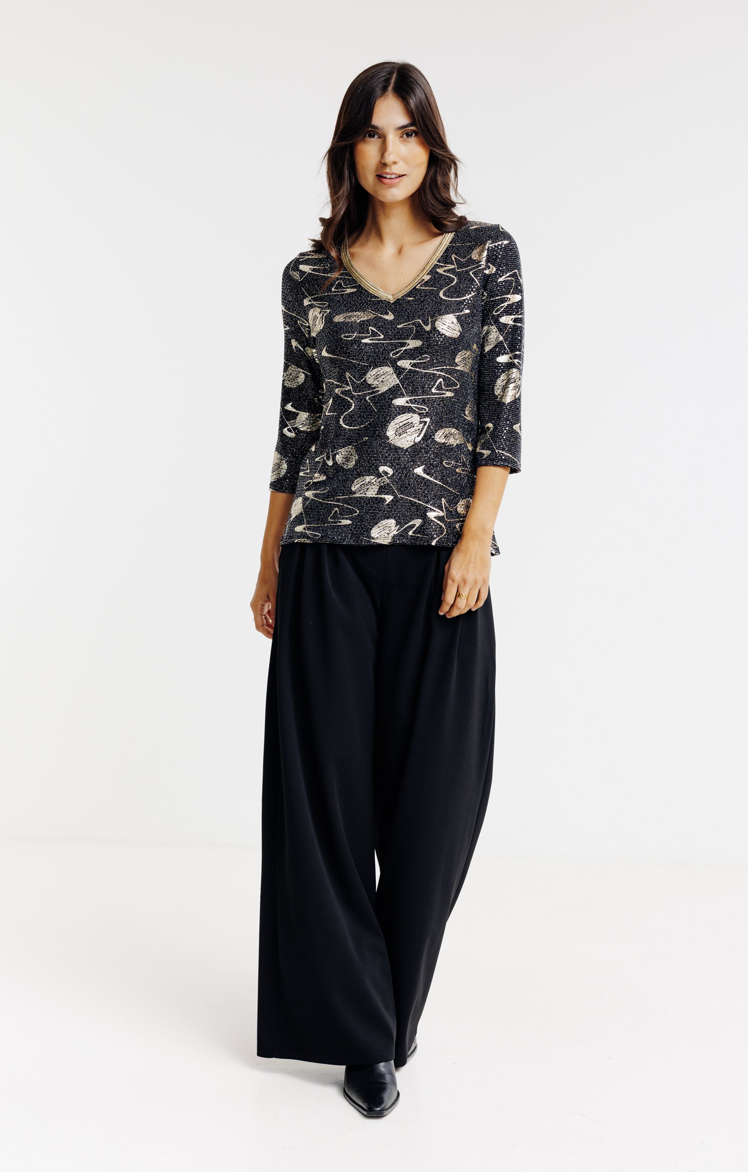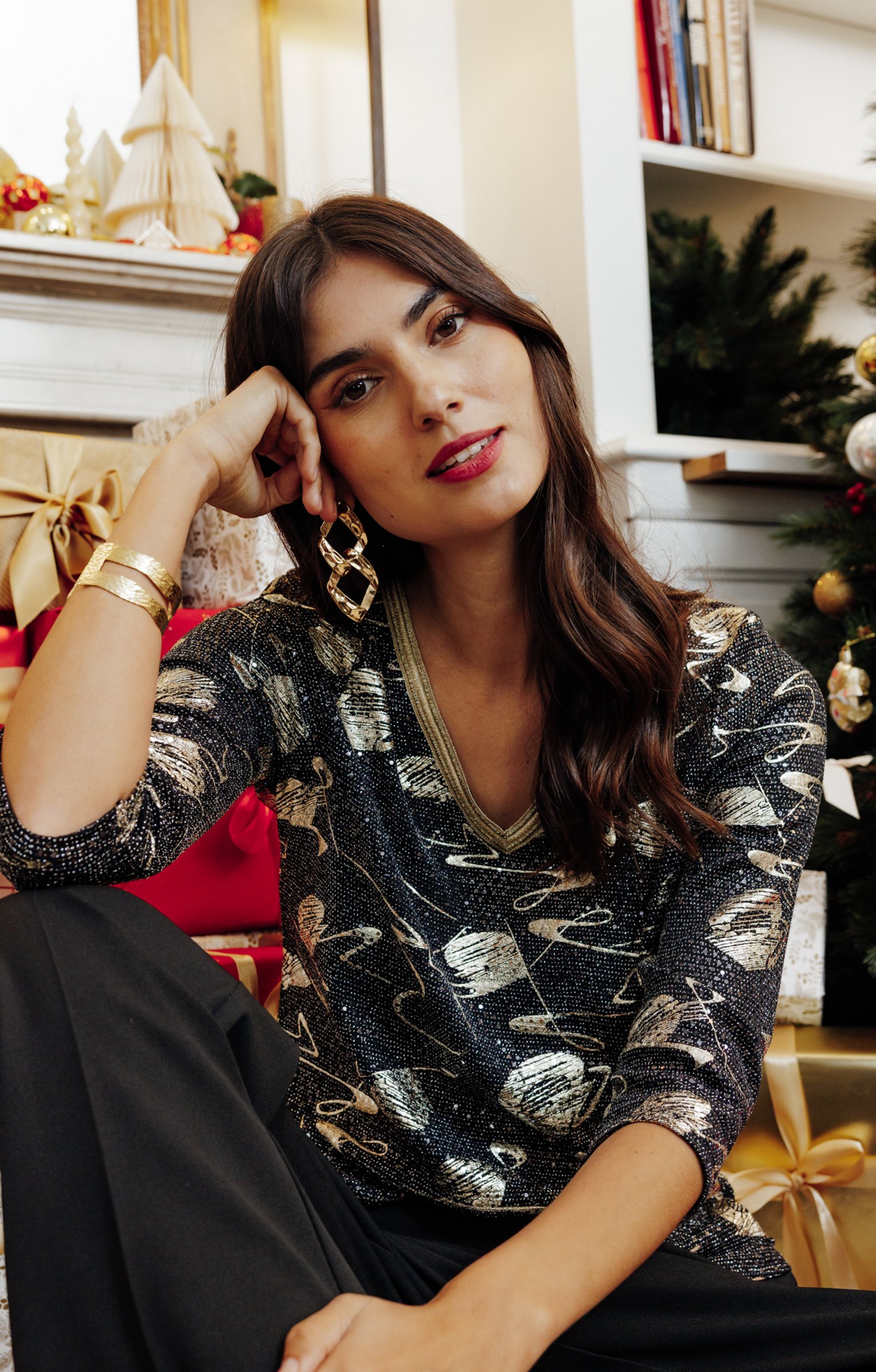 T-shirt de fêtes à manches 3/4 à motifs musicaux métallisés. Coupe subtilement cintrée. Manches 3/4. Emmanchures droites. Col V avec galon. Micro pois tissés et motifs notes de musique abstraites. Maille extensible tissée de fils métallisés. Galon brodé en teinte irisée en finition du col. Base droite.