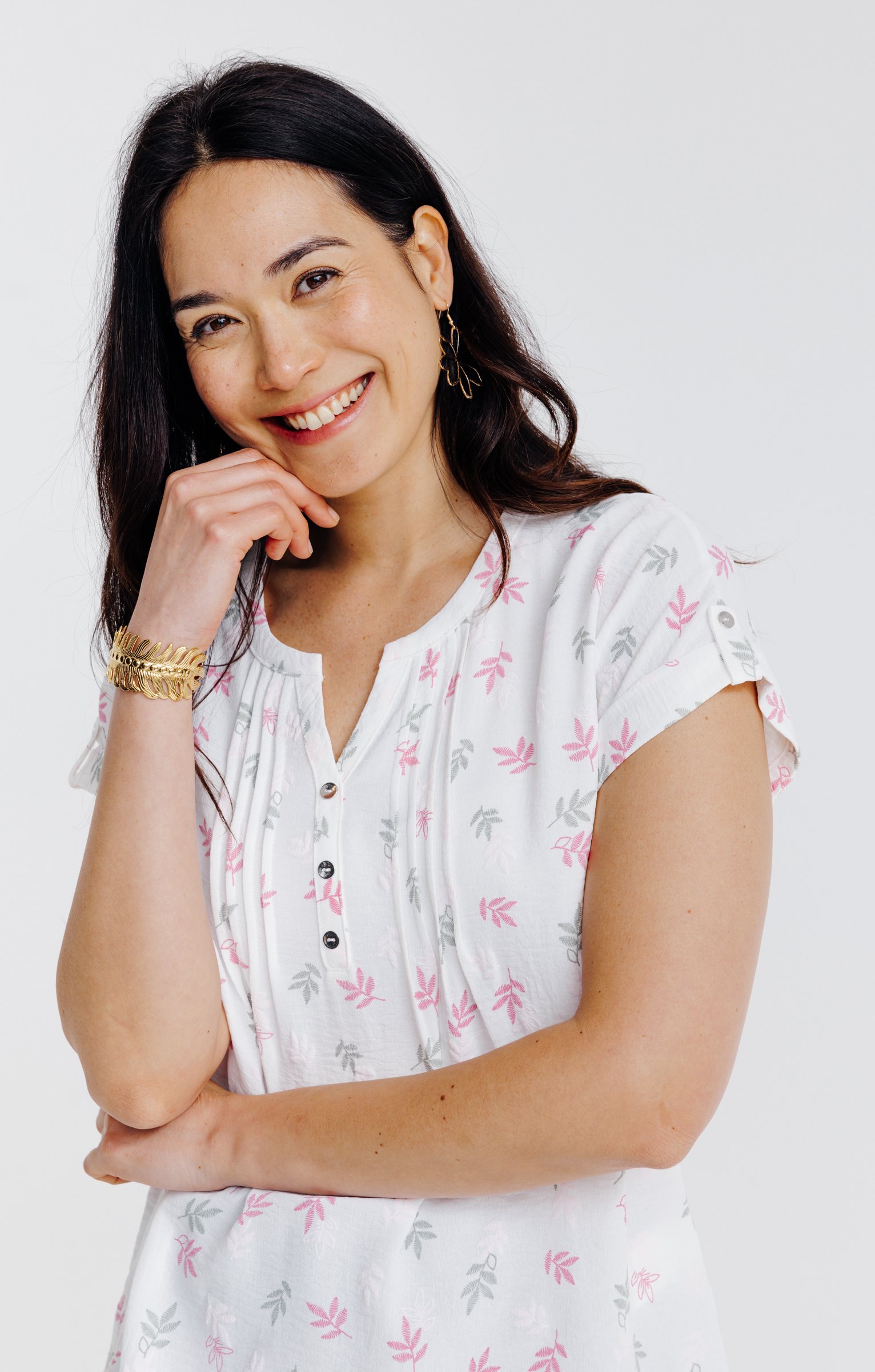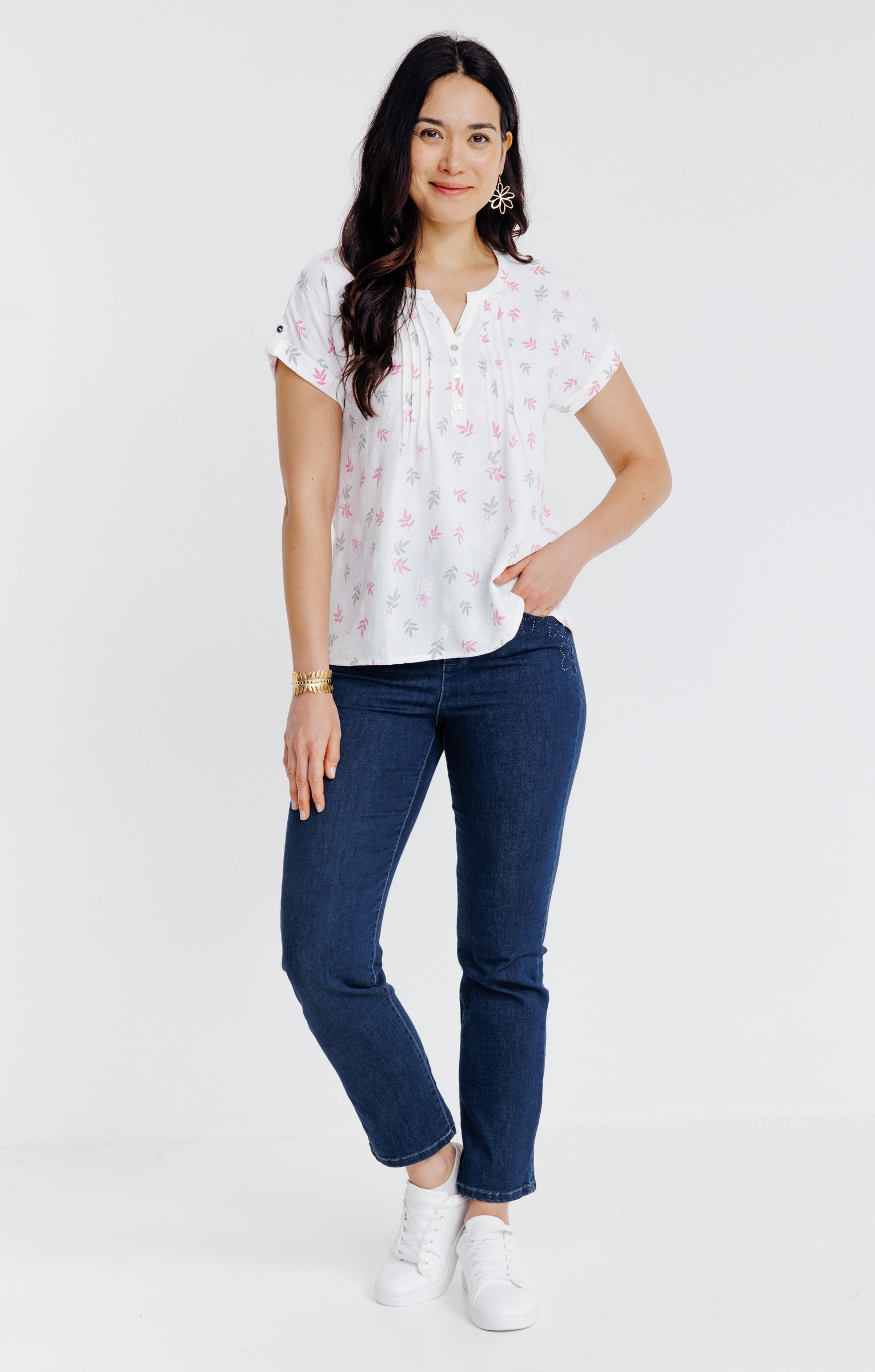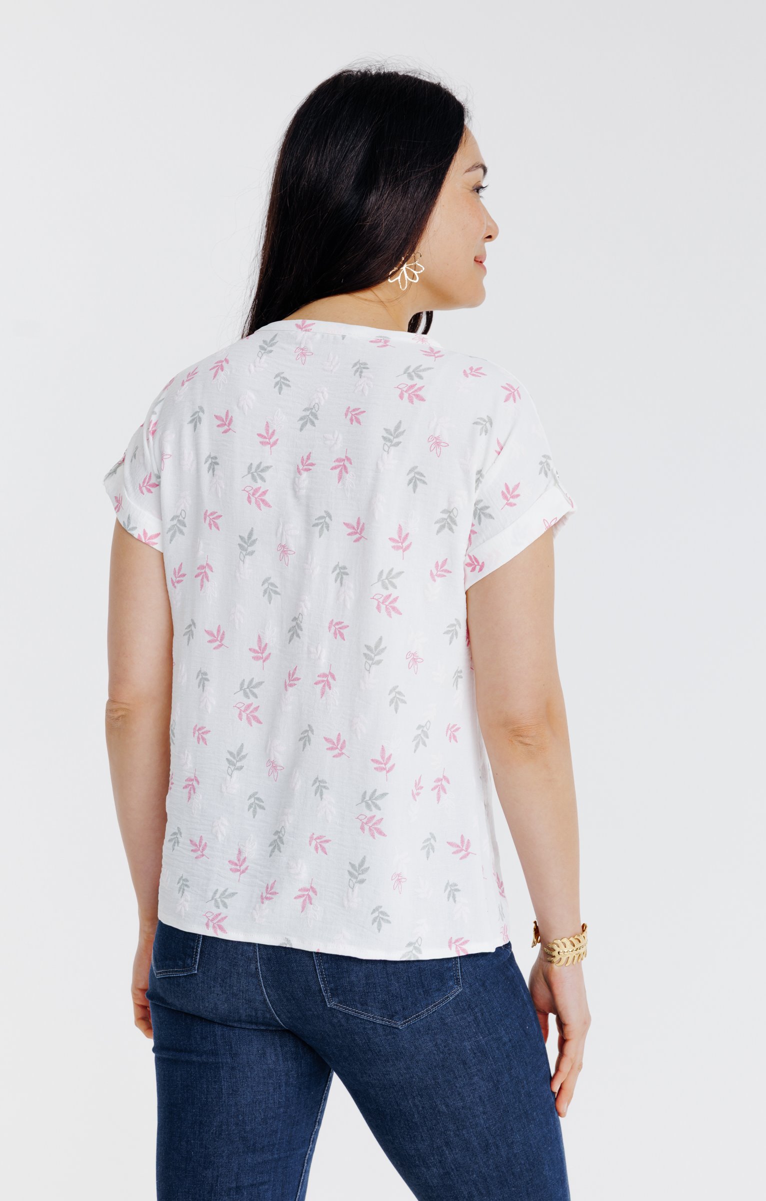 T-shirt à manches courtes en matière façonnée et motifs végétaux multicolores. Coupe droite. Manches courtes à revers. Sans emmanchures. Décolleté rond avec découpe V. Feuilles multicolores imprimées. Matière souple embossée de motifs feuilles en ton sur ton. Patte boutonnée en finition des manches. 3 boutons ornementaux cousus sous le col.