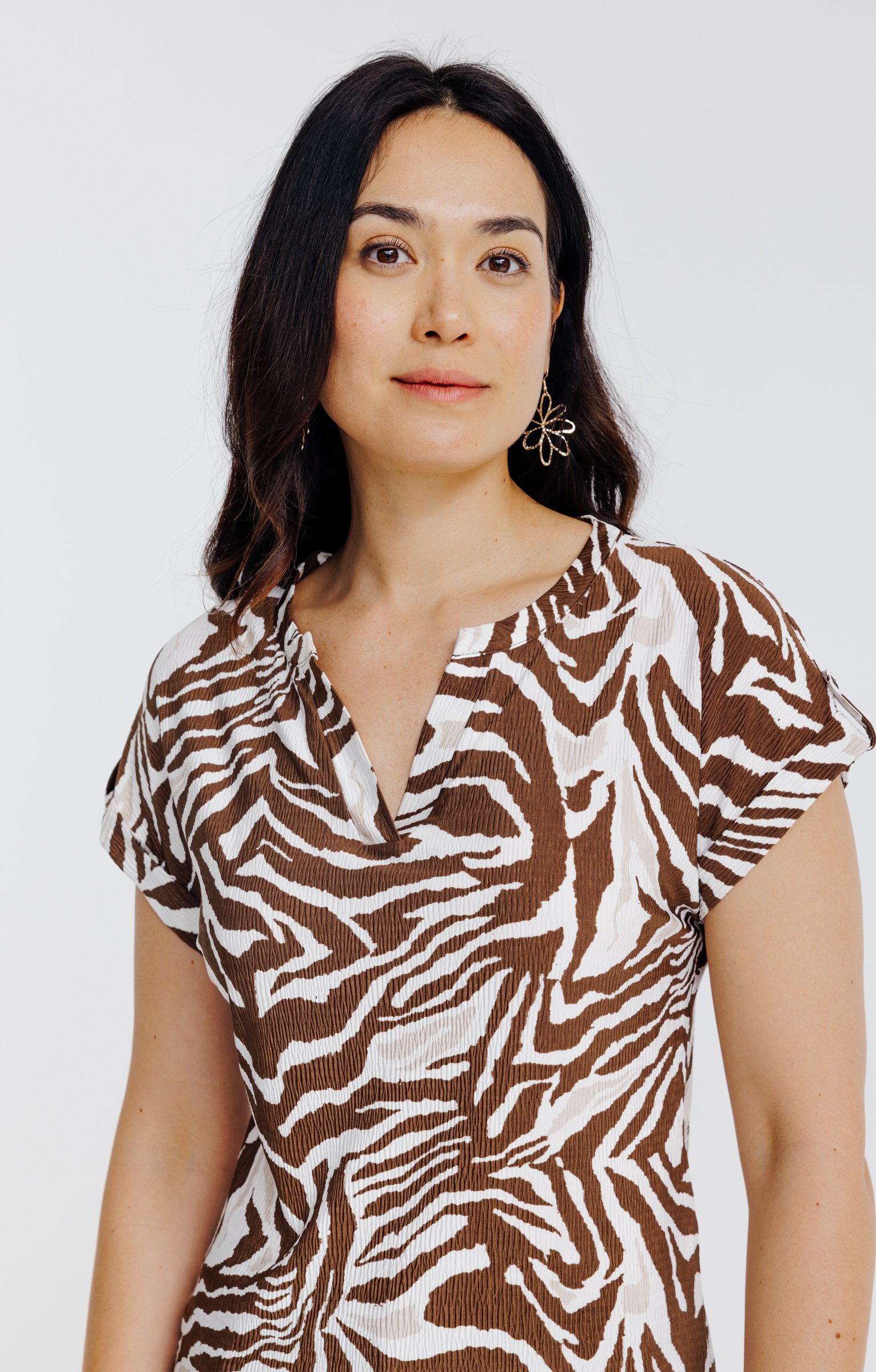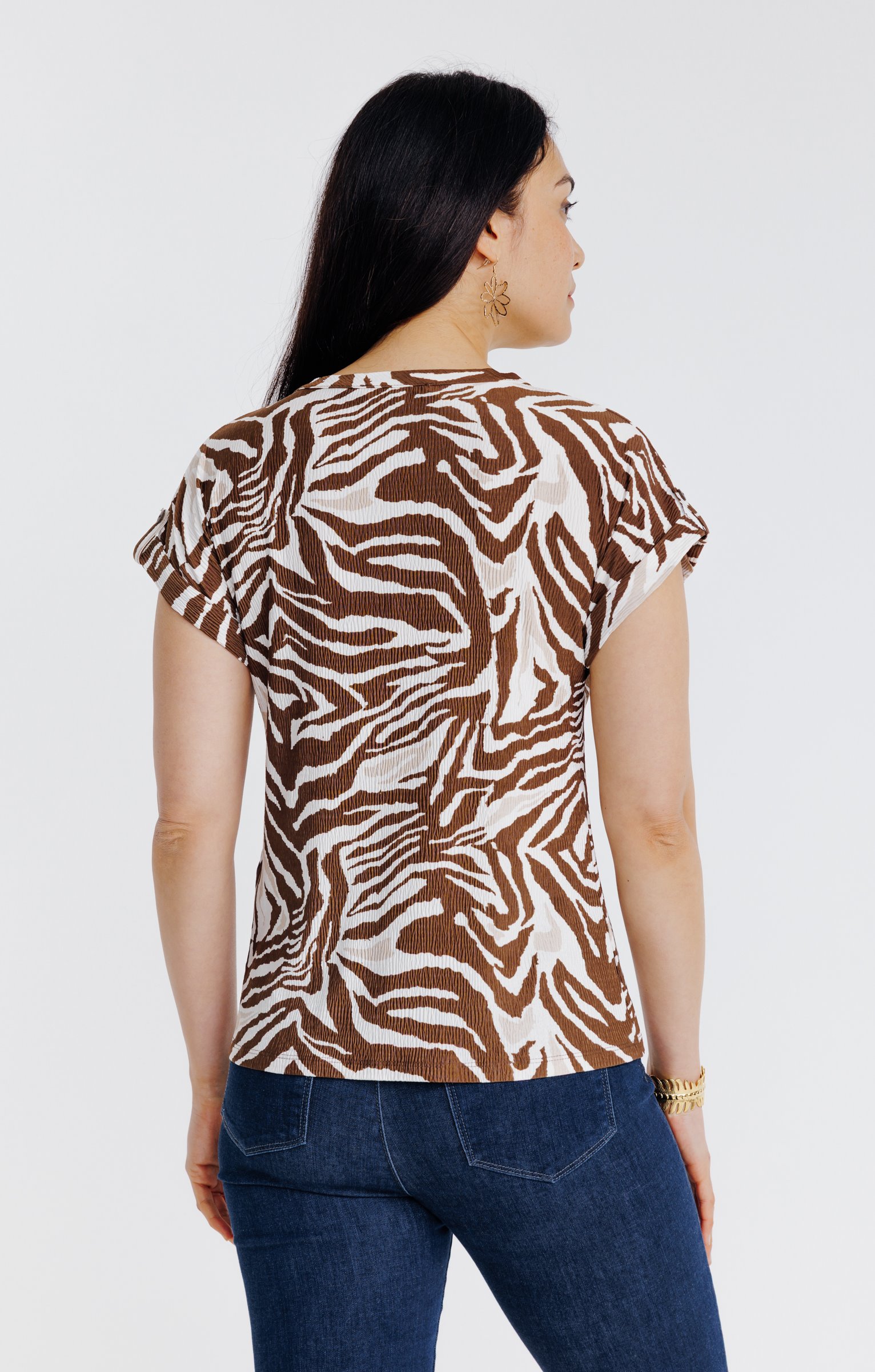 T-shirt imprimé zèbre à manches courtes. Coupe droite. Manches courtes à revers avec patte de fixation boutonnée décorative. Col rond avec fente en V. Imprimé zèbre. Tissu en maille texturée froissée. Matière extensible. Fines surpiqûres discrètes en finition du col et de la base. Base droite.