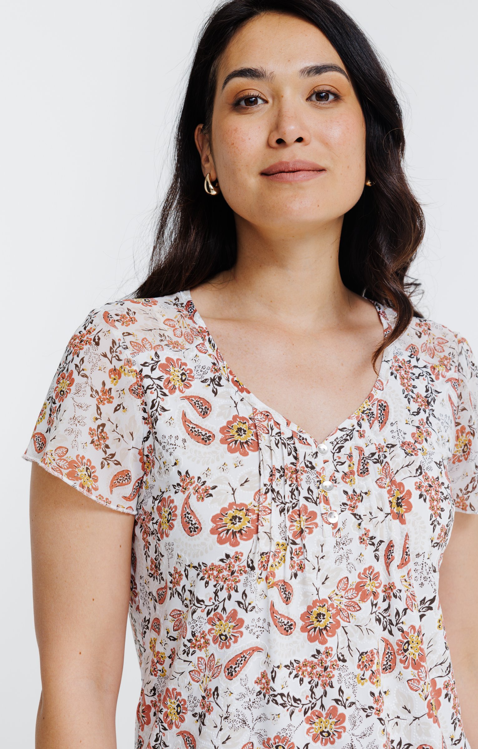 T-shirt à manches courtes avec col en V. Coupe droite. Boutons décoratifs au col. Détails plissés sur le devant. Manches courtes volantées. Imprimé cachemire sur l'ensemble. Longueur standard. Tissu extensible.