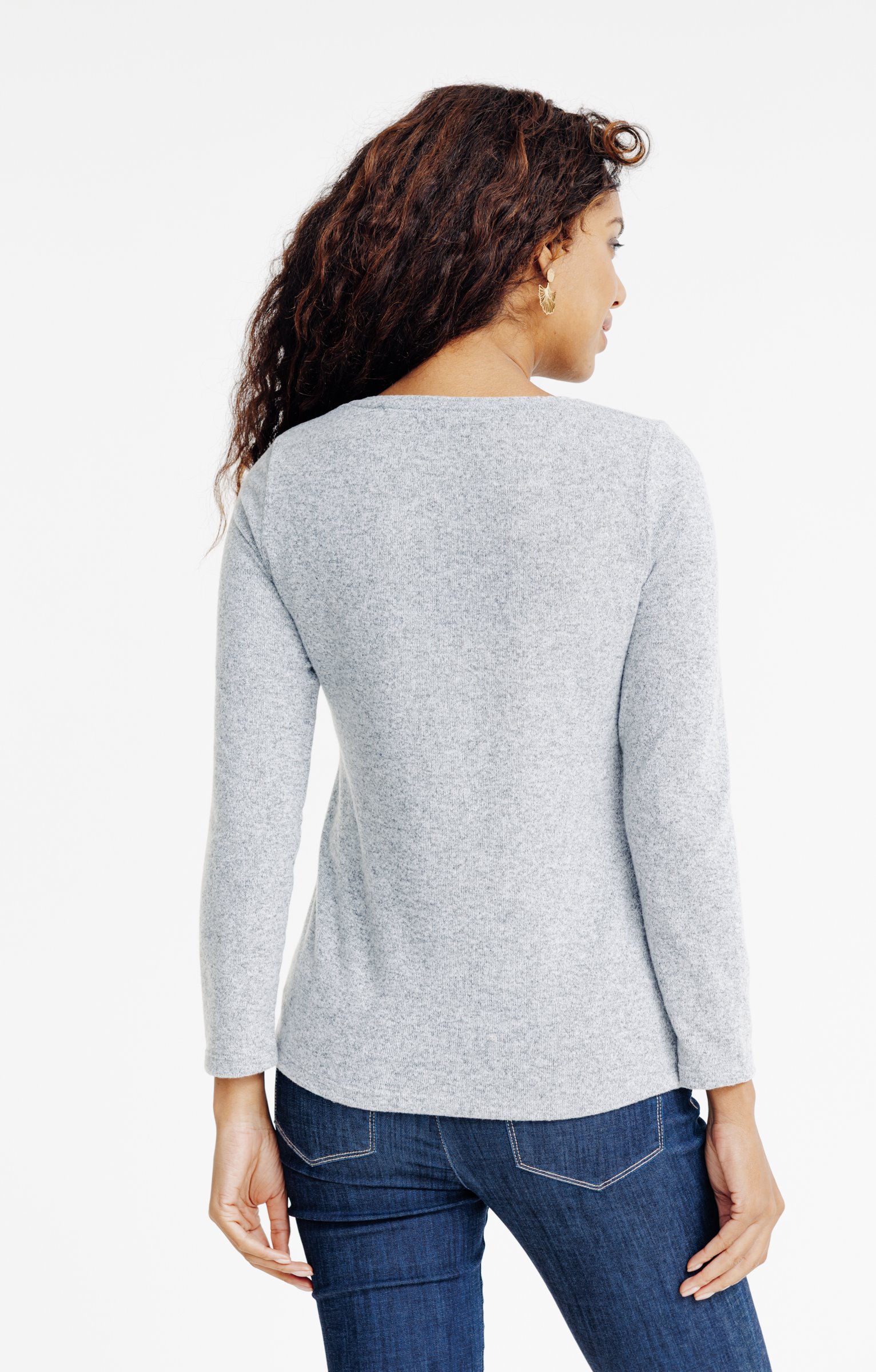"T-shirt de Noël à manches longues et col rond imprimé chat devant. Coupe droite. Manches longues. Col rond. Grand motif chat avec détails guirlande, étoile et flocons de neige surmontant le message « Merry Christmas » devant. Studs en finition. Tissu en maille chaude aspect chiné. Matière extensible. Fines surpiqûres ton sur ton en finition du modèle. Base droite.