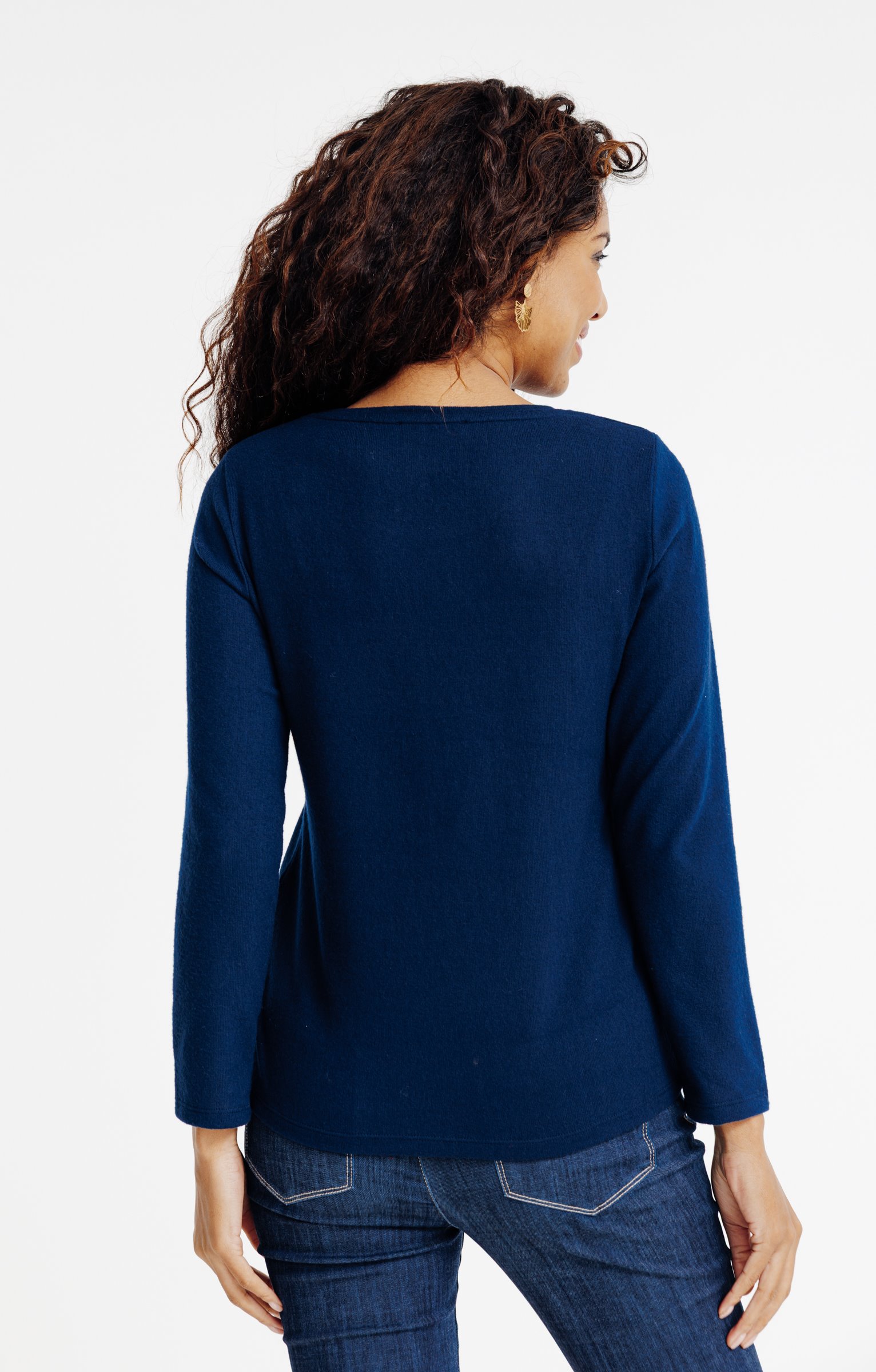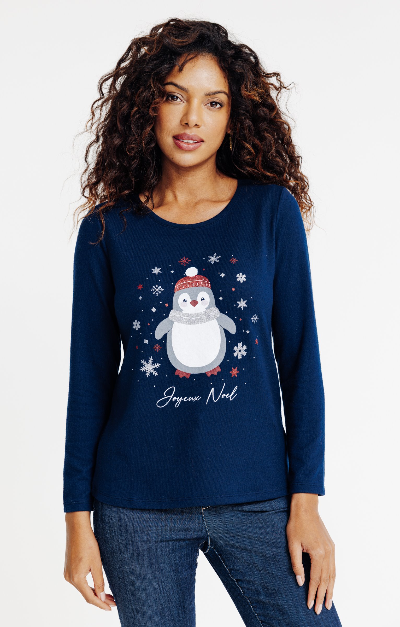 "T-shirt de Noël à manches longues et col rond imprimé pingouin placé devant. Coupe droite. Manches longues. Col rond. Grand motif pingouin avec détails flocons de neige pailletés et message « Joyeux Noël » devant. Tissu en maille chaude. Matière extensible. Fines surpiqûres ton sur ton en finition du modèle. Base droite.