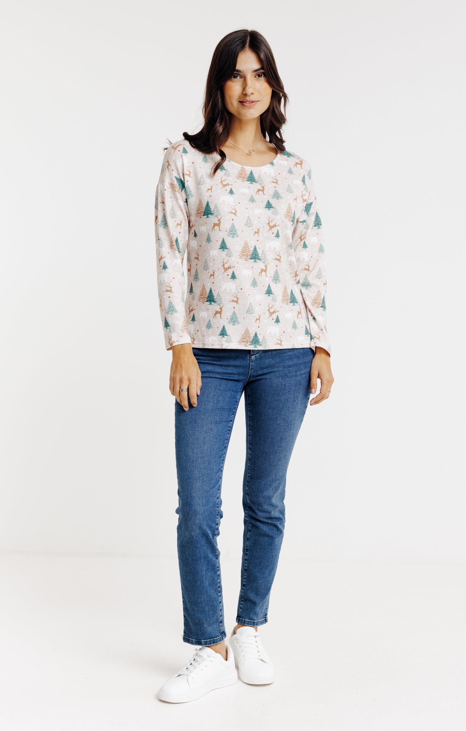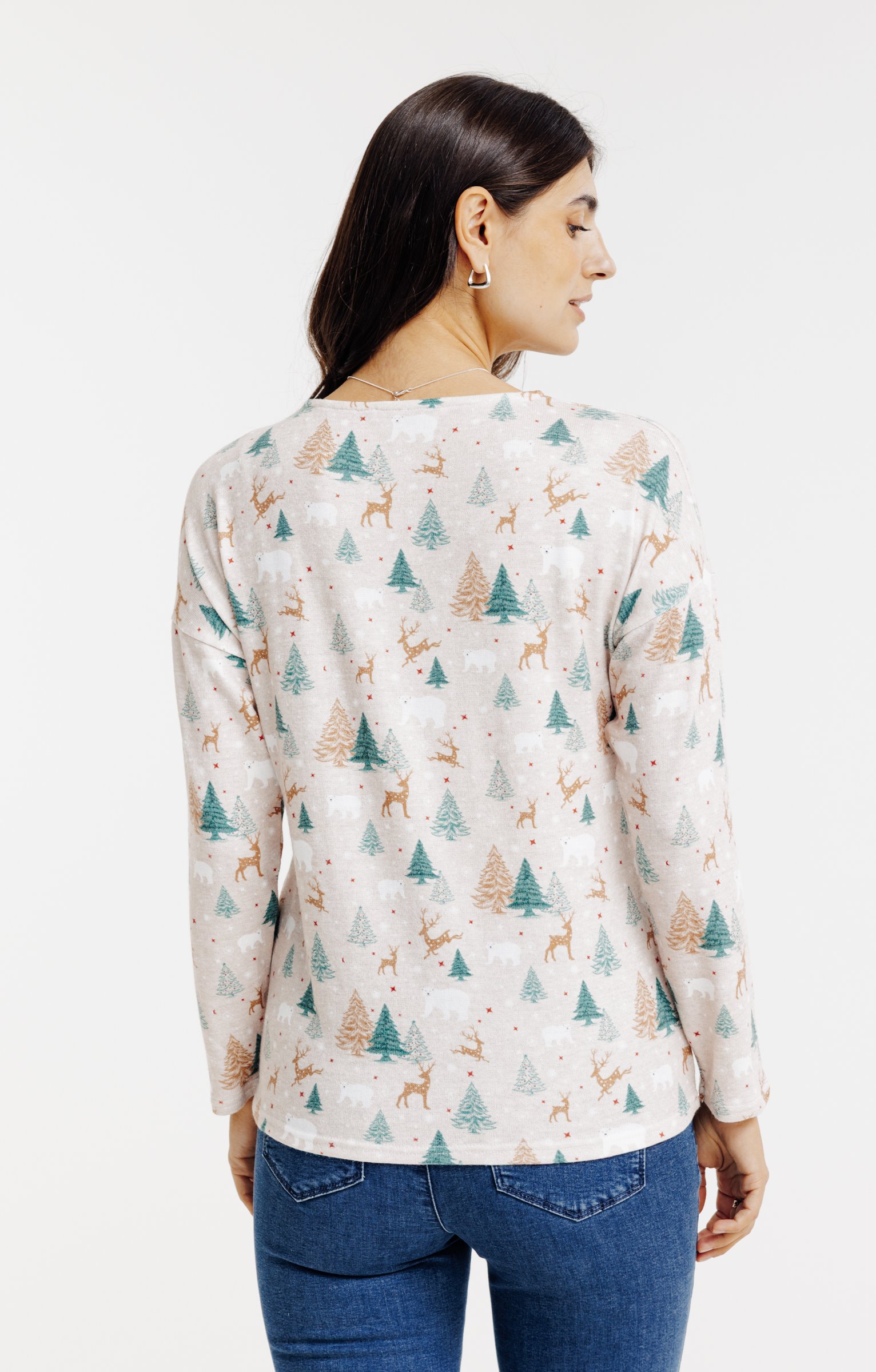 Entrez dans l'ambiance des fêtes avec ce t-shirt esprit Noël à manches longues imprimé hivernal multicolore. Coupe droite. Manches longues montées sur emmanchures tombantes. Décolleté rond. Imprimé à motifs sapins, rennes, étoiles et ours polaires multicolores. Maille jersey extensible. Finitions droites ourlées.