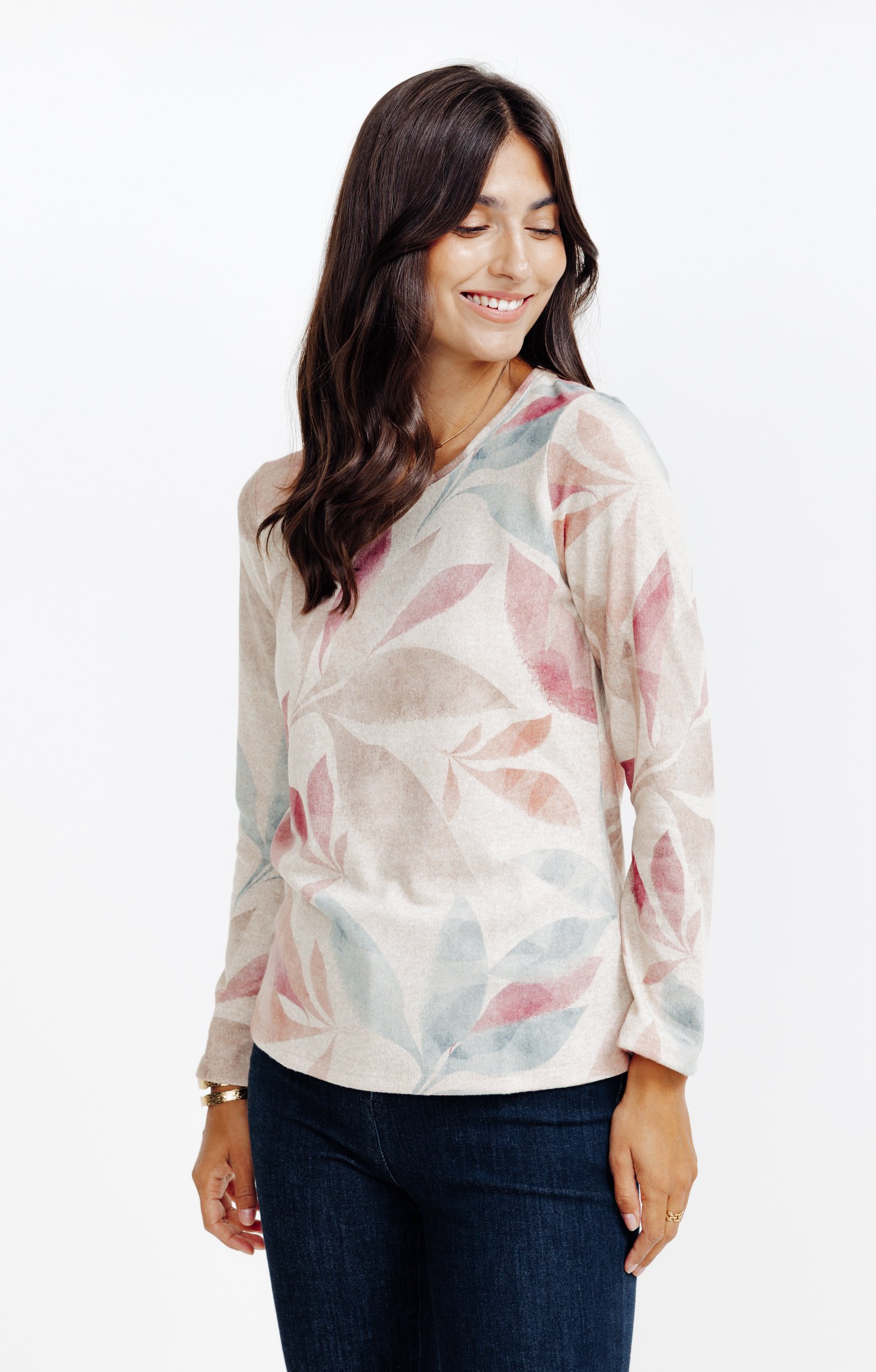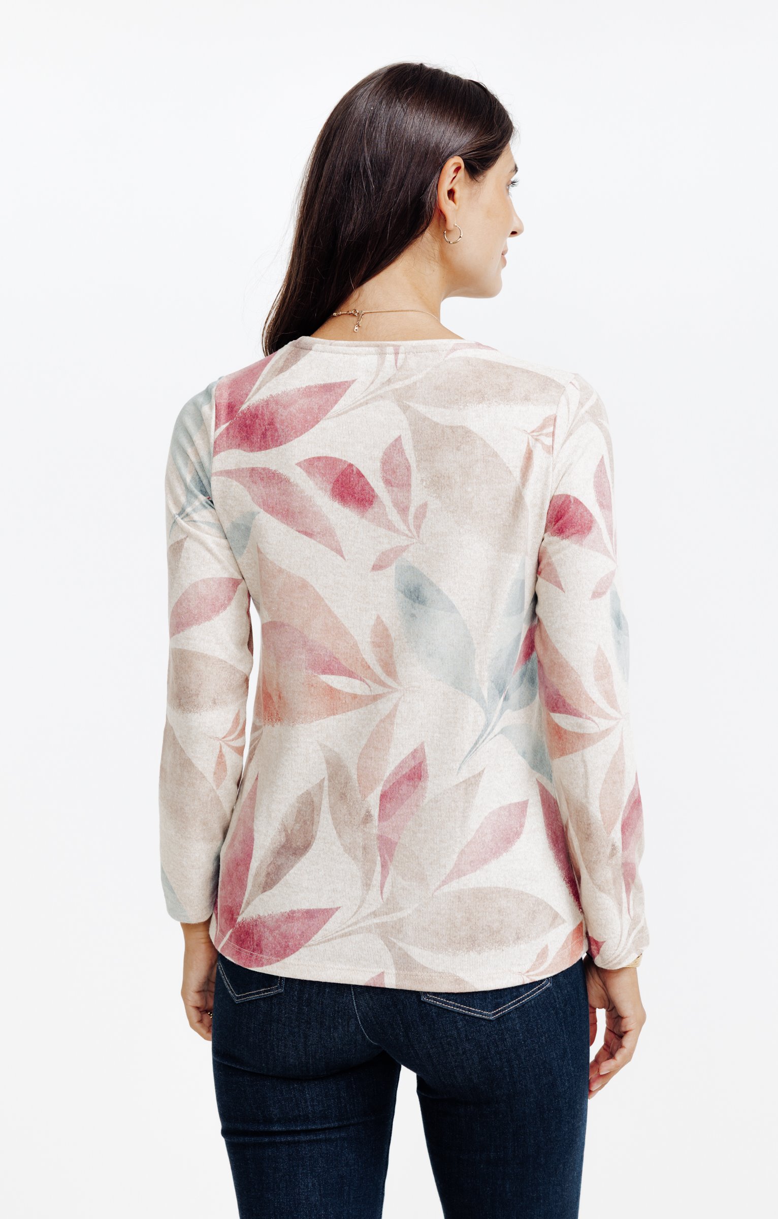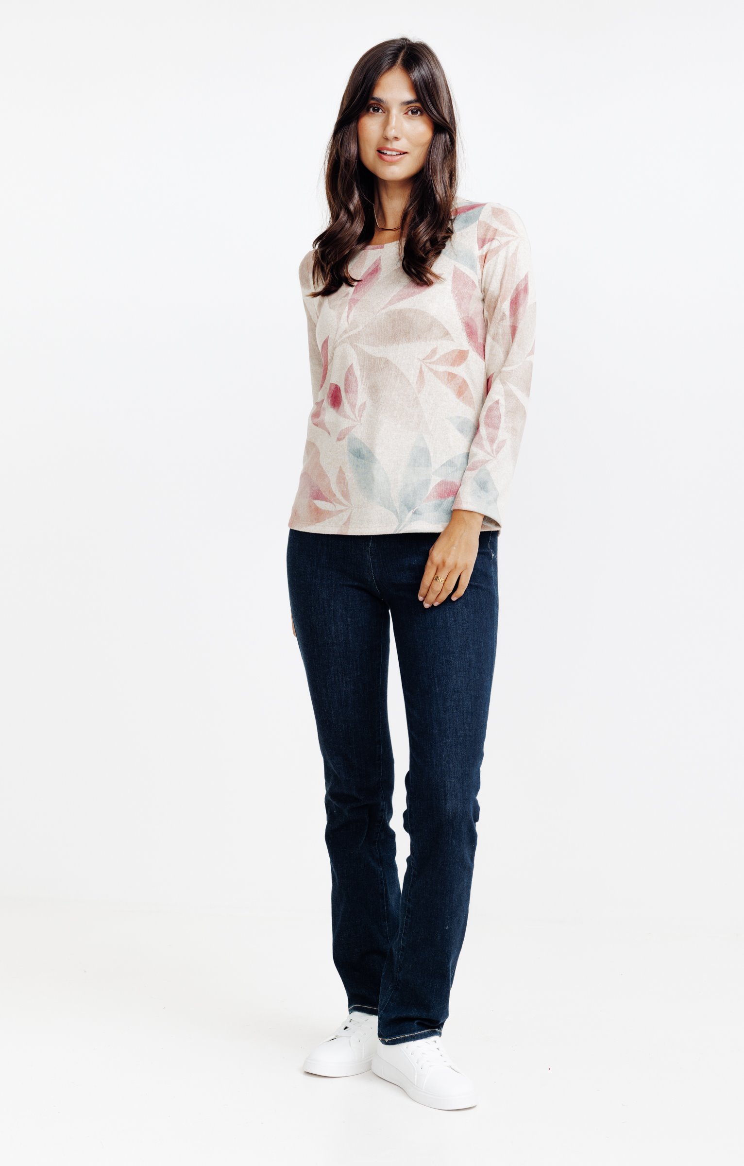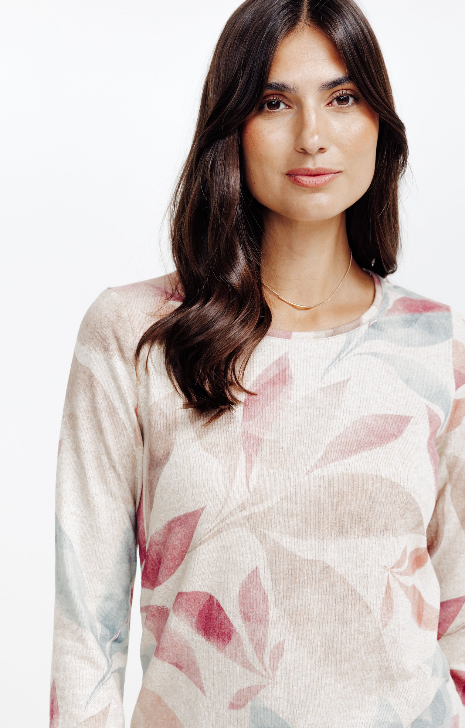 T-shirt à manches longues imprimé à motif végétal. Coupe droite. Col rond. Longueur standard. Motif multicolore à larges feuilles contrastées sur l’ensemble du modèle. Matière extensible à texture légèrement chinée.