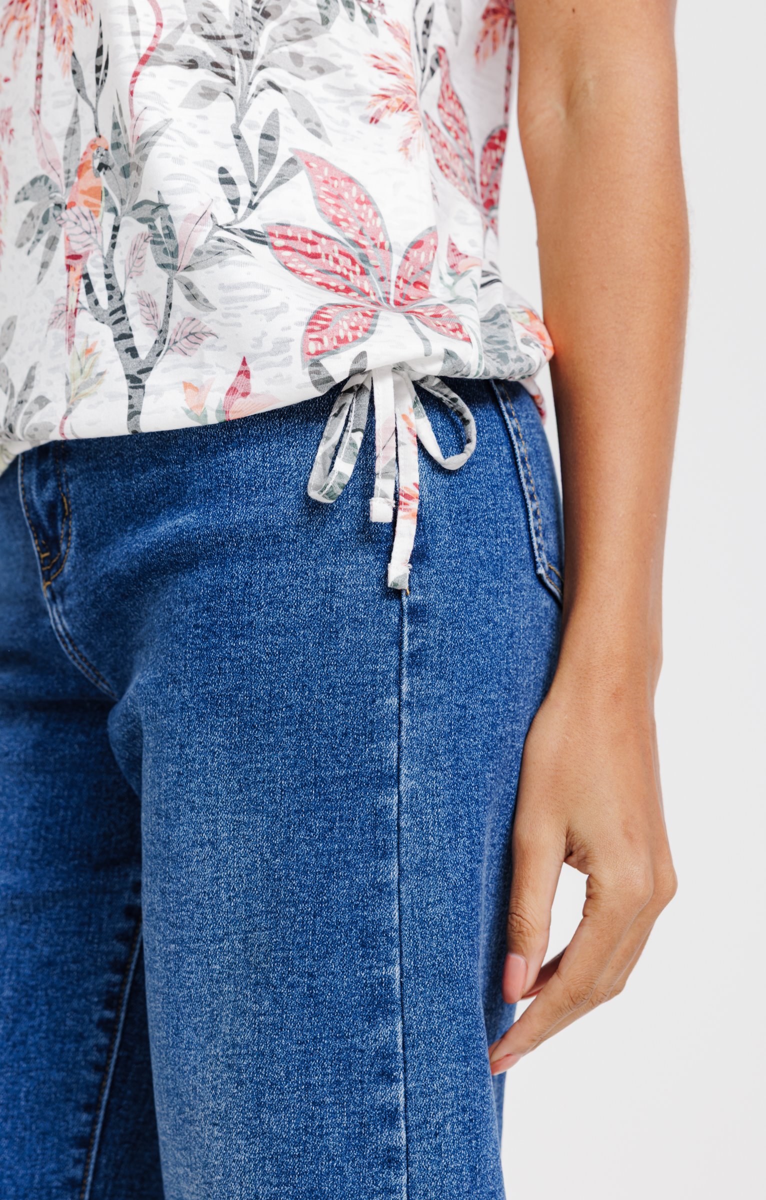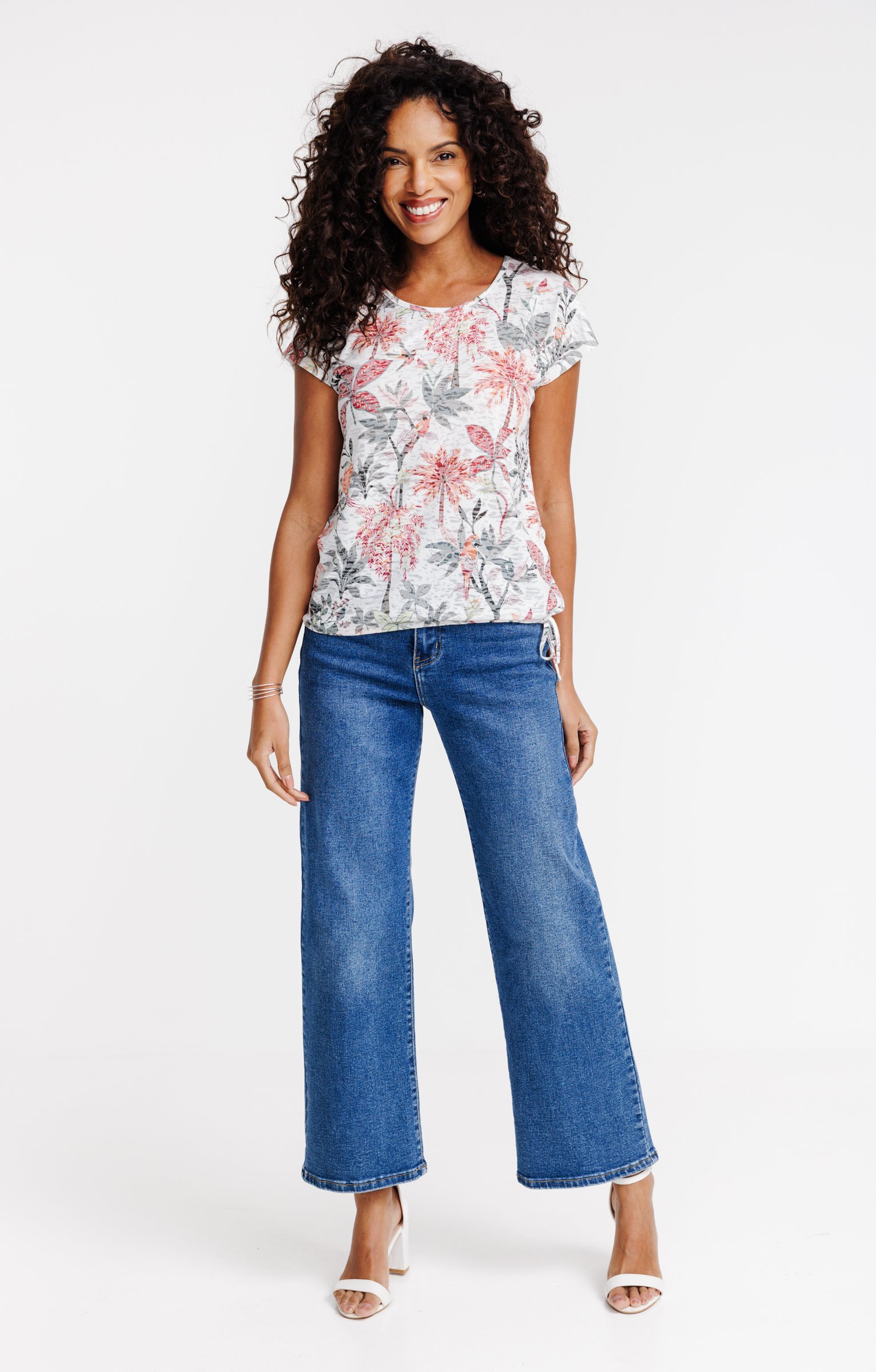 T-shirt à manches courtes avec col rond. Coupe droite resserée à la taille par une nouette sur le côté gauche. Imprimé floral sur l'ensemble. Longueur standard. Tissu léger avec texture légèrement striée.