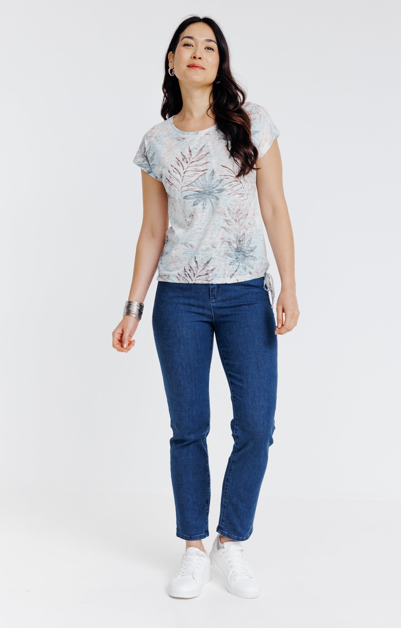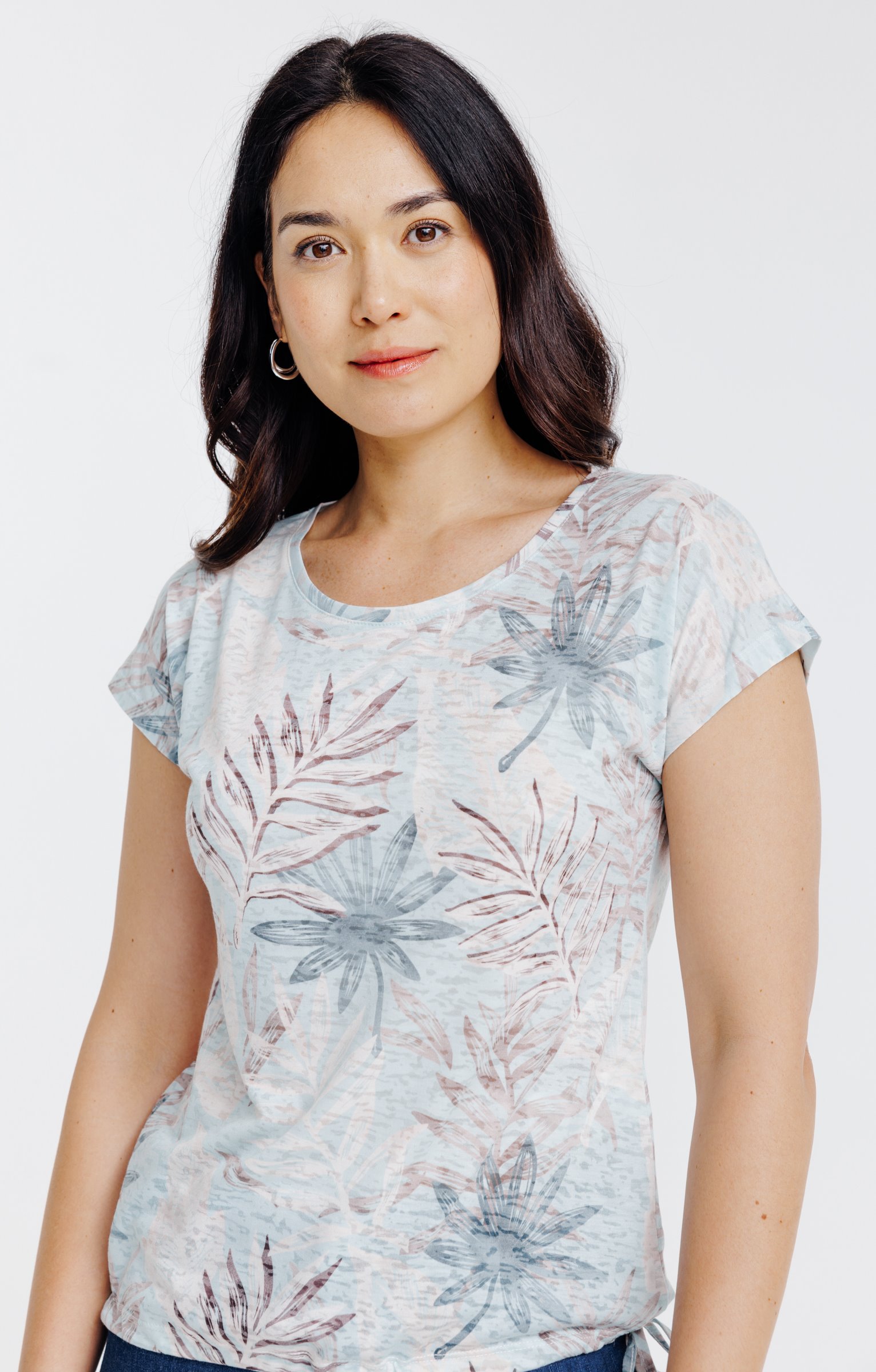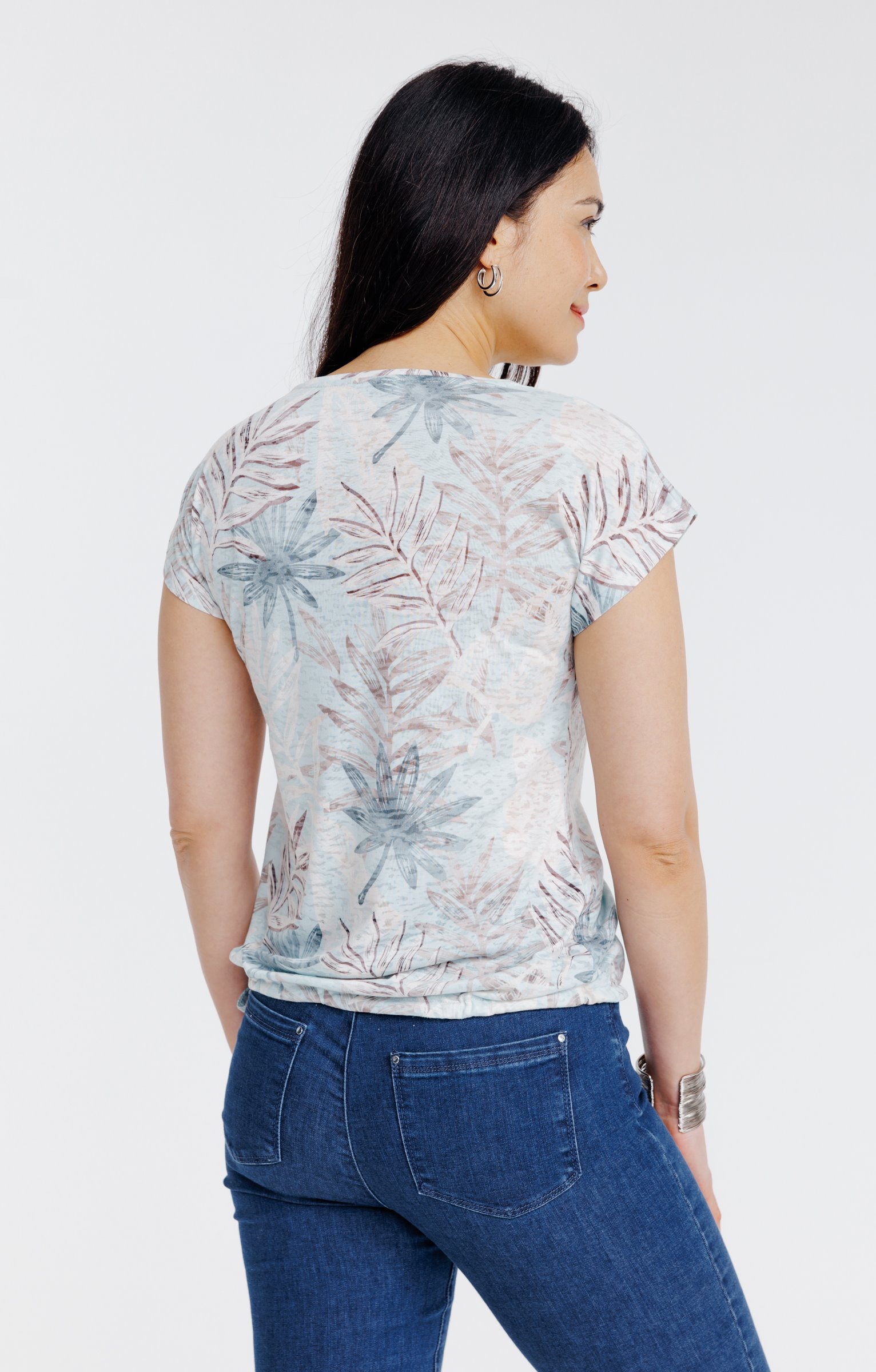 T-shirt avec liens à nouer imprimé palmiers à manches courtes et col rond. Coupe droite. Manches courtes. Col rond avec parementure visible. Imprimé palmier. Tissu en maille fine aspect dévoré. Liens à nouer sur le côté à la base. Fines surpiqûres discrètes en finition du modèle. Base droite.